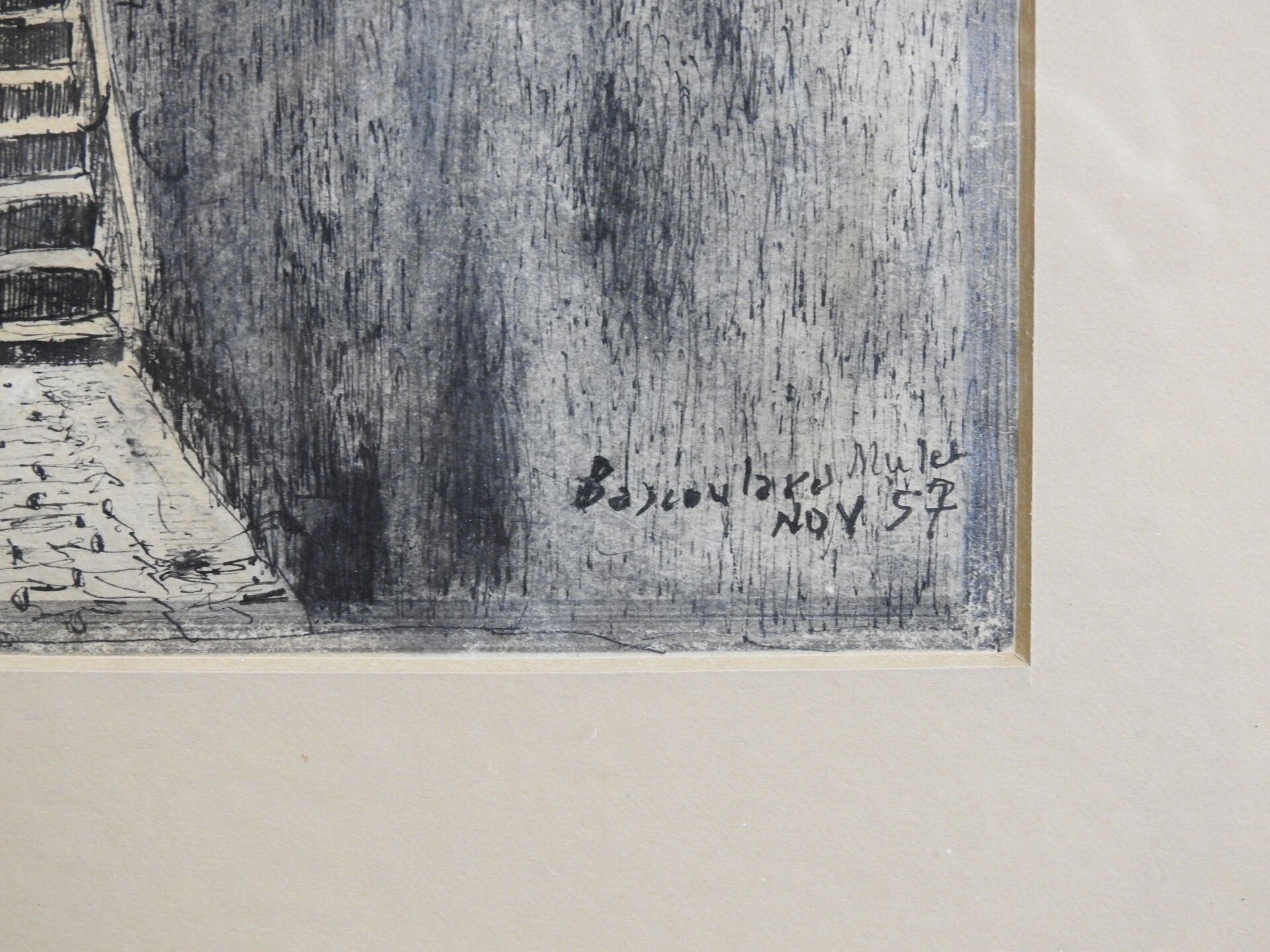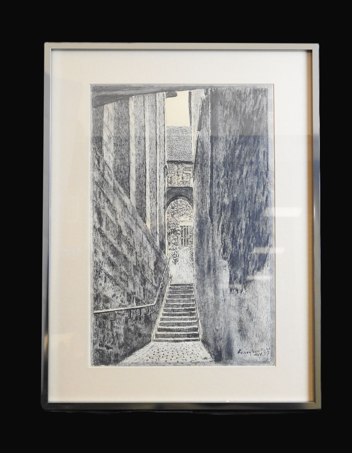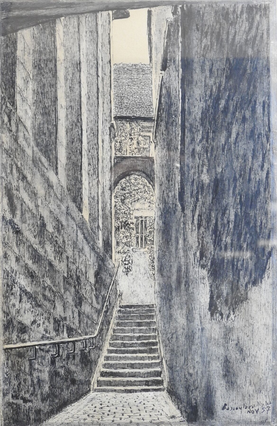 Marcel BASCOULARD (1913-1978) : le passage casse-cou à Bourges. Encre et lavis. Signé Bascoulard mulet et daté novembre 57. 31 x 20 cm. Dim (cadre Nielsen) 40 x 30 cm.