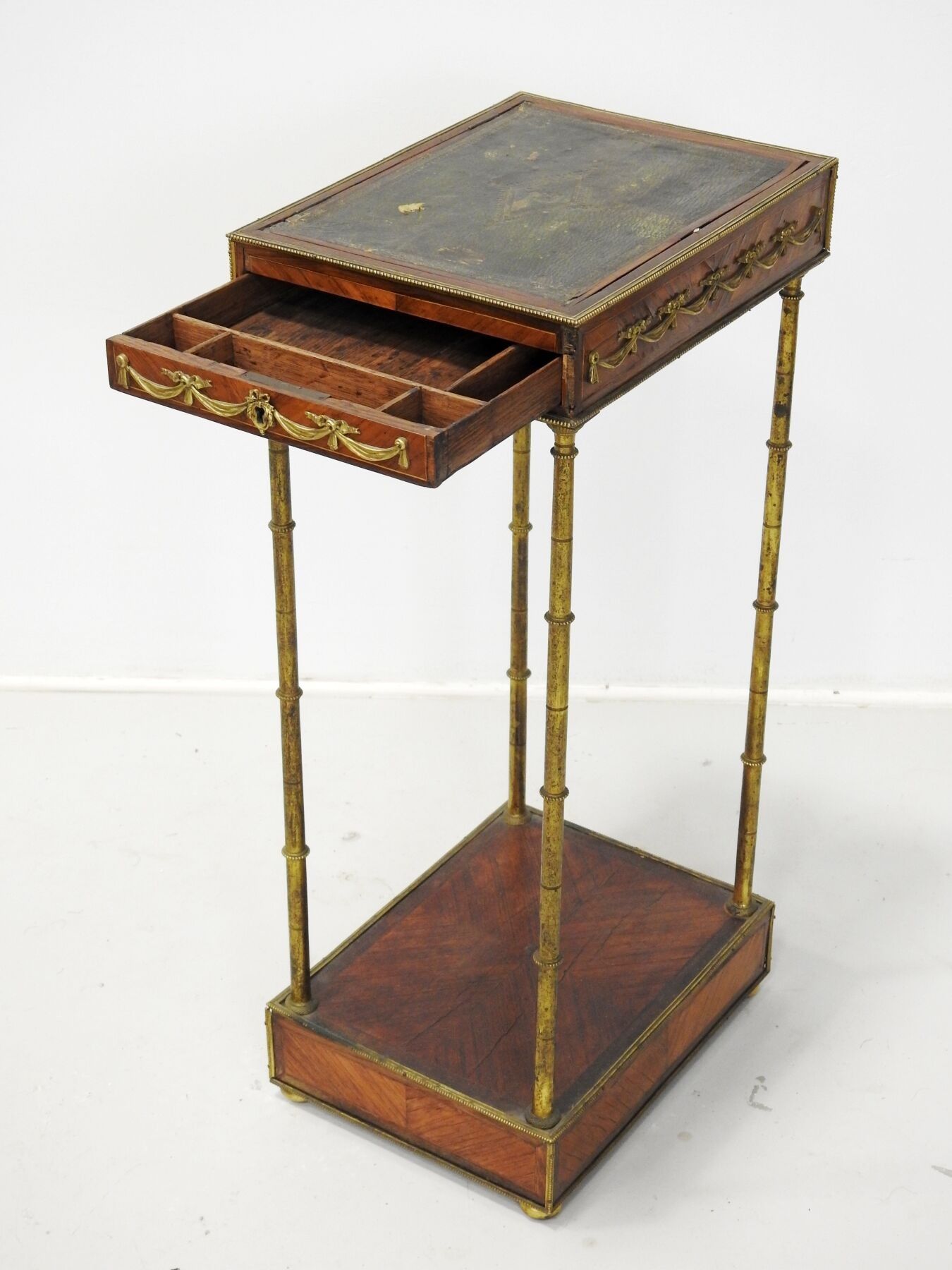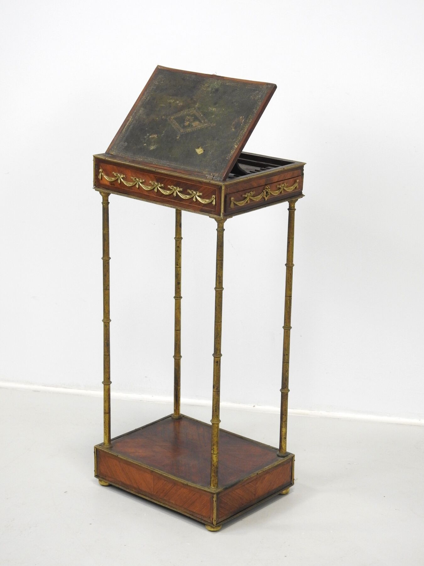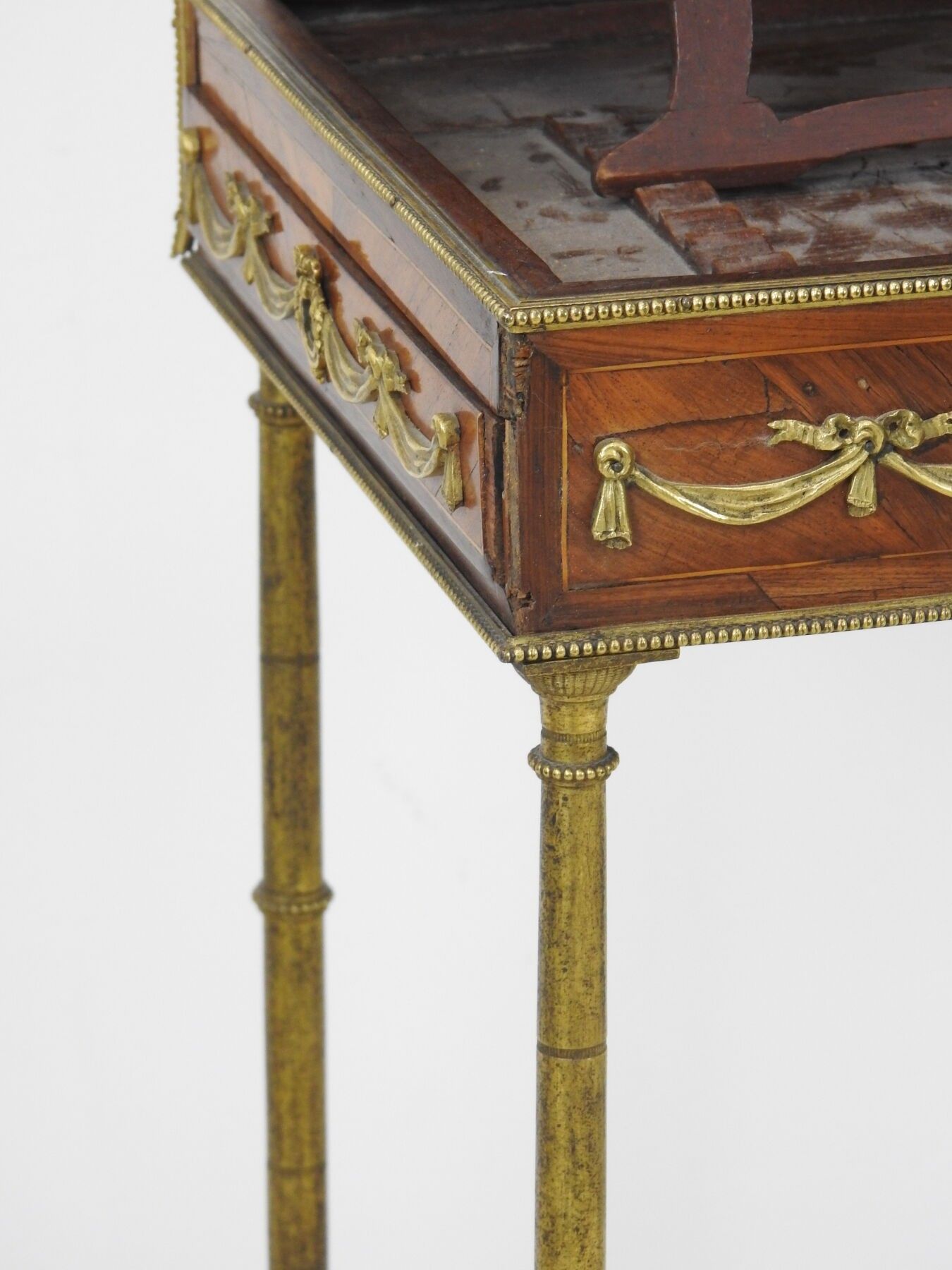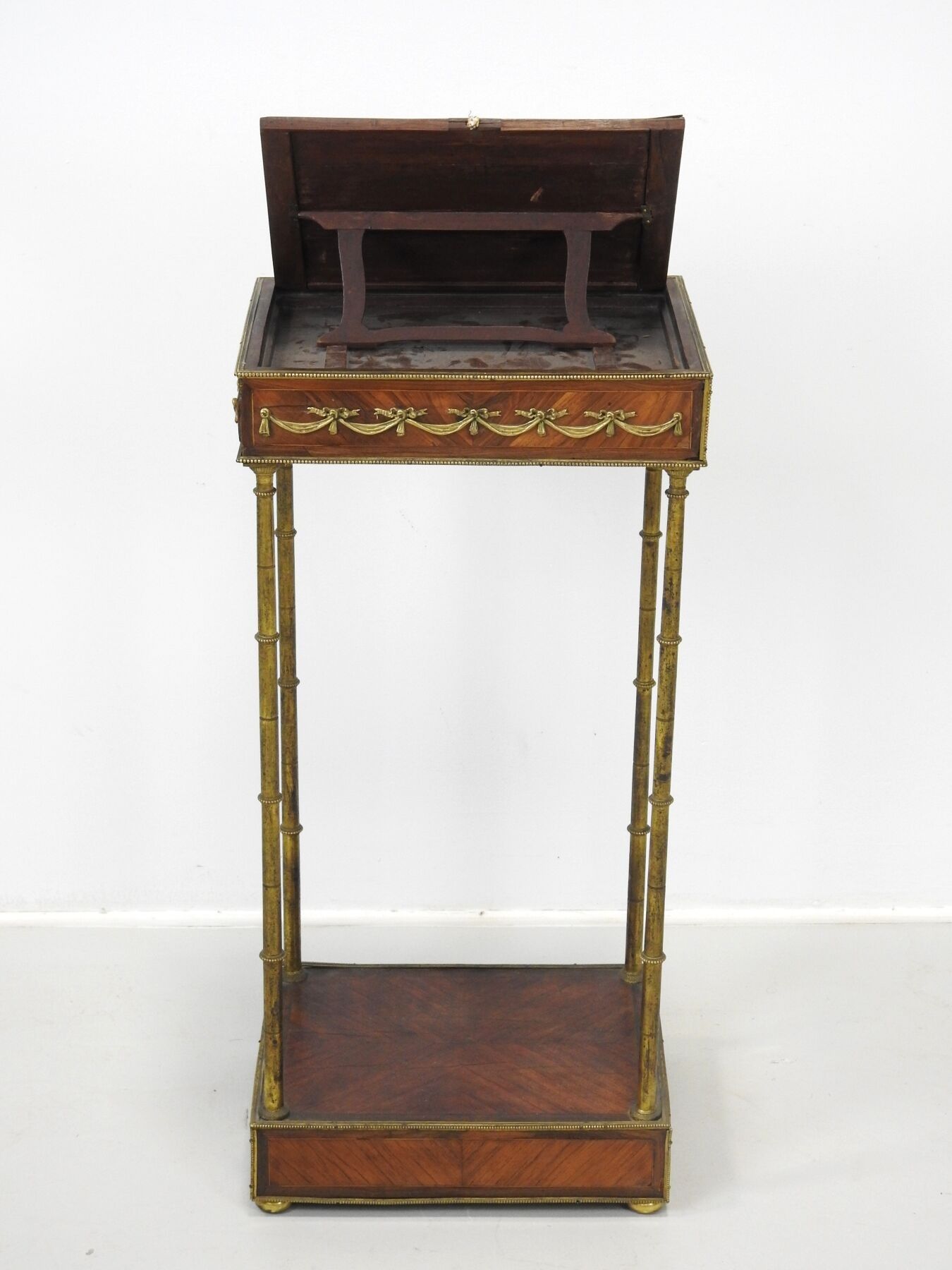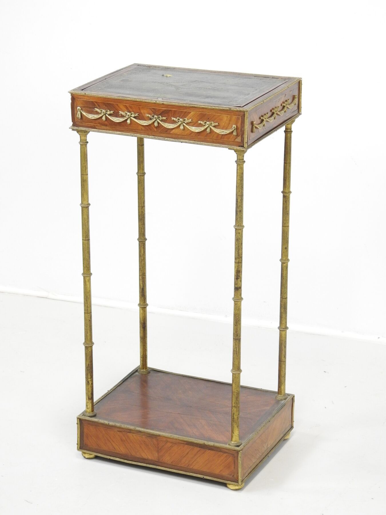 TABLE DE SALON formant liseuse en placage de bois de rose marqueté, le plateau gainé de cuir vert doré aux petits fers découvre un pupitre, la ceinture à décor d'une guirlande de draperie en bronze doré découvre un tiroir latérale, les montants à colonnes baguées en bronze doré terminées par une plinthe. Dans le gout d'Adam Weisweiler. Époque Fin du XVIIIème siècle, début du XIXème siècle. H: 70 - L: 33 - P: 25 cm (usures au cuir)