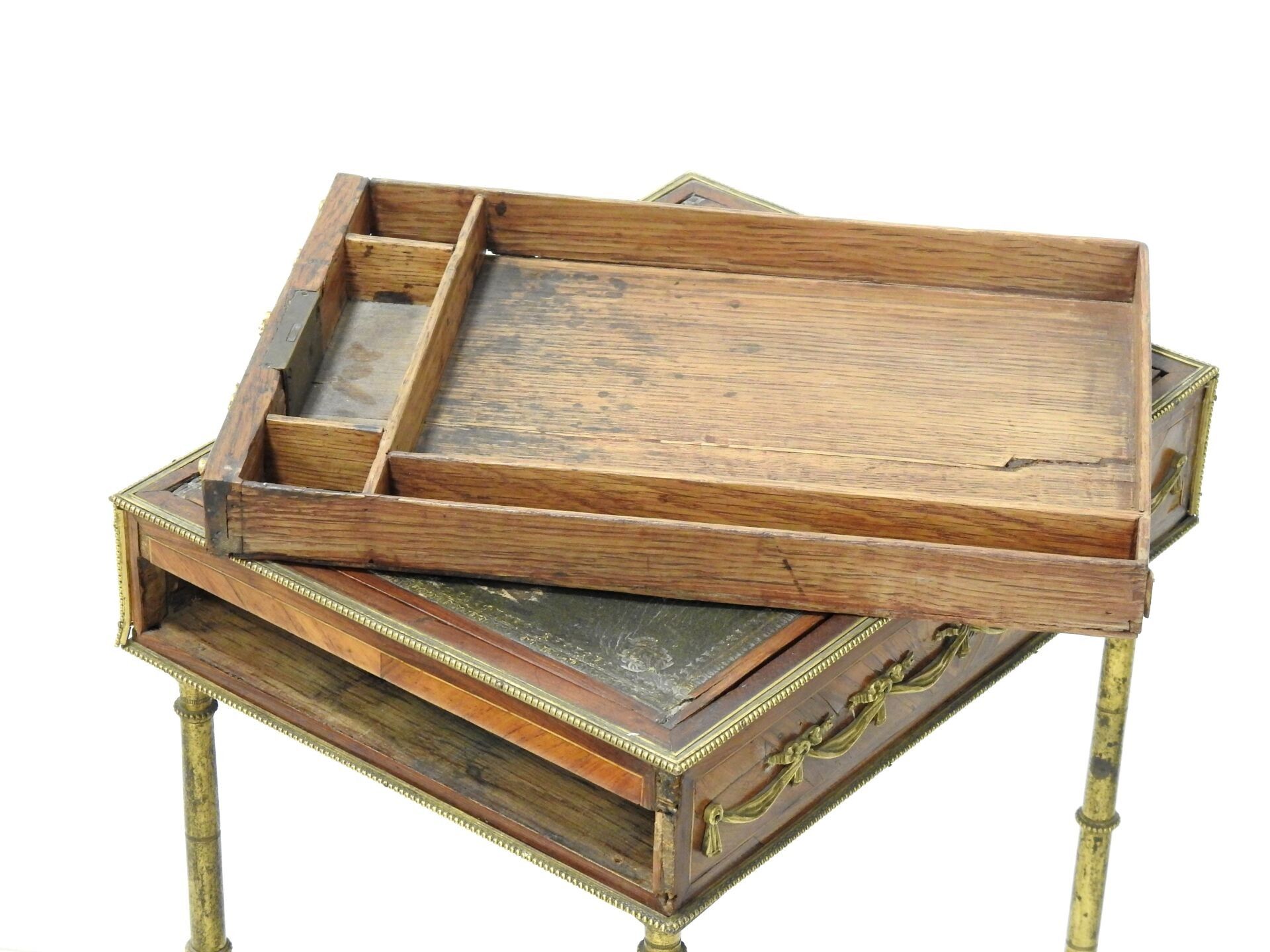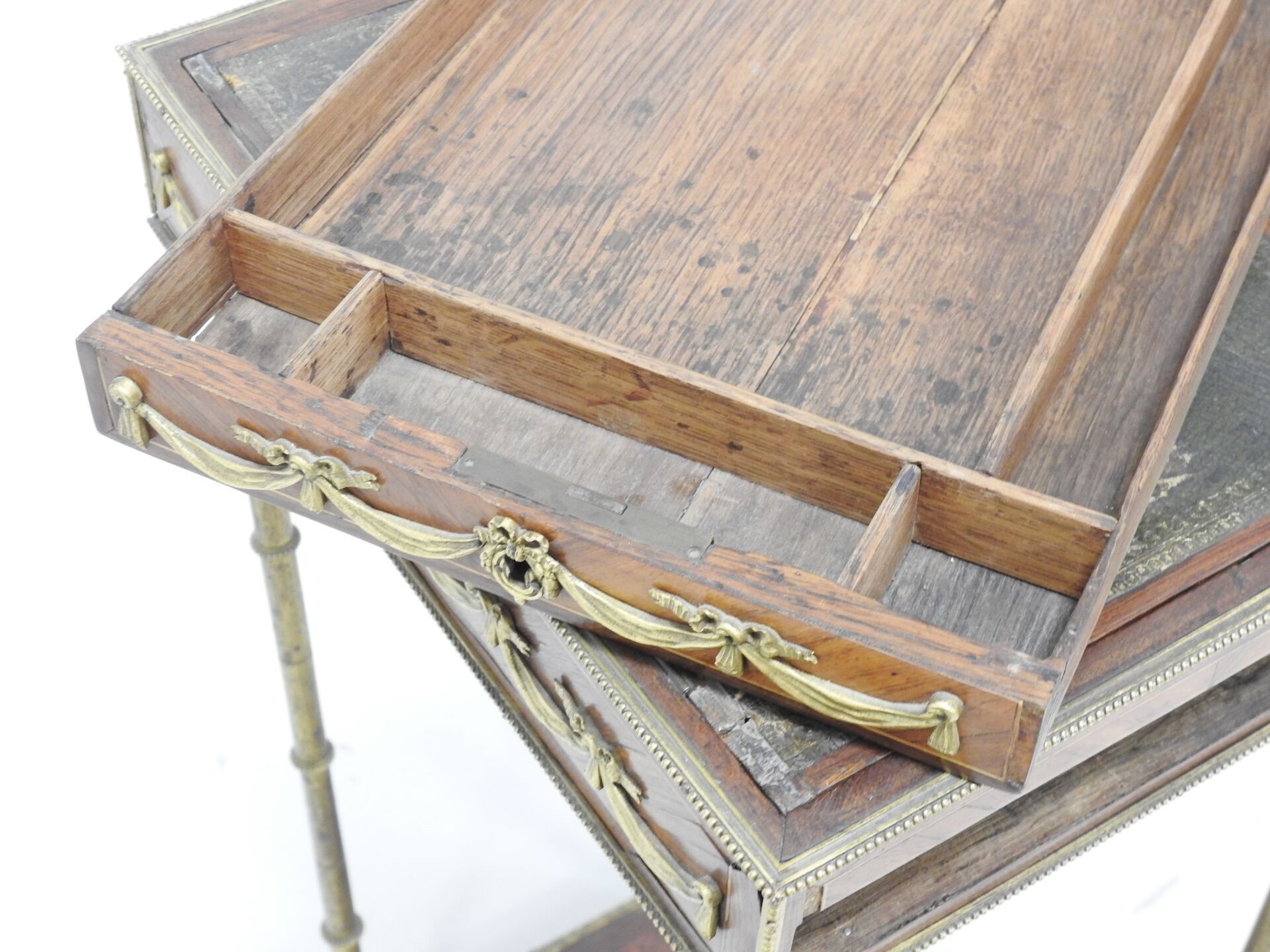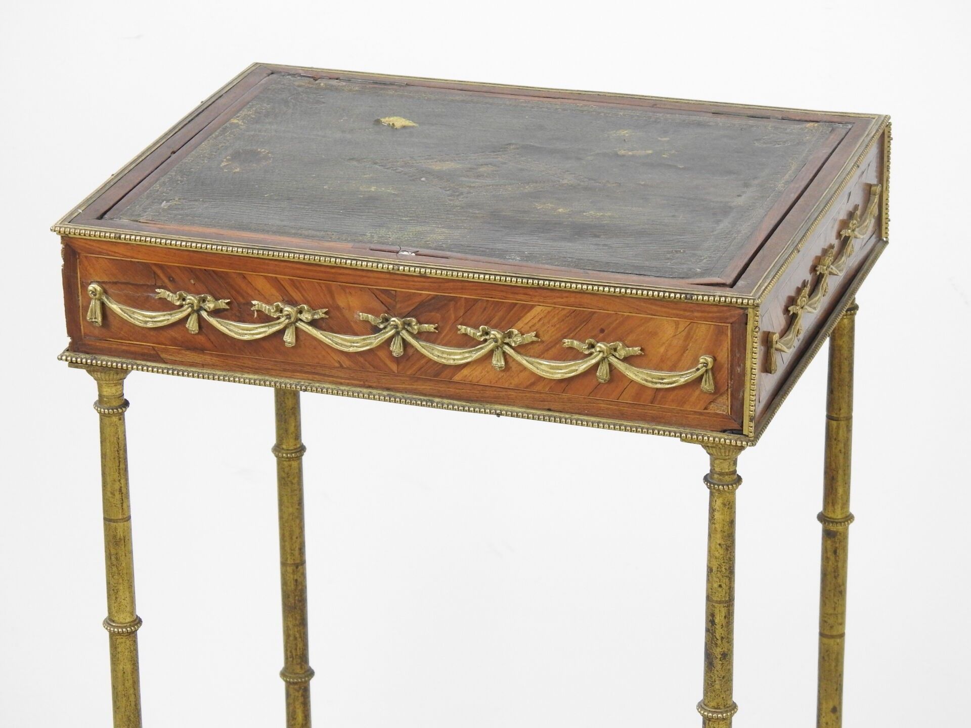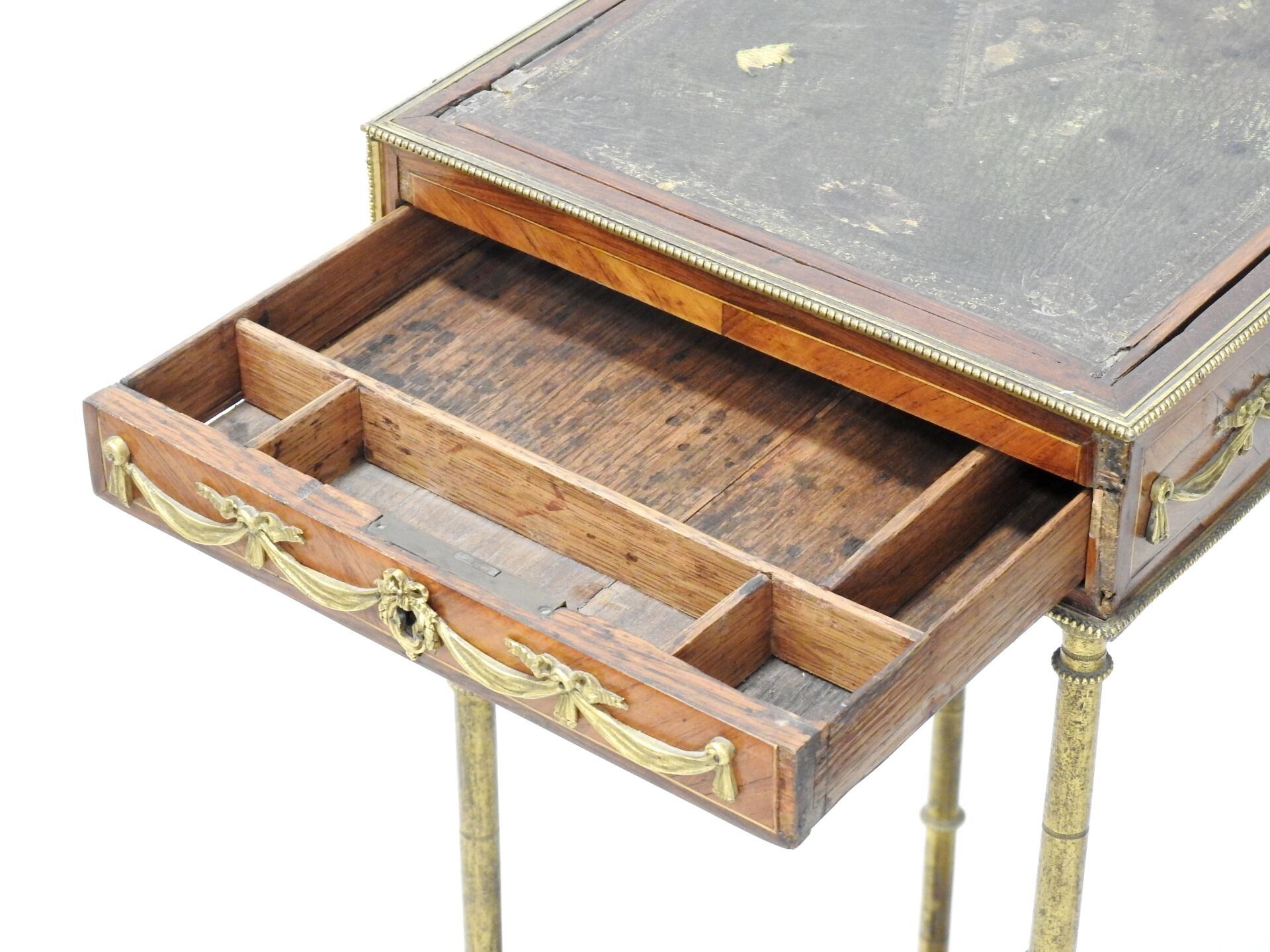 TABLE DE SALON formant liseuse en placage de bois de rose marqueté, le plateau gainé de cuir vert doré aux petits fers découvre un pupitre, la ceinture à décor d'une guirlande de draperie en bronze doré découvre un tiroir latérale, les montants à colonnes baguées en bronze doré terminées par une plinthe. Dans le gout d'Adam Weisweiler. Époque Fin du XVIIIème siècle, début du XIXème siècle. H: 70 - L: 33 - P: 25 cm (usures au cuir)