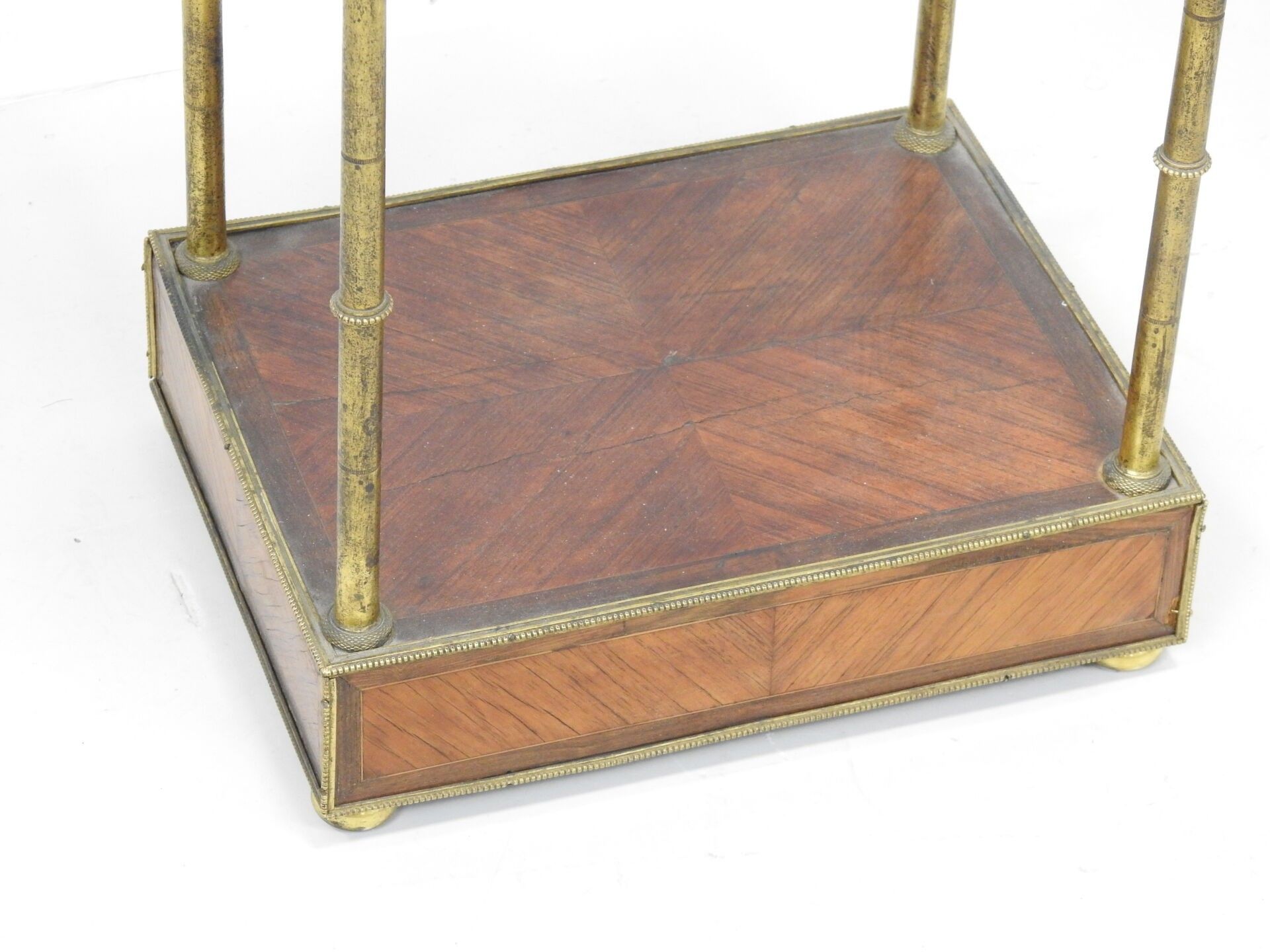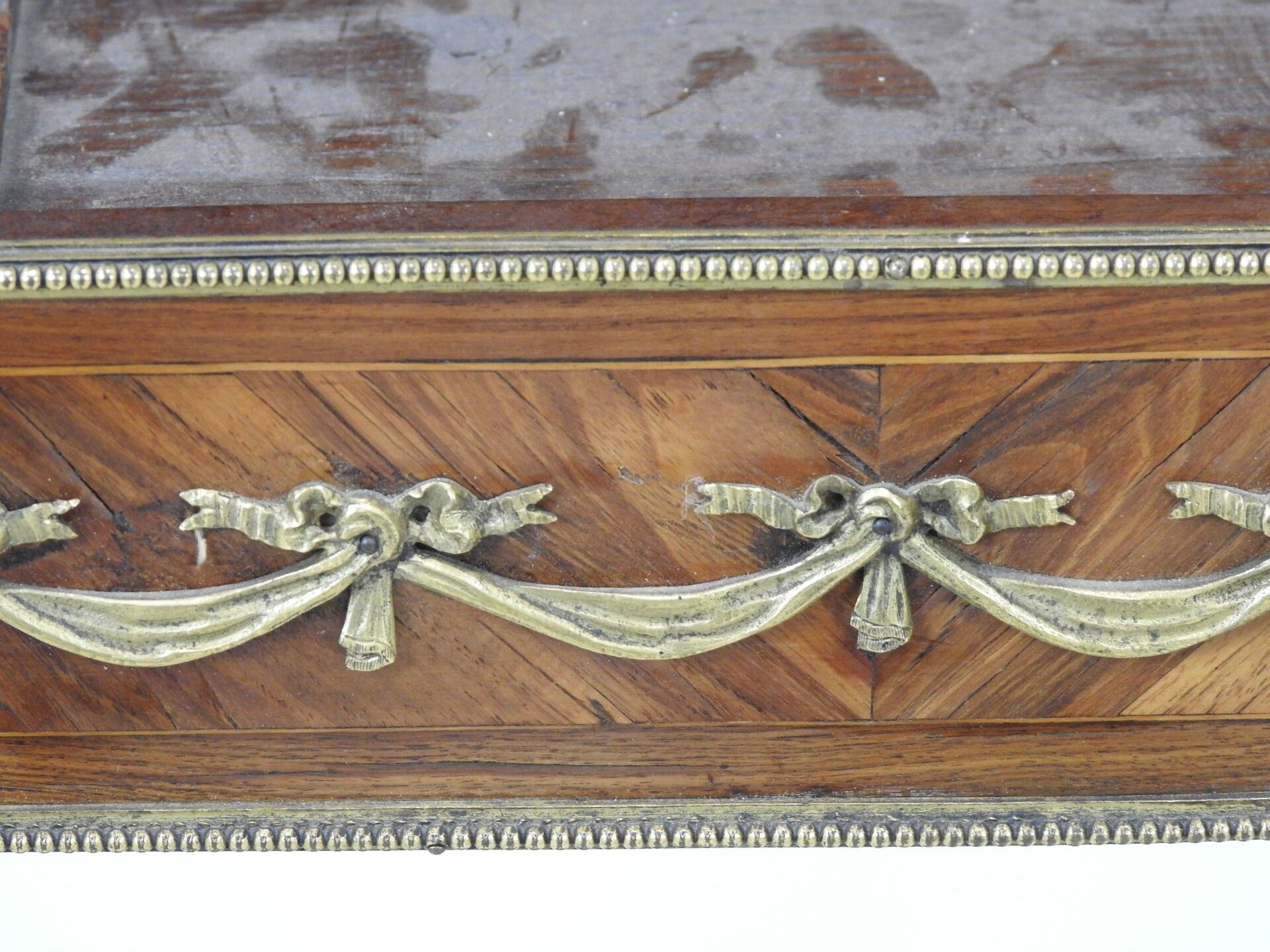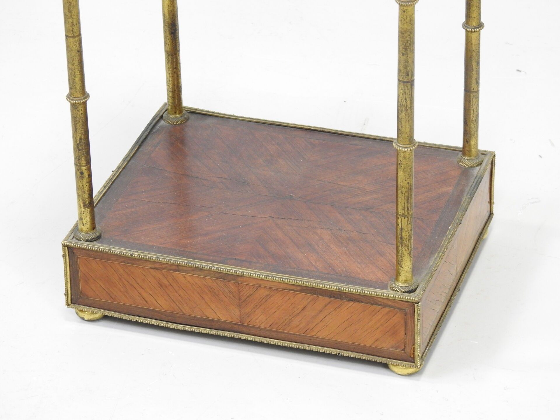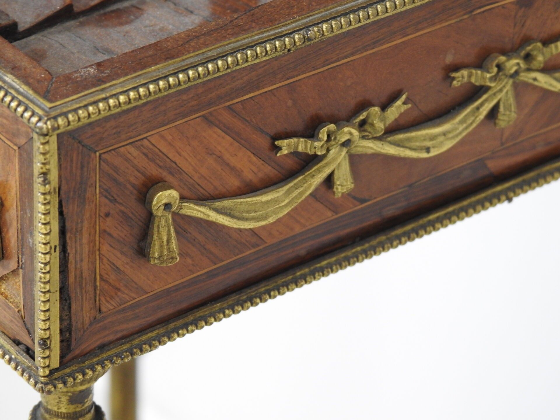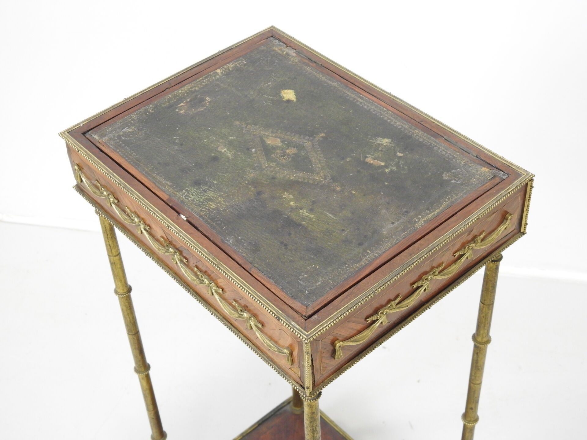 TABLE DE SALON formant liseuse en placage de bois de rose marqueté, le plateau gainé de cuir vert doré aux petits fers découvre un pupitre, la ceinture à décor d'une guirlande de draperie en bronze doré découvre un tiroir latérale, les montants à colonnes baguées en bronze doré terminées par une plinthe. Dans le gout d'Adam Weisweiler. Époque Fin du XVIIIème siècle, début du XIXème siècle. H: 70 - L: 33 - P: 25 cm (usures au cuir)