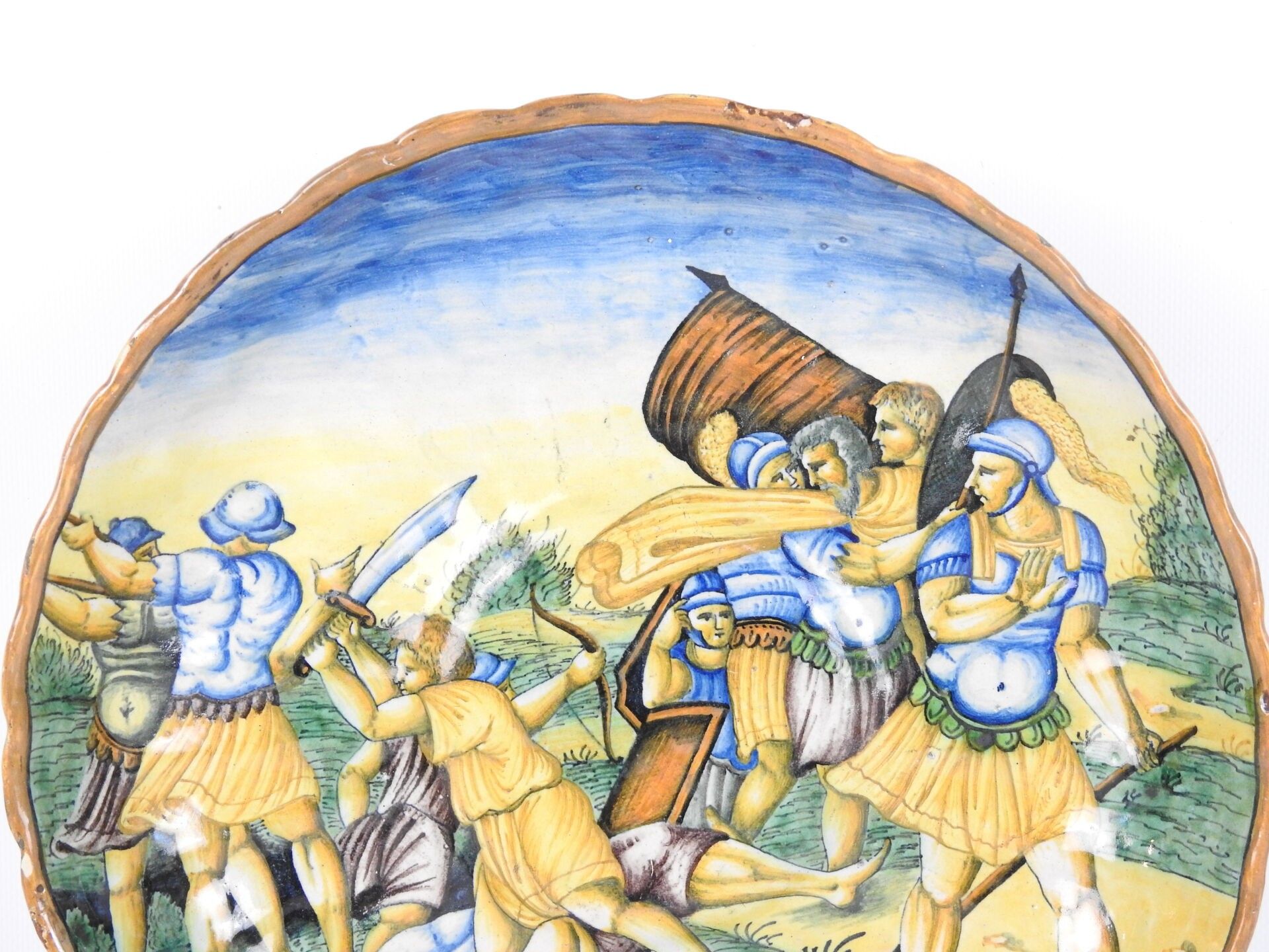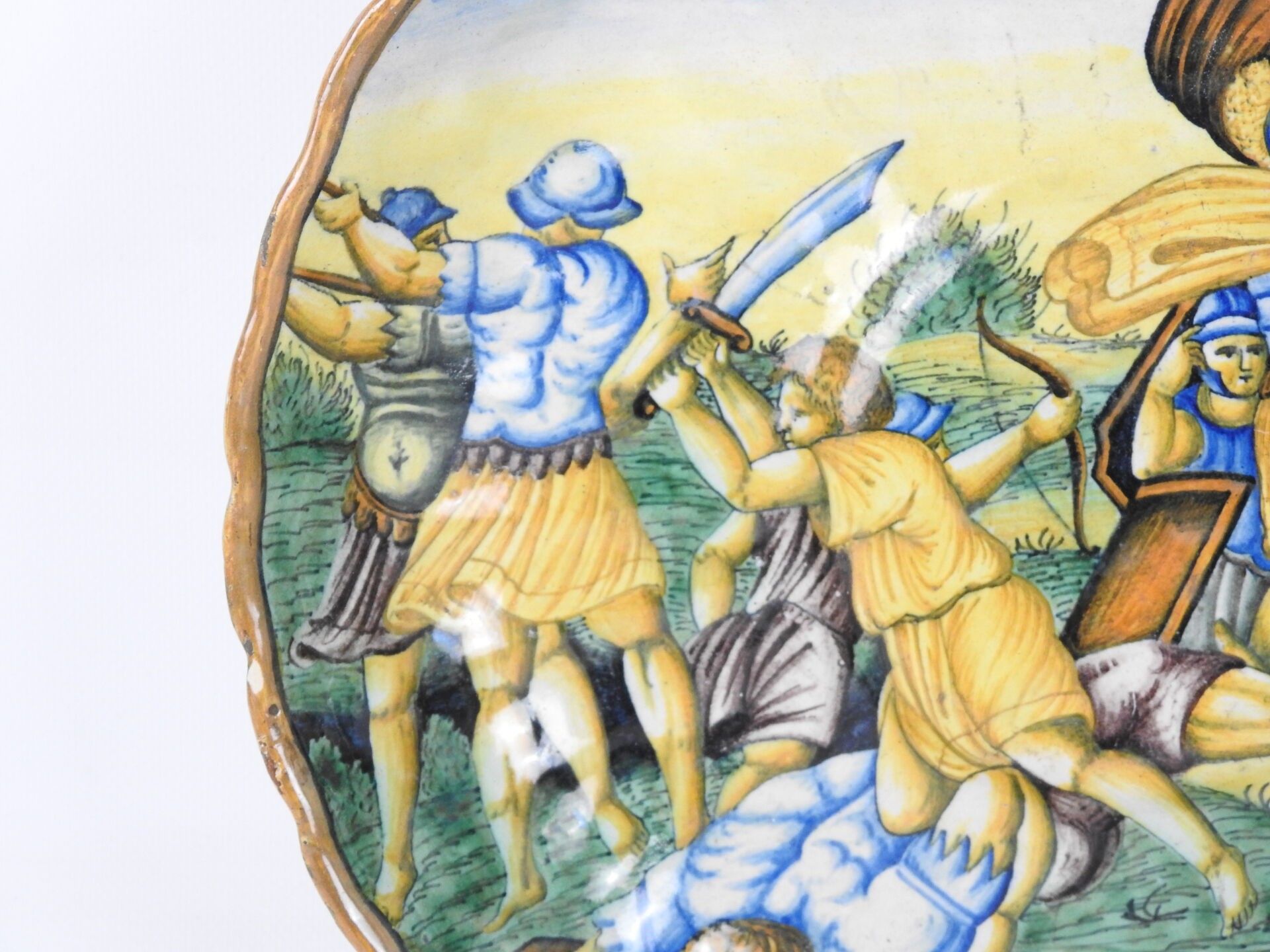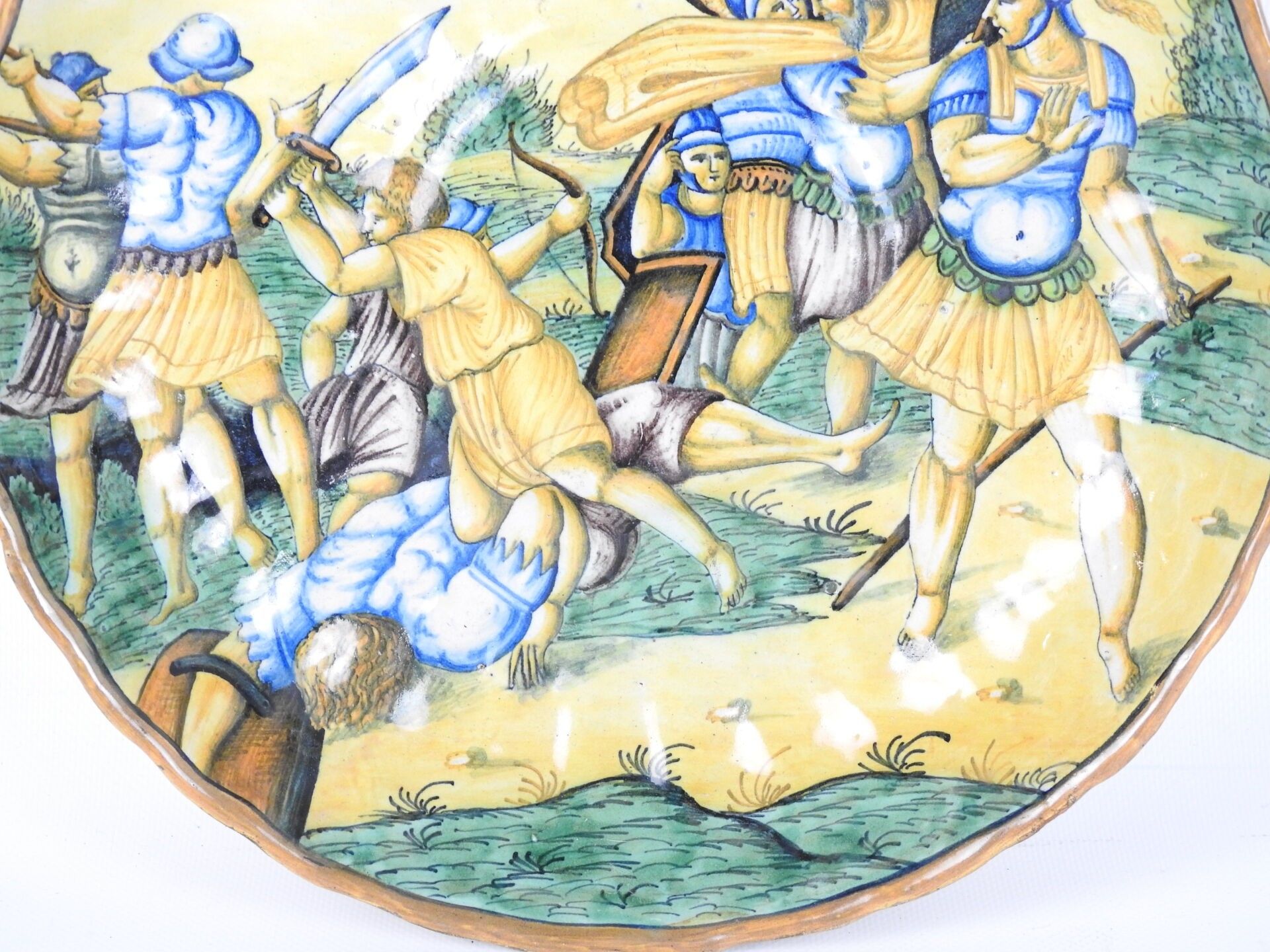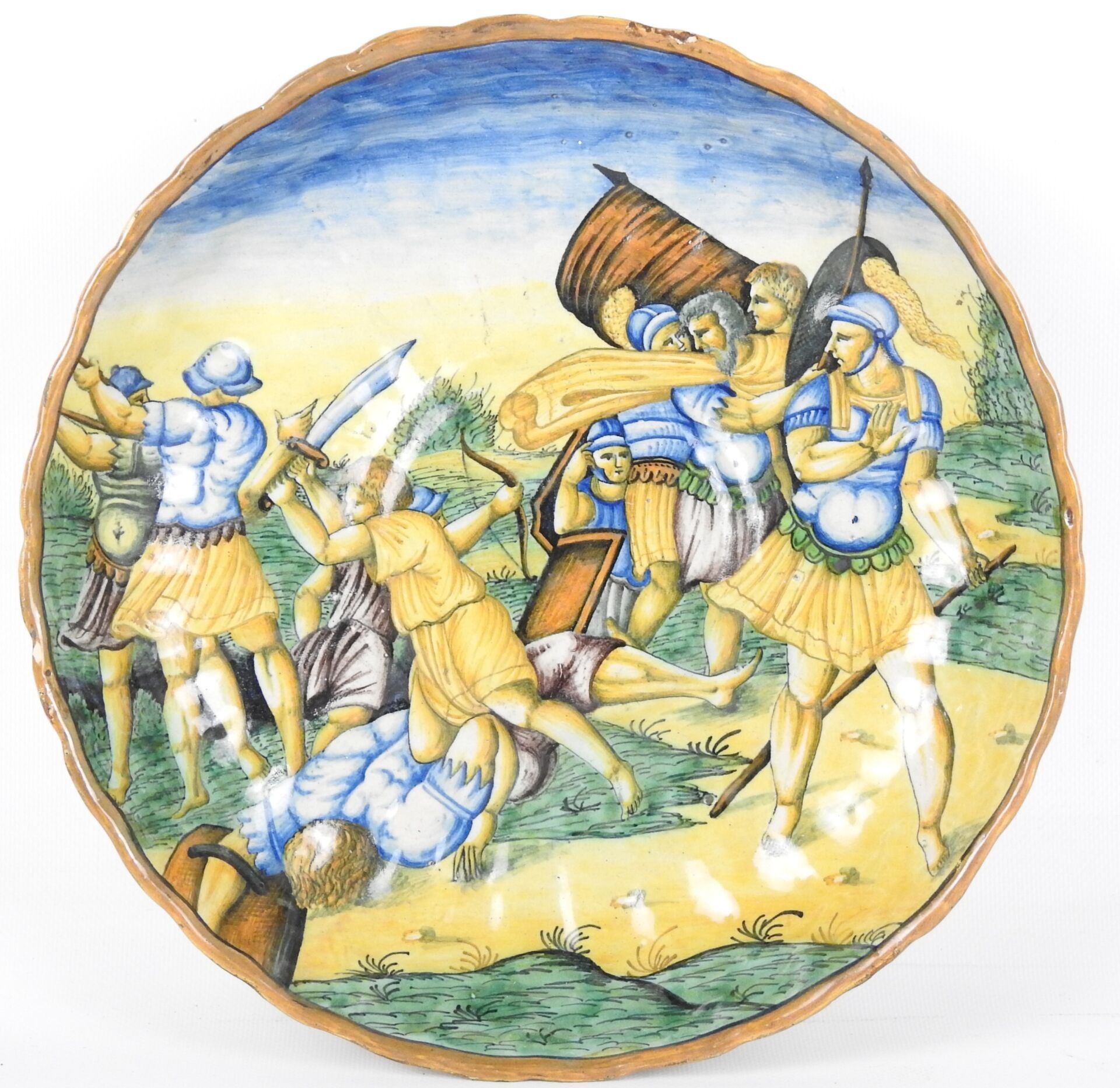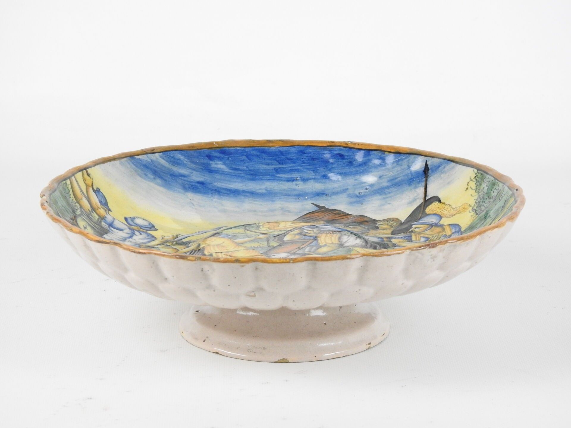 GRANDE COUPE sur piédouche à bords godronnés en majolique dans le gout de la Renaissance à décor d'une scène de combat.