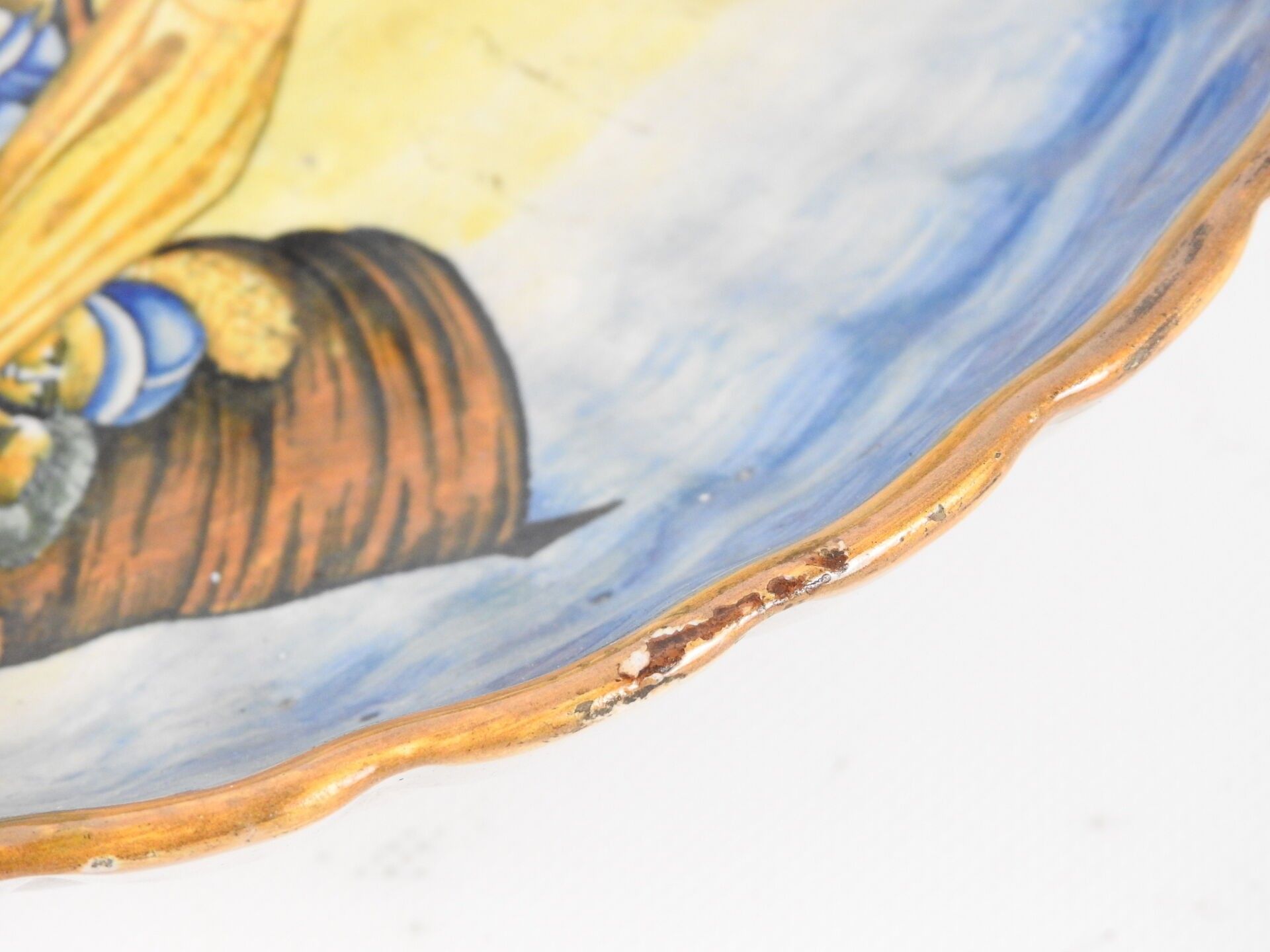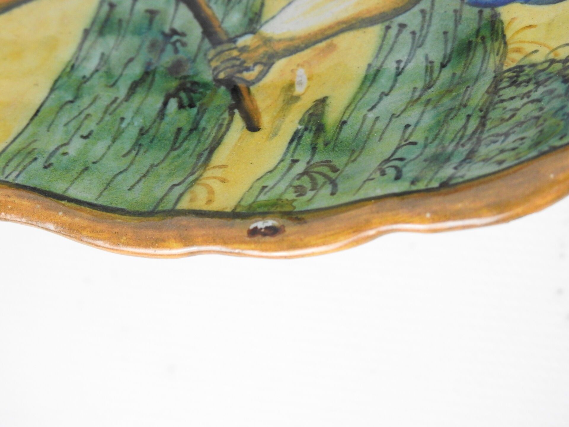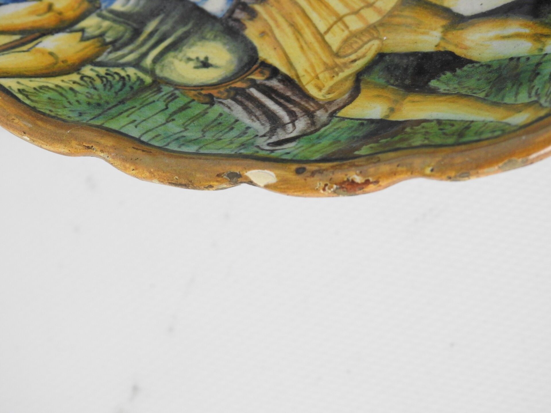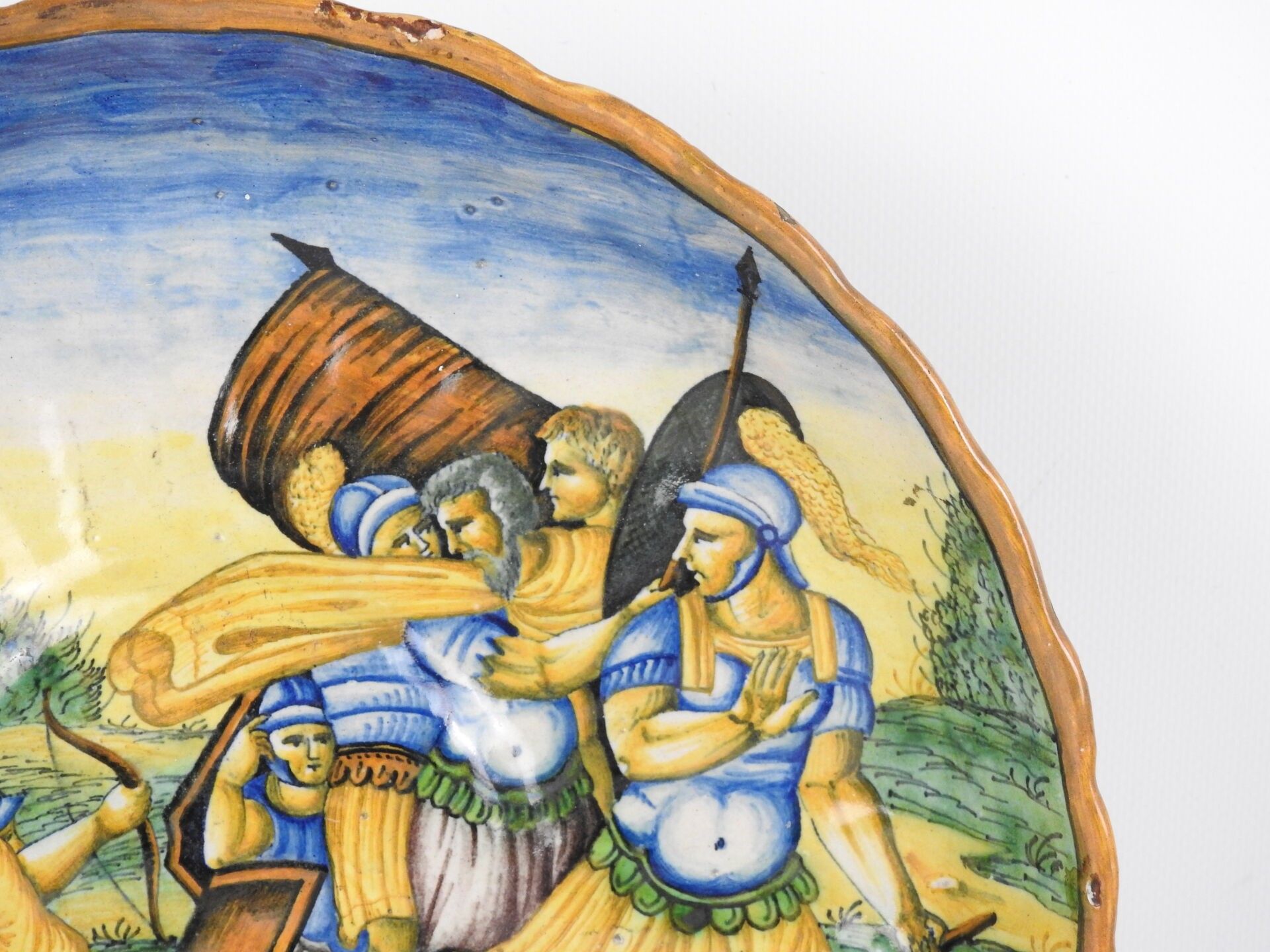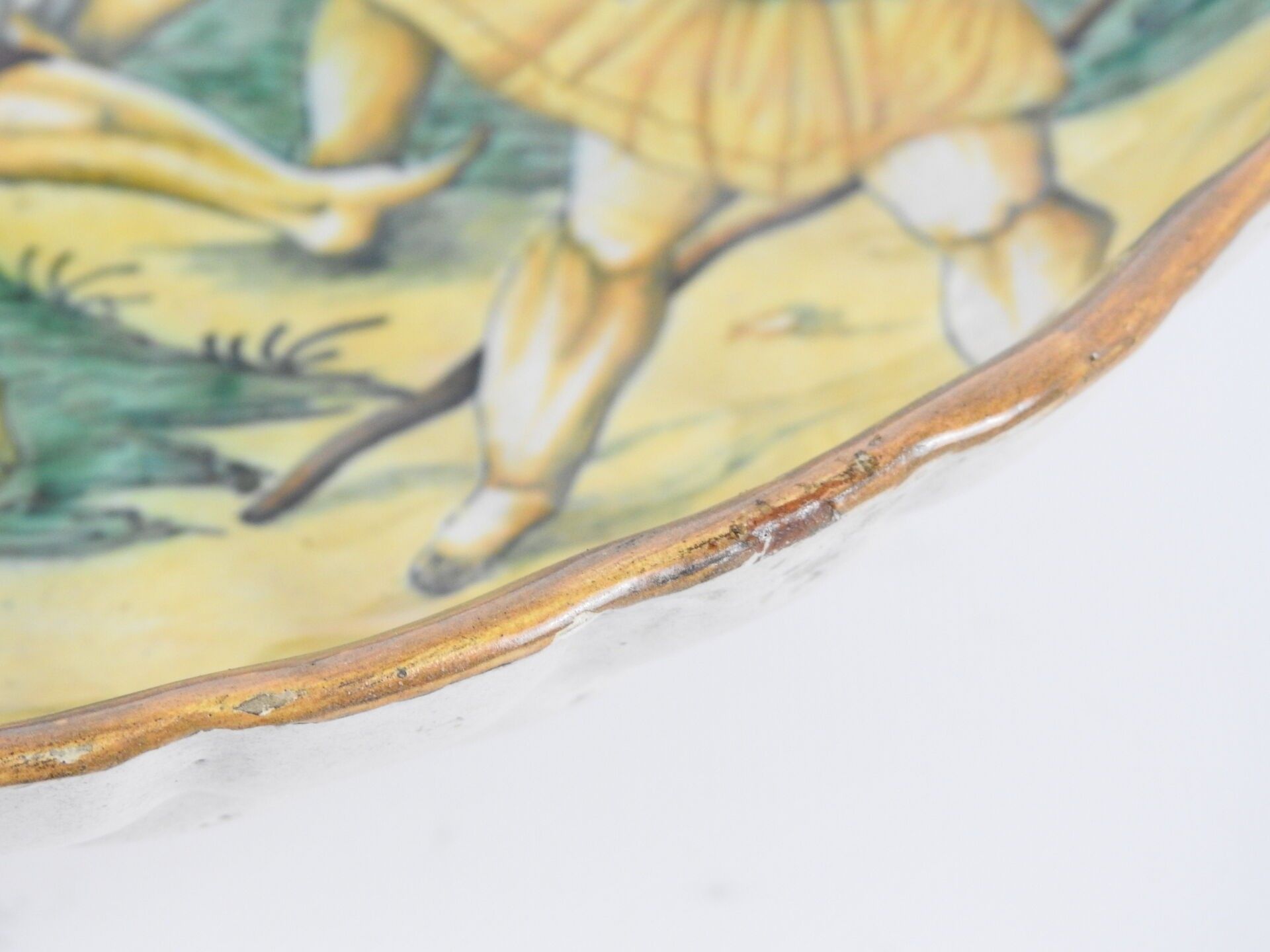 GRANDE COUPE sur piédouche à bords godronnés en majolique dans le gout de la Renaissance à décor d'une scène de combat.
