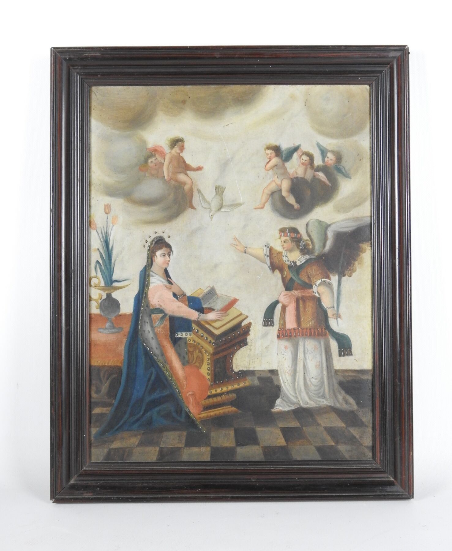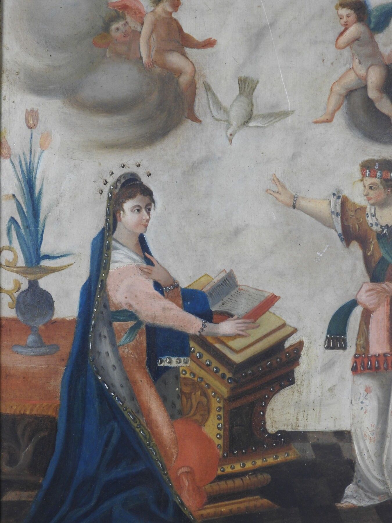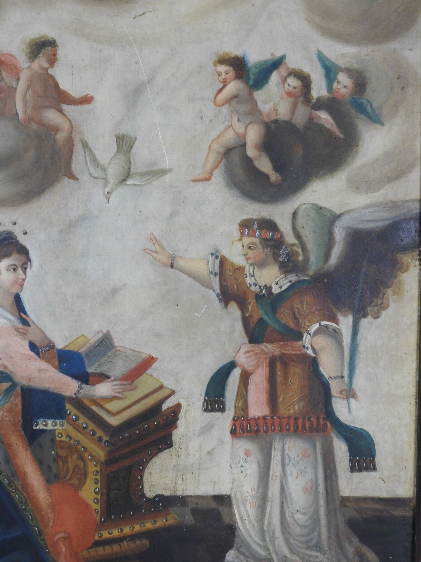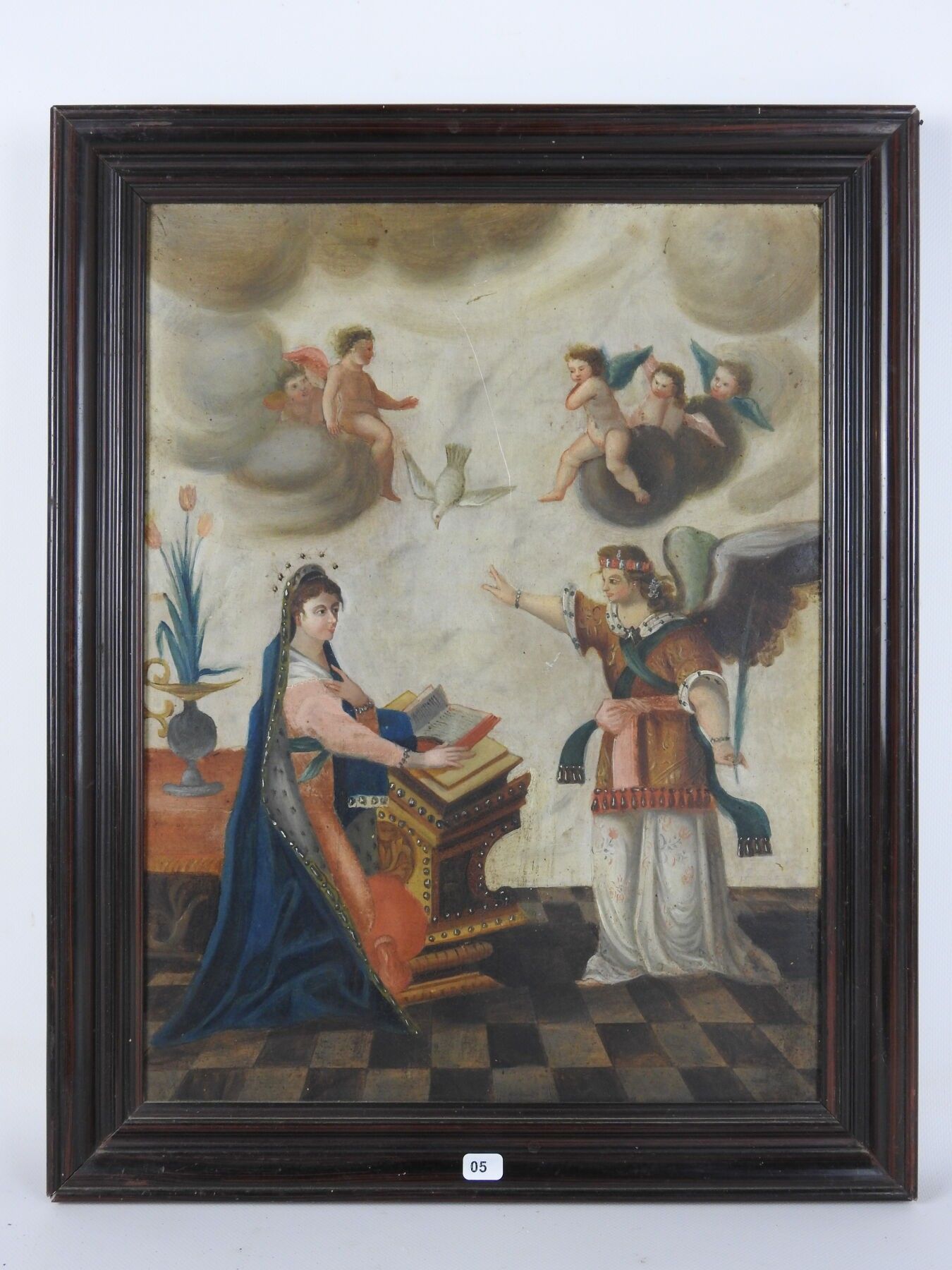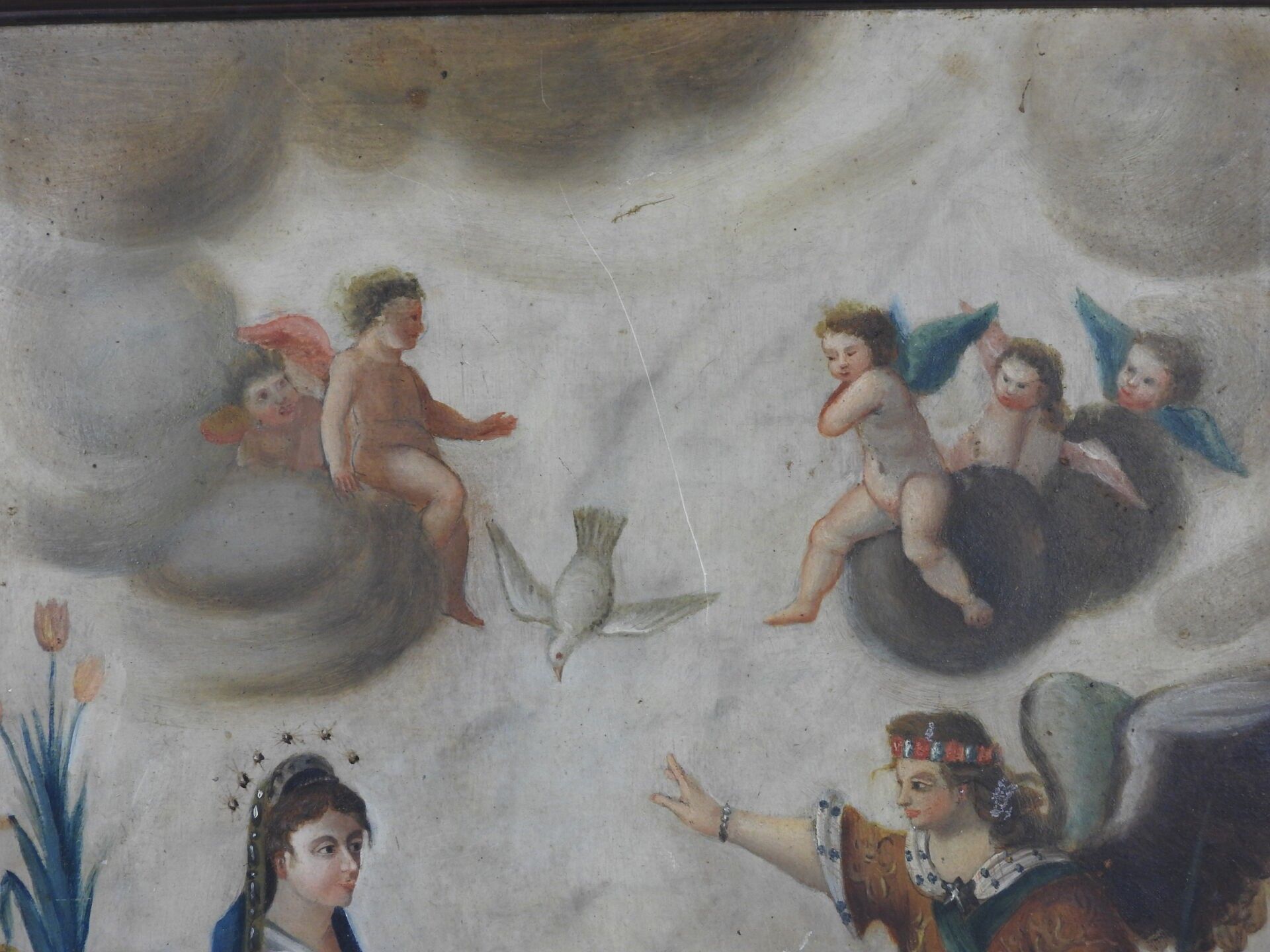 École FRANCAISE du XIXème siècle : L'annonciation. Huile sur carton. 43 x 32 cm (usures, trou de punaise)