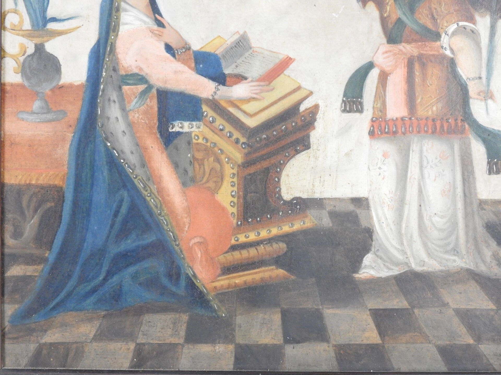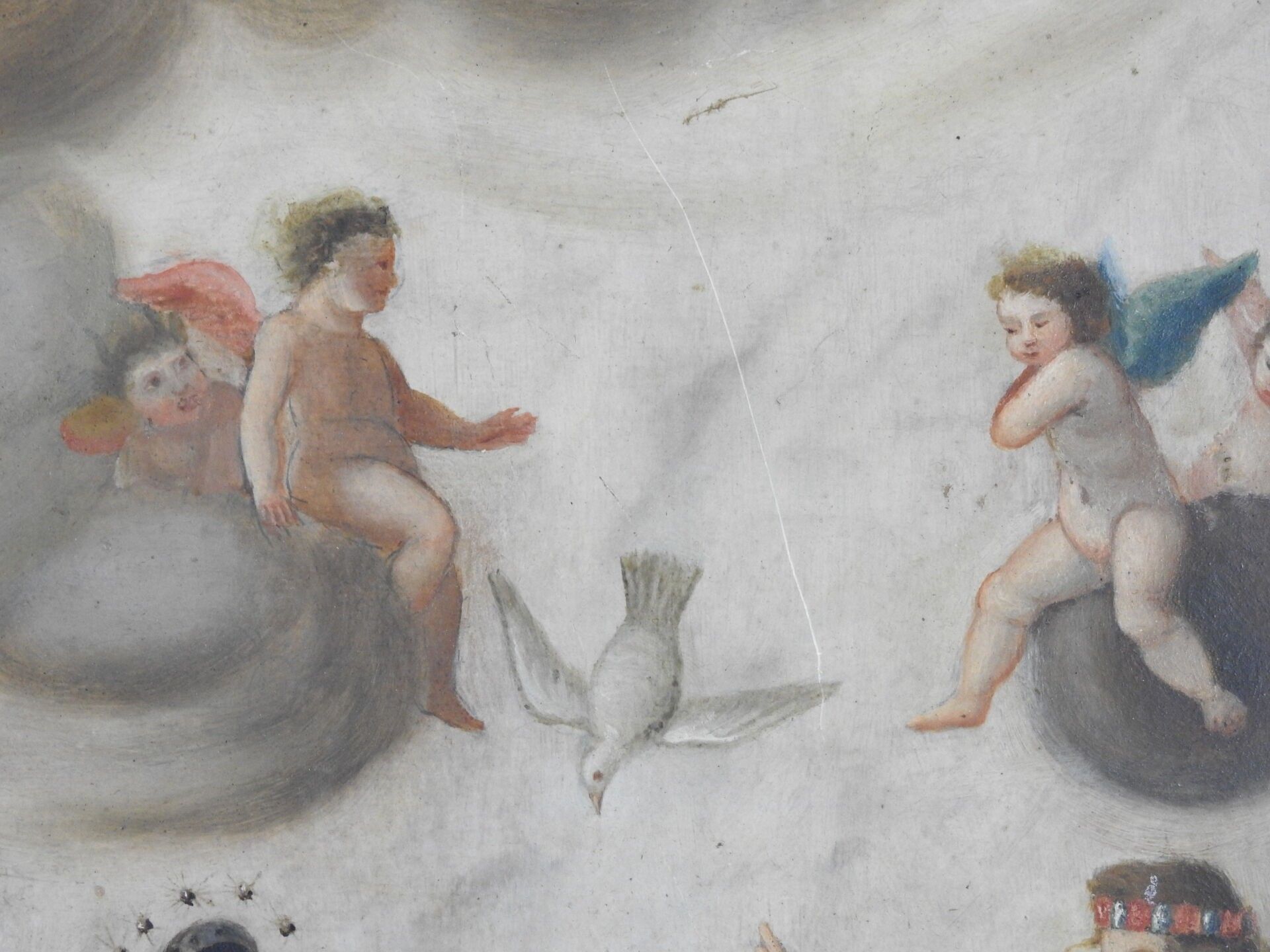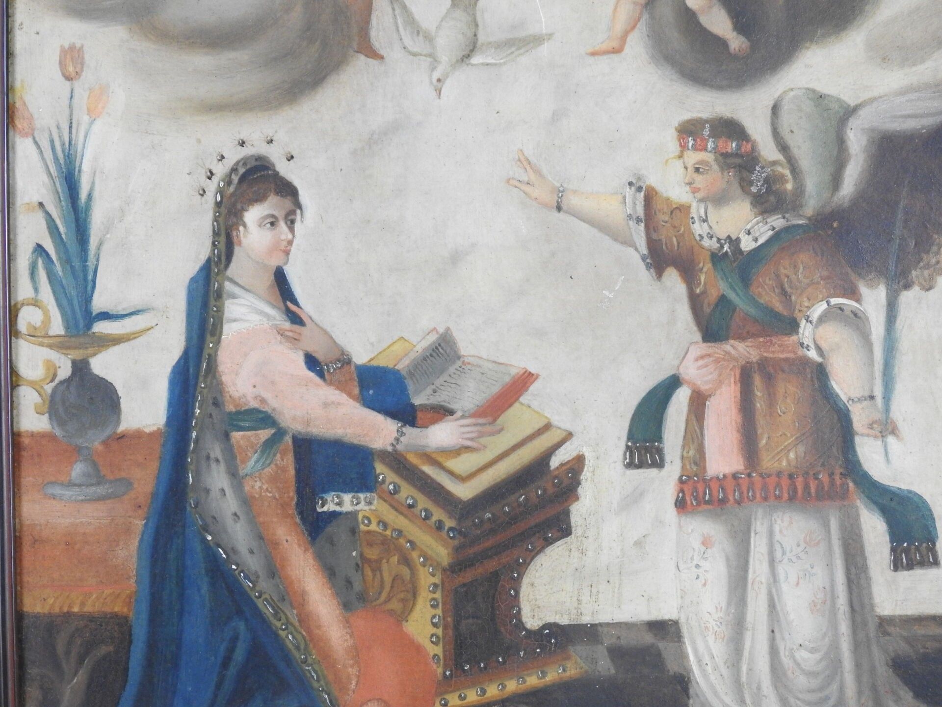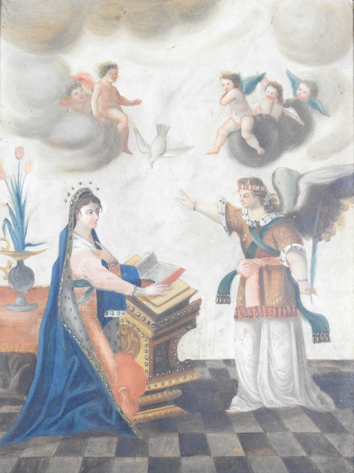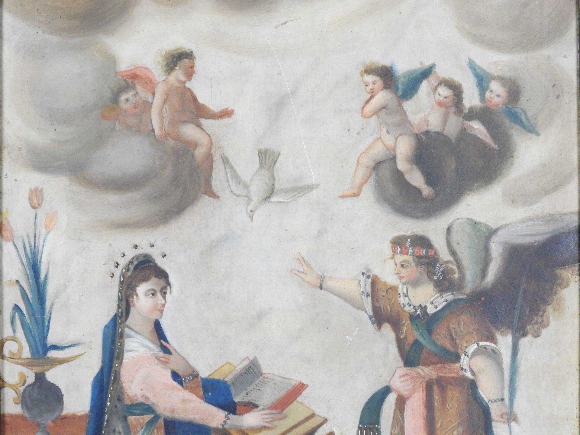 École FRANCAISE du XIXème siècle : L'annonciation. Huile sur carton. 43 x 32 cm (usures, trou de punaise)