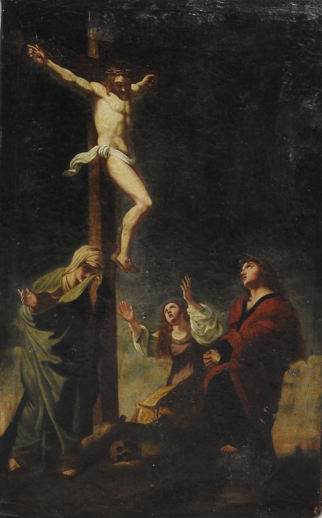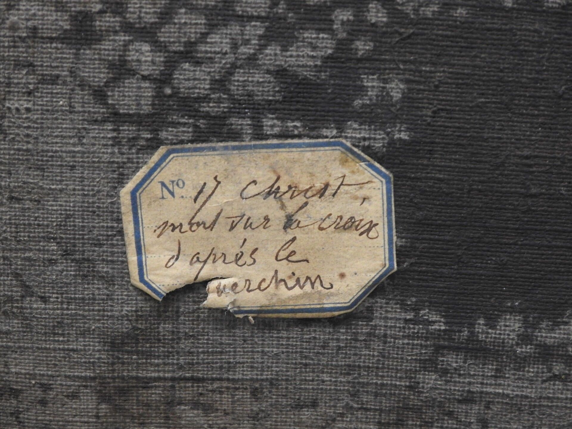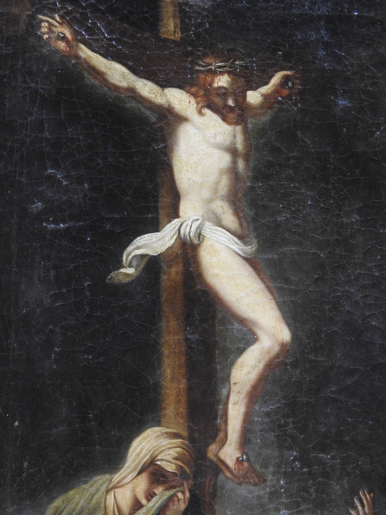 École FRANCAISE du XVIIème siècle d'après LE GUERCHIN: Le Christ mort sur la croix. Huile sur toile. Étiquette au dos "le Guerchin". 86 x 53 cm (usures)