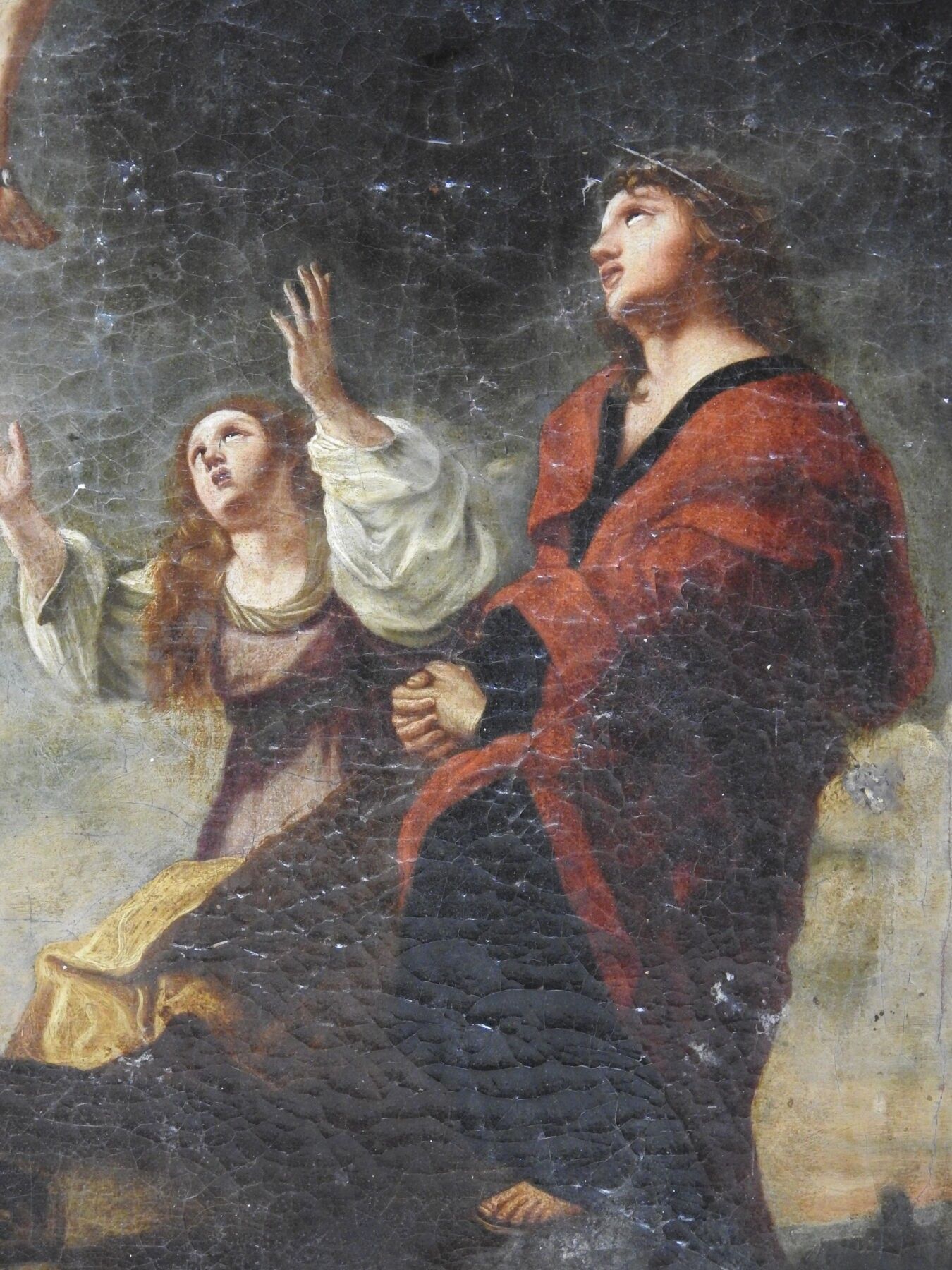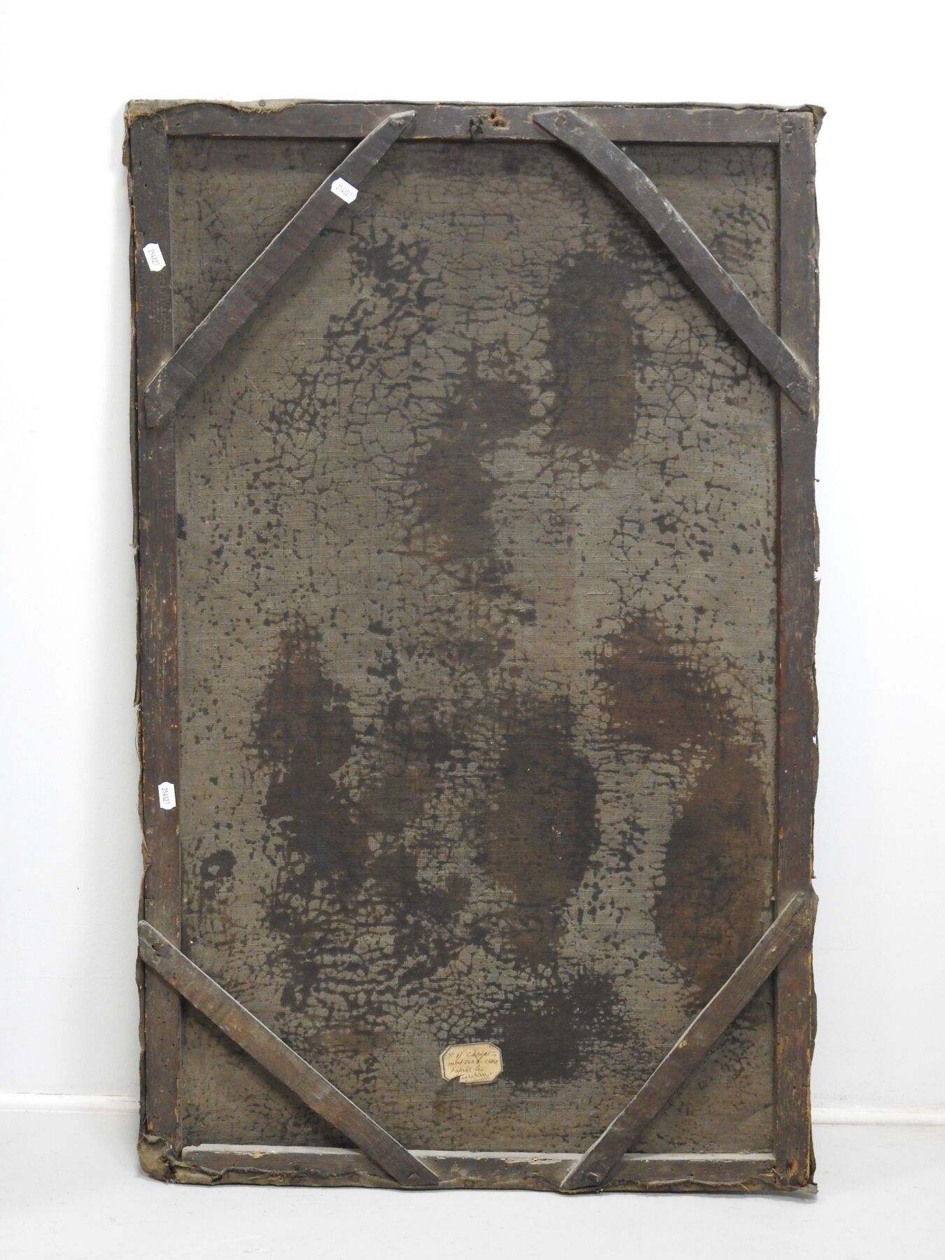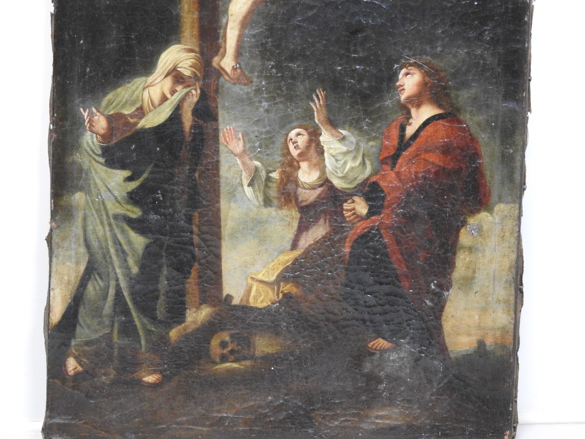 École FRANCAISE du XVIIème siècle d'après LE GUERCHIN: Le Christ mort sur la croix. Huile sur toile. Étiquette au dos "le Guerchin". 86 x 53 cm (usures)