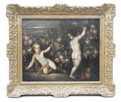 Ecole FLAMANDE vers 1700: Deux putti devant un bosquet fleur…