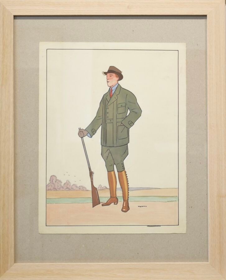 Edouard SAUNIER (1885-1918), "Costume de chasseur", gouache et aquarelle sur papier fort, encadrée, 32.5 x 25 cm.