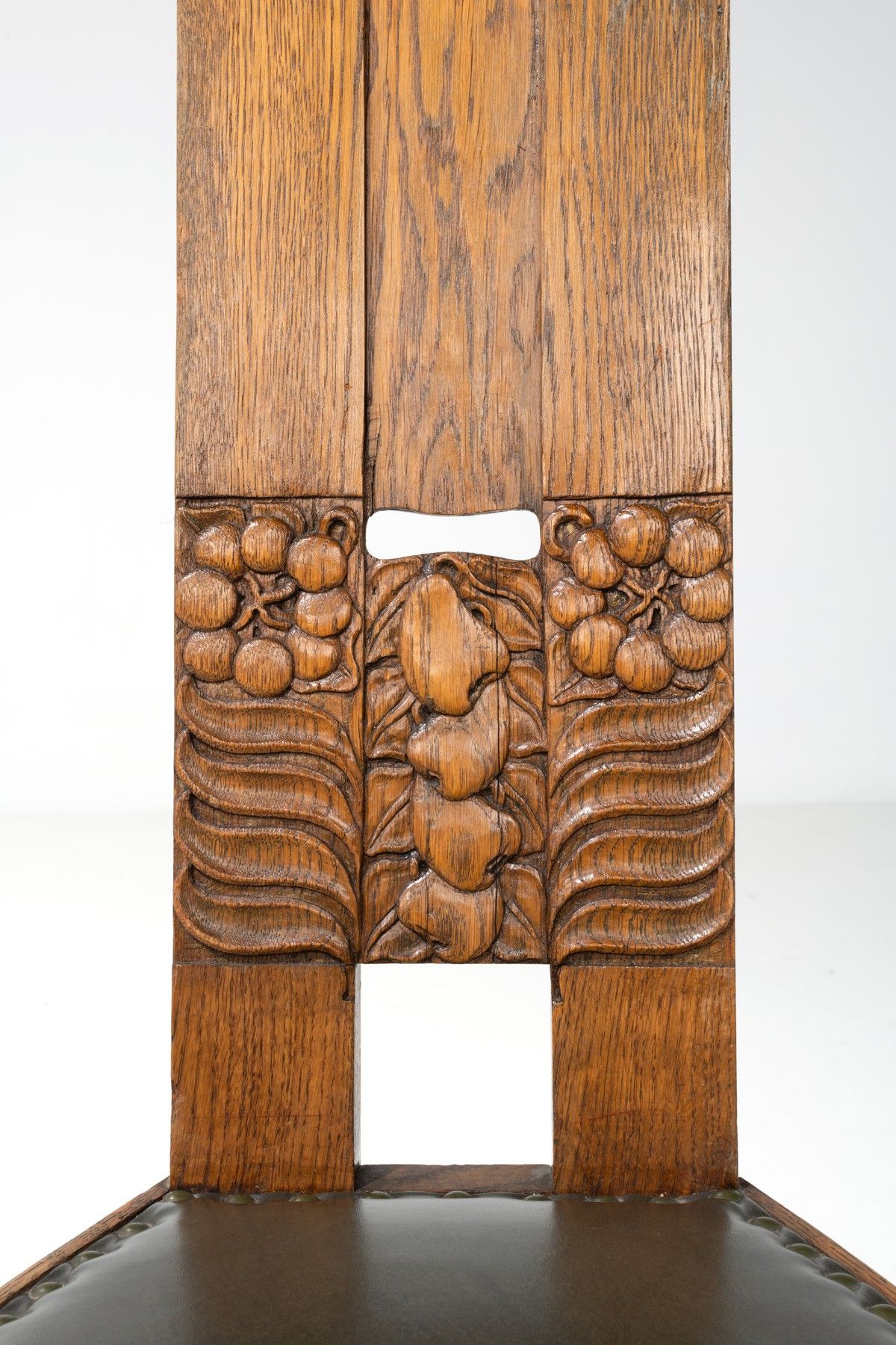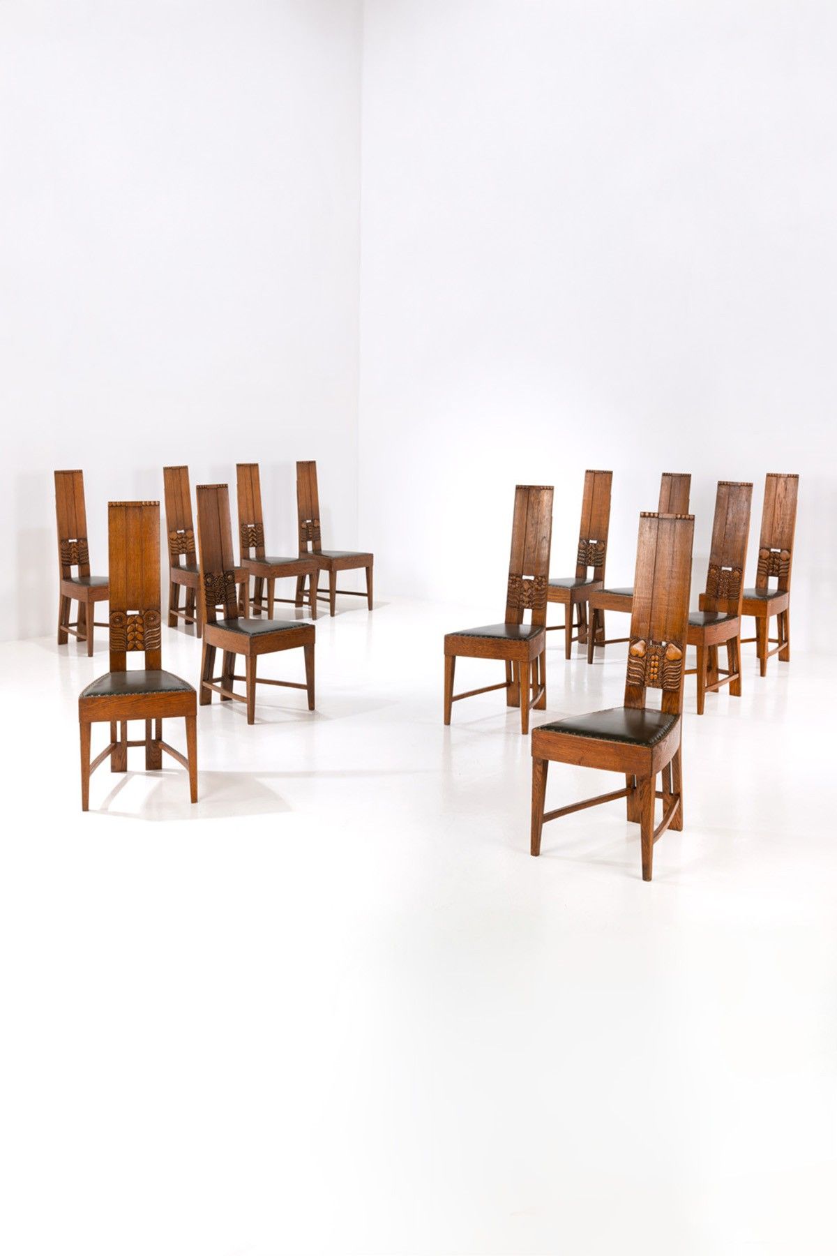 Max Frelander (1881-1949) Suite de douze chaises Chêne et simili-cuir Modèle créé vers 1910 H 109,5×L 41,5×P 50cm
