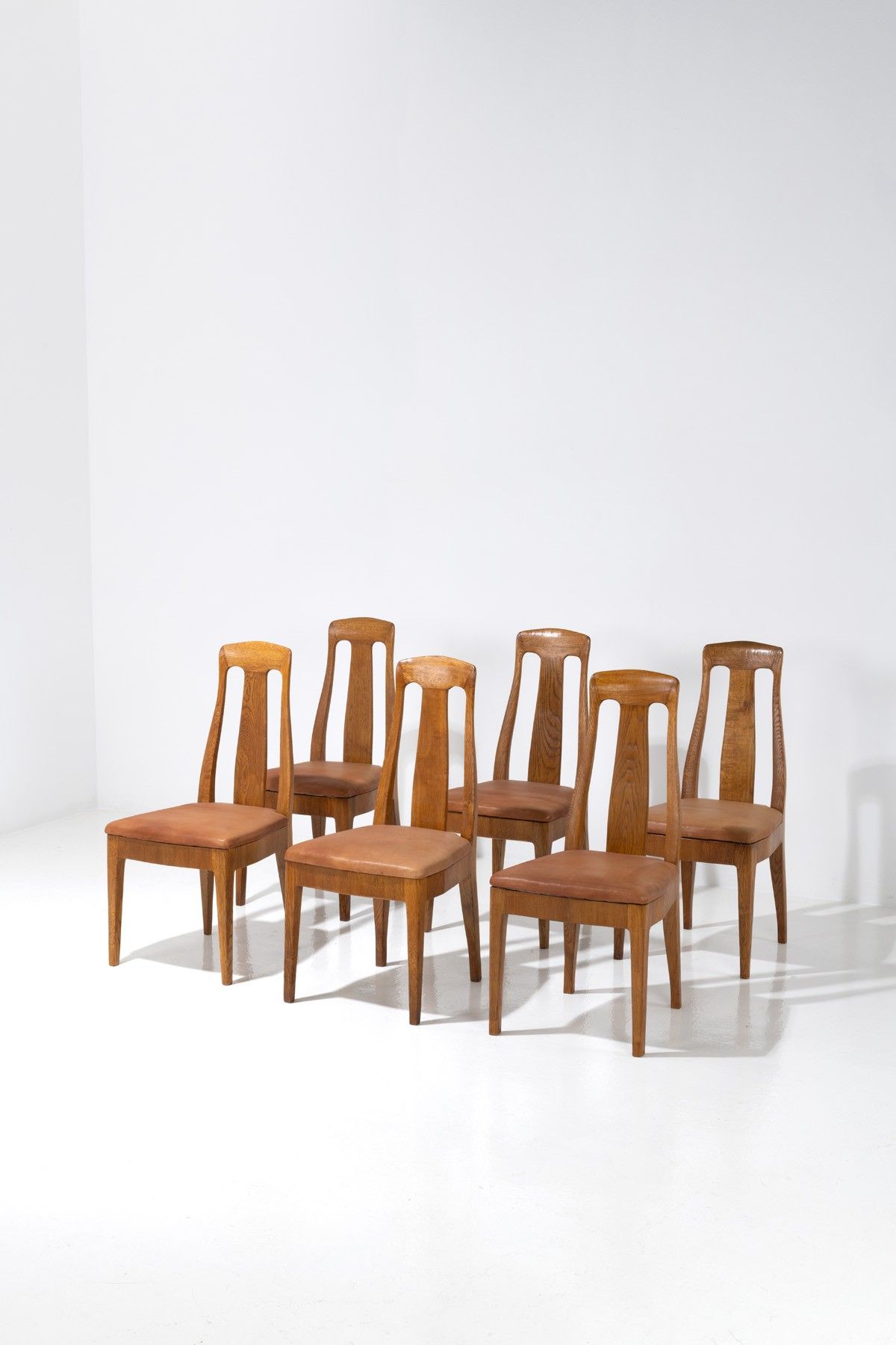 Eliel Saarinen (1873-1950) Suite de six chaises Chêne et cuir Édition Boman Modèle créé en 1906 H 94×L 45×P 47cm Provenance : Modèle réalisé pour les bureaux administratifs de la gare centrale d'Helsinki, Finlande. Bibliographie : 'The Architecture of Eliel Saarinen: Projects, 1896-1923', M. Hausen, K. Mikkola, A-L. Arnberg and T. Valto, Cambridge, 1990, modèle similaire p.168