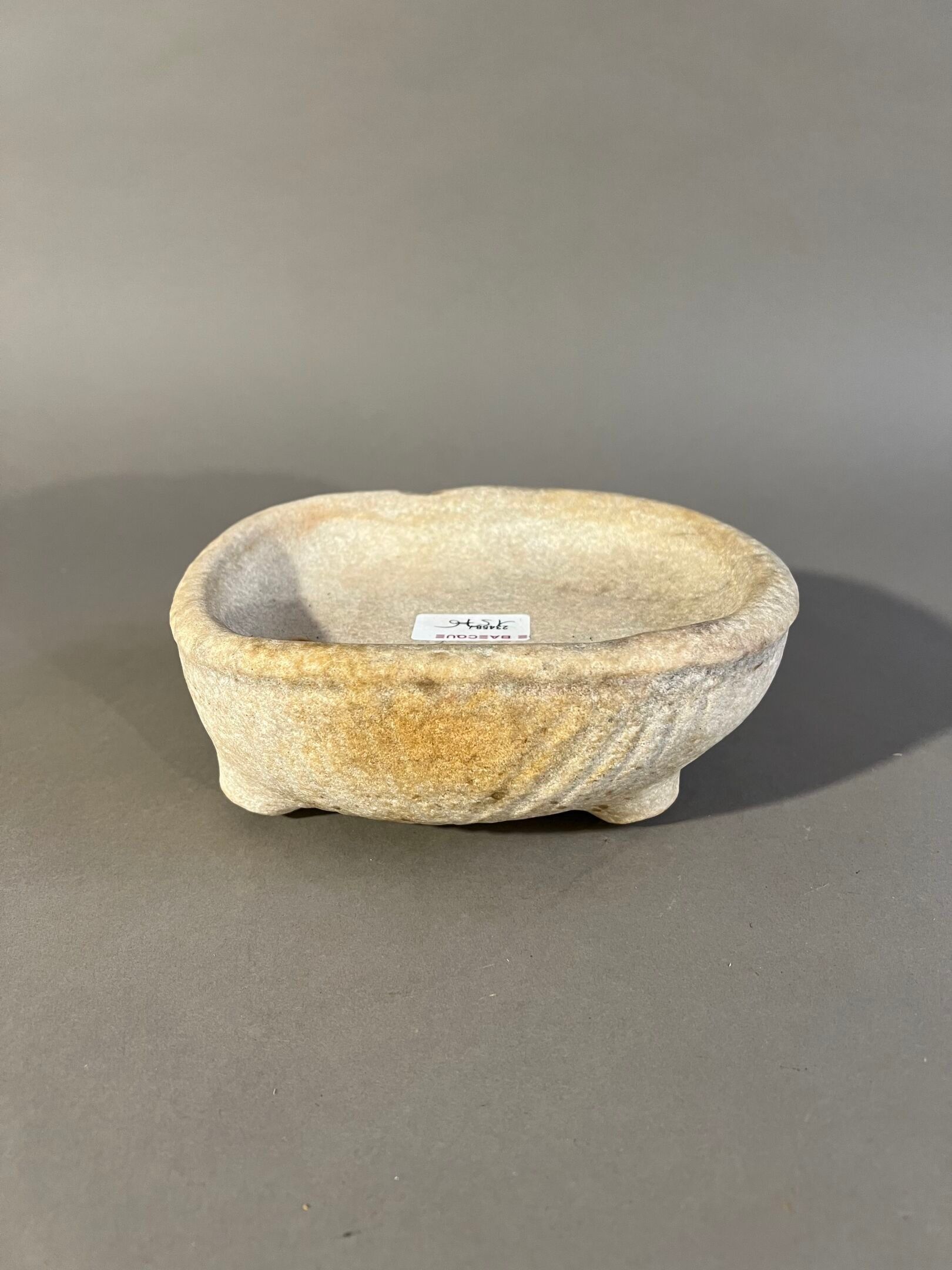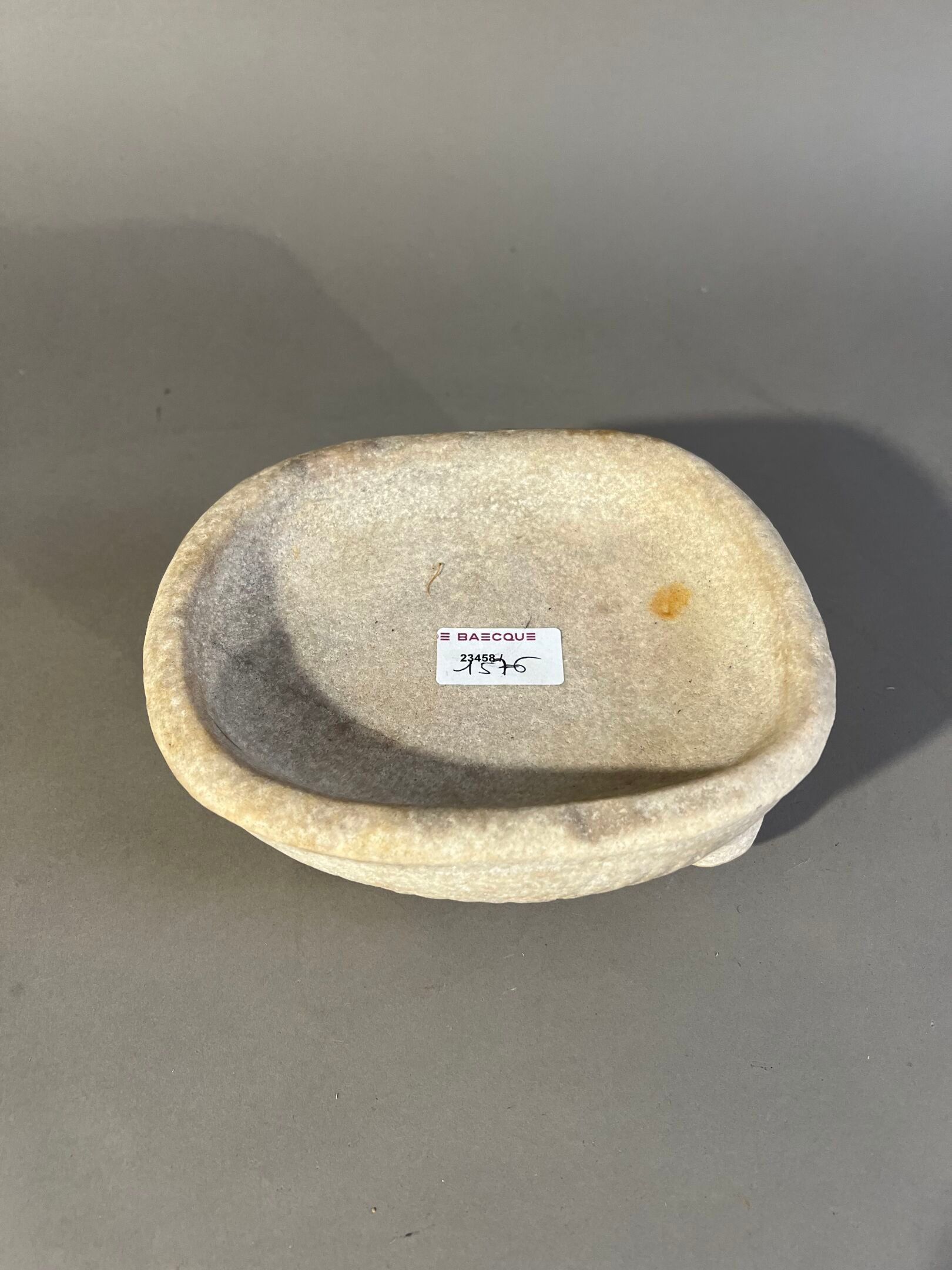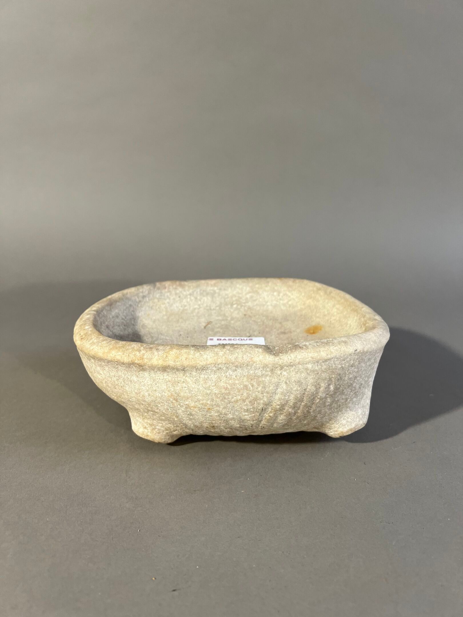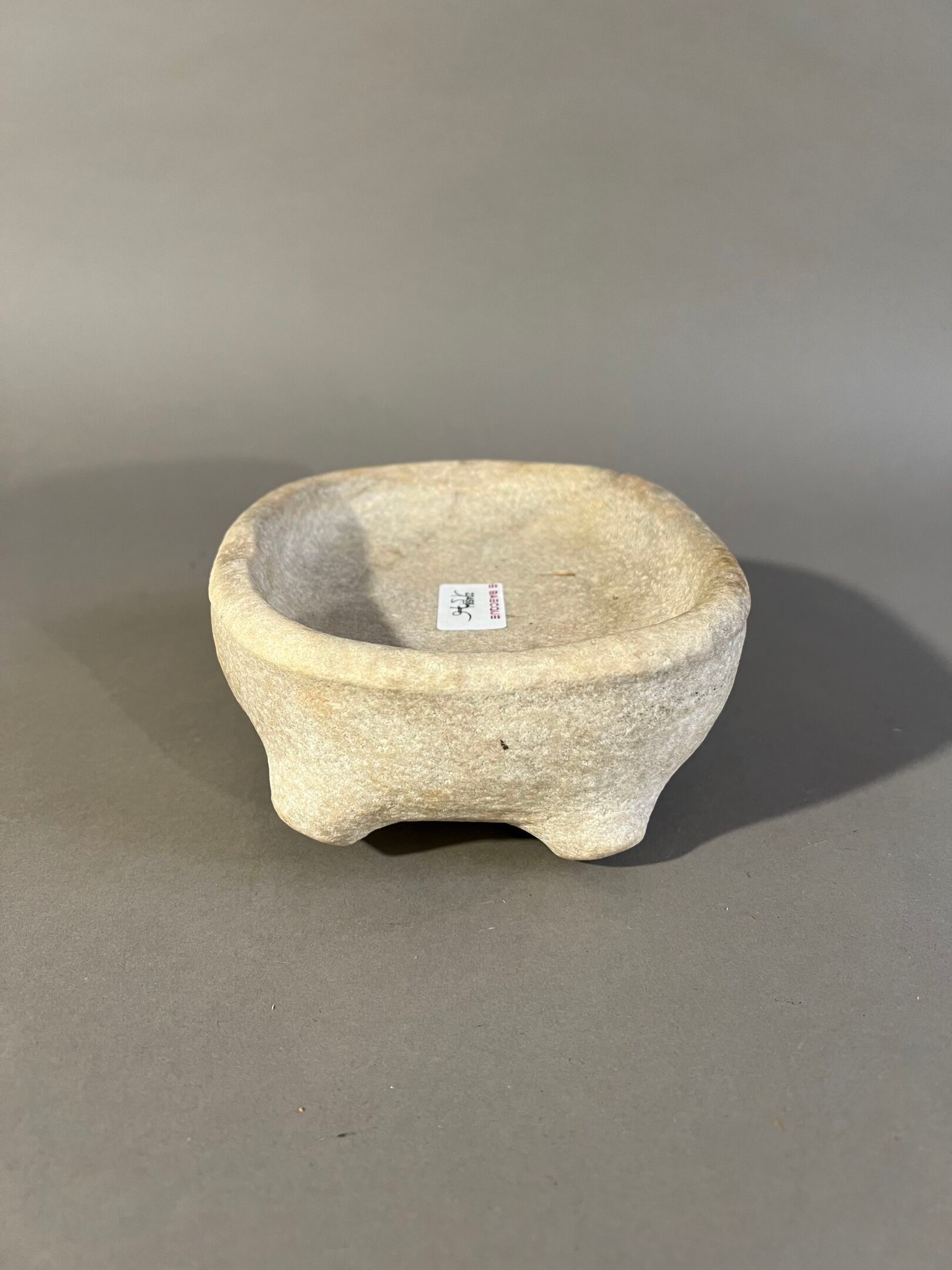 Creusée en son centre par l'usage et le temps. Elle repose sur quatre petits pieds, l'extérieur orné de motifs géométriques croisés.