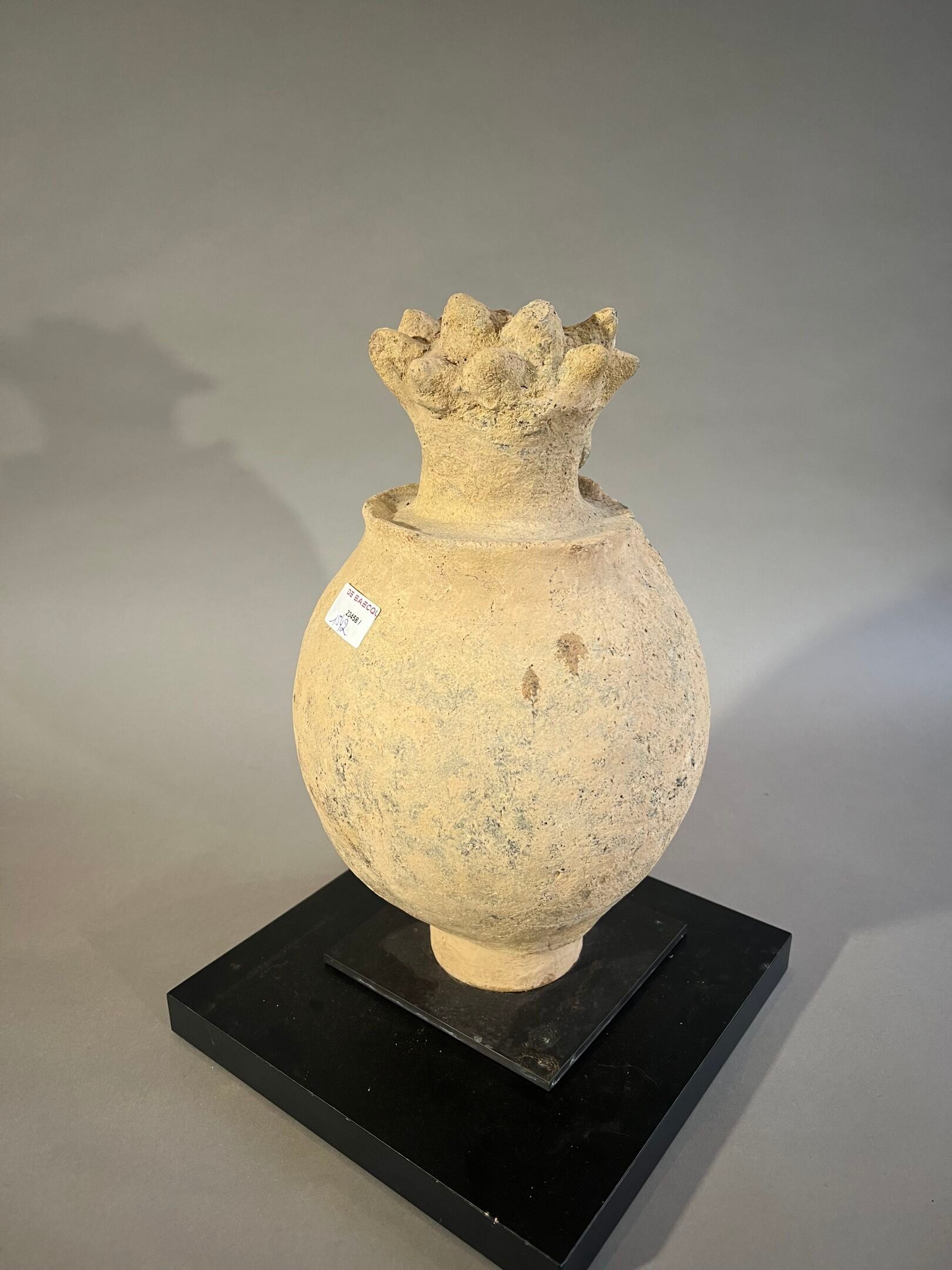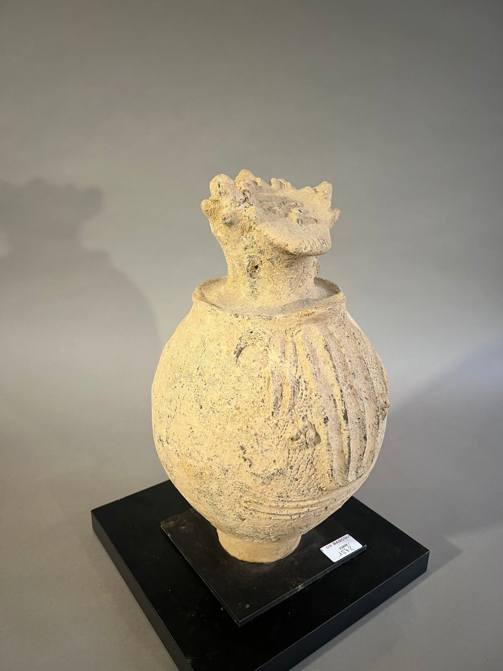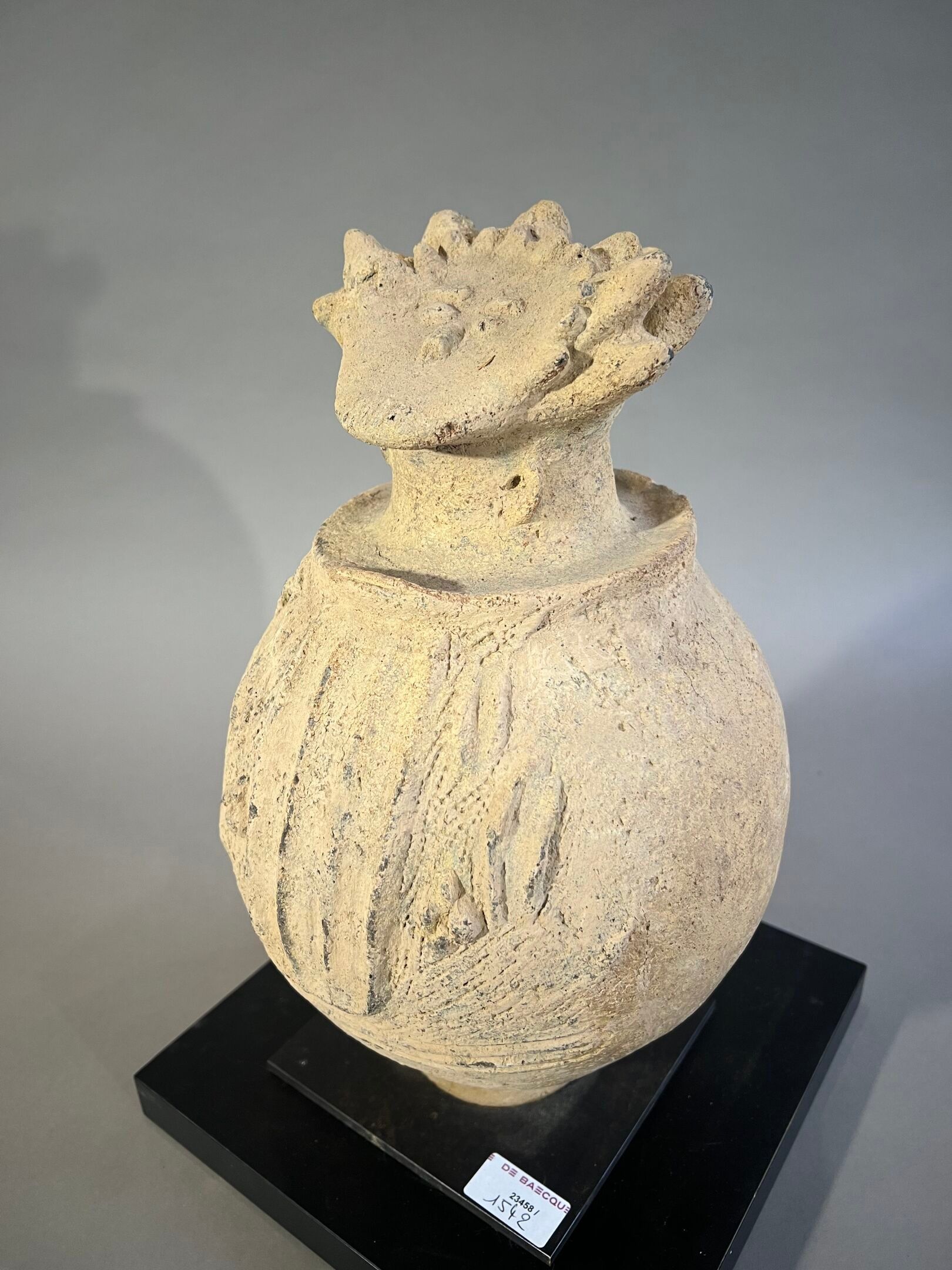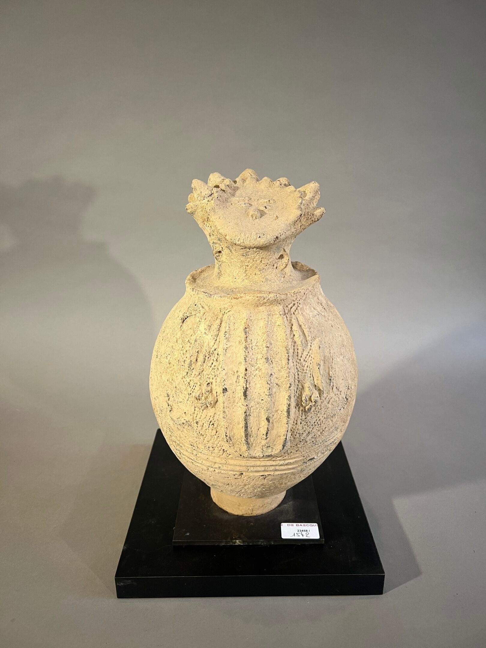 Surmontée d'une tête à la coiffe hérissée de pointes et au visage ébauché ; la panse ornée en relief de motifs géométriques.