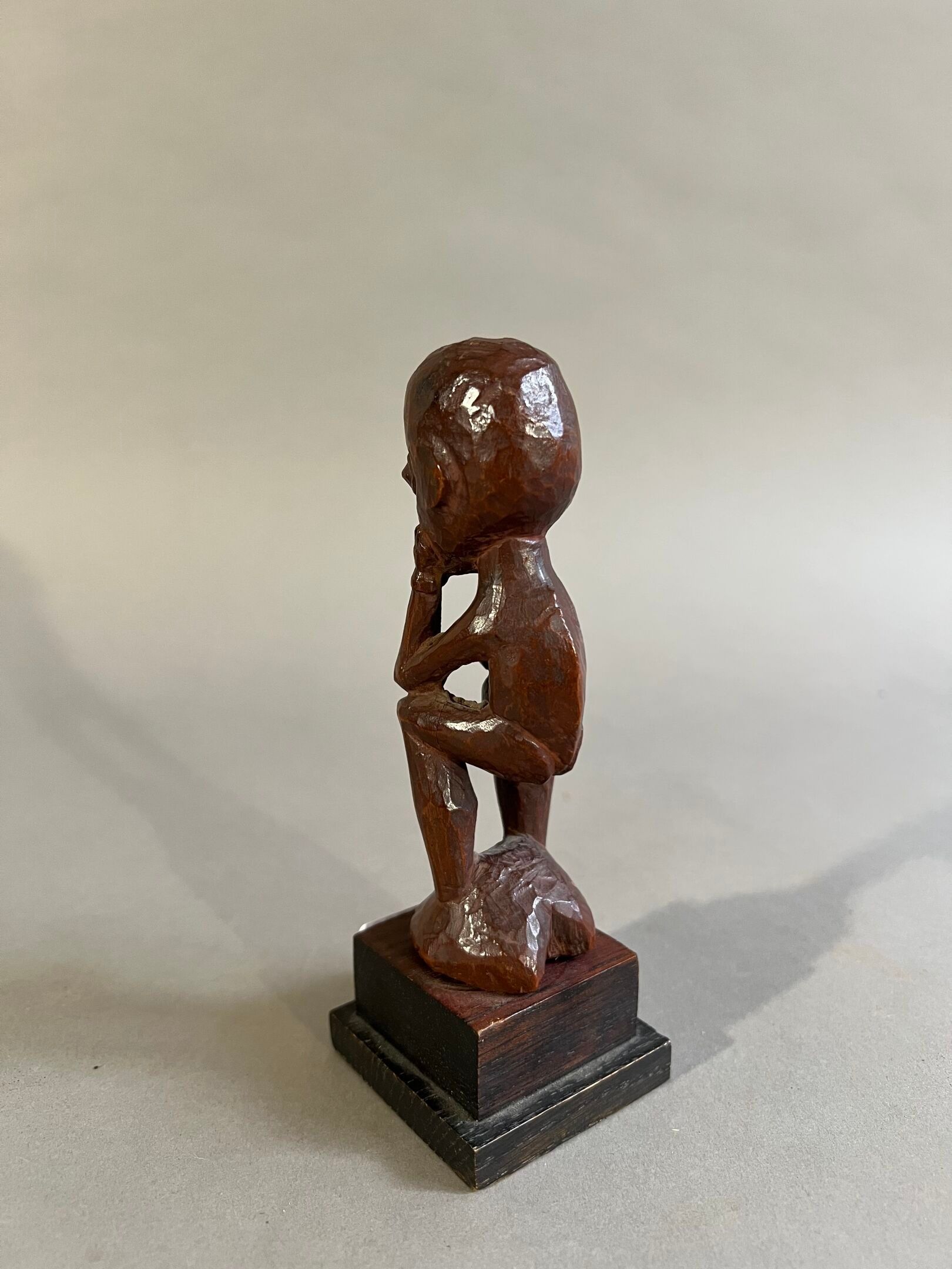 Personnage accroupi se tenant la tête, le dos arrondi, les grands yeux globuleux contrastant avec la finesse du reste des traits. Intéressant mouvement des bras dans le prolongement des jambes, ainsi que des pleine et des vides.
