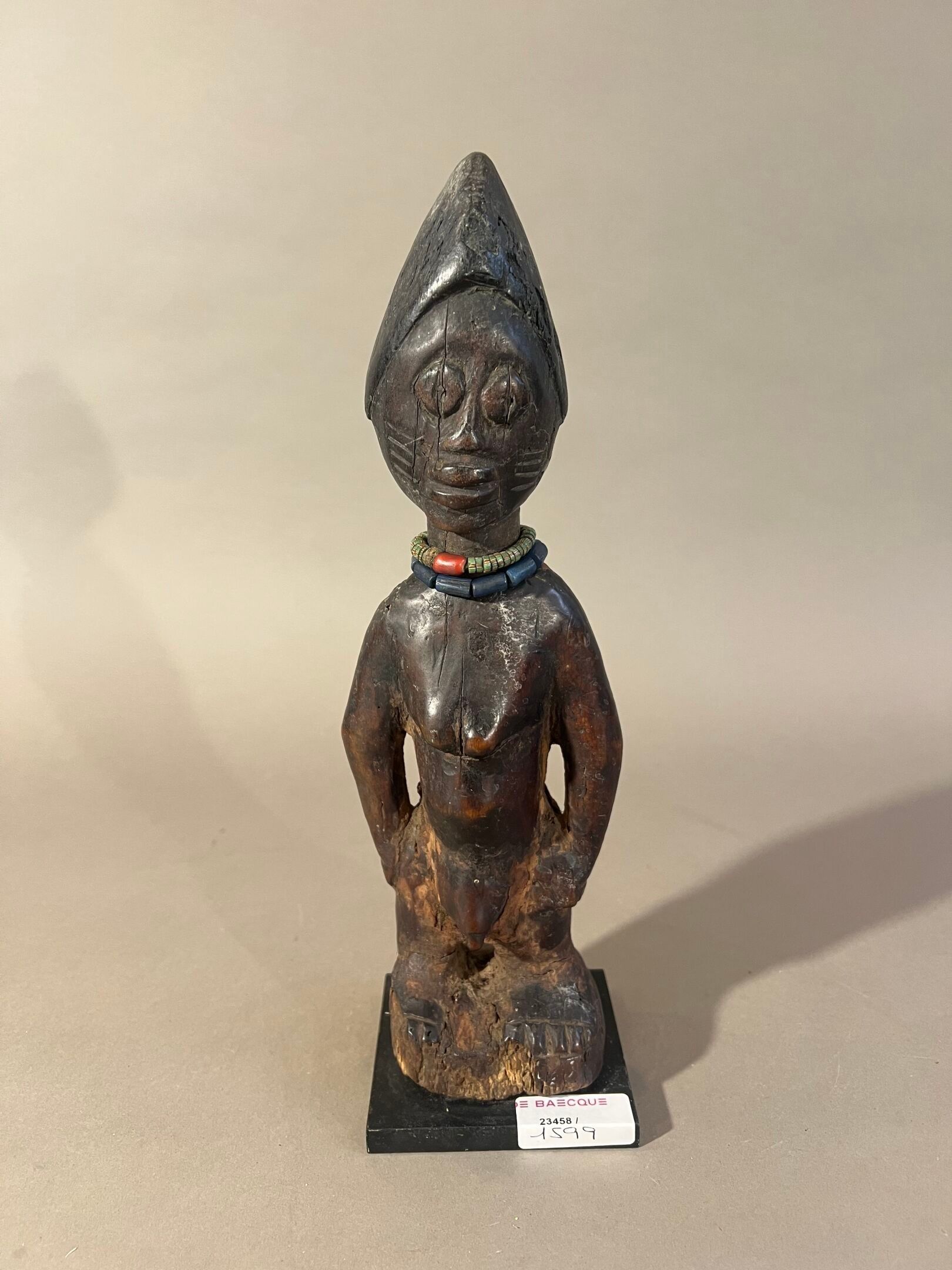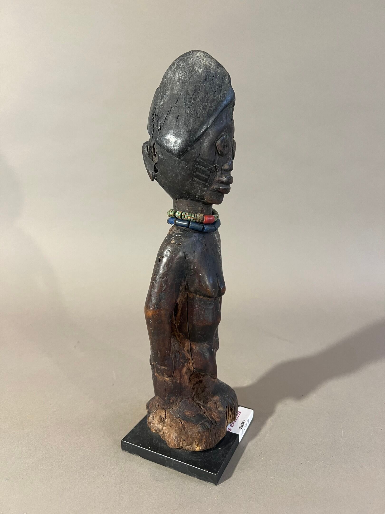 Personnage masculin les mains aux hanches, la tête légèrement penchée, le cou paré de colliers en perles.