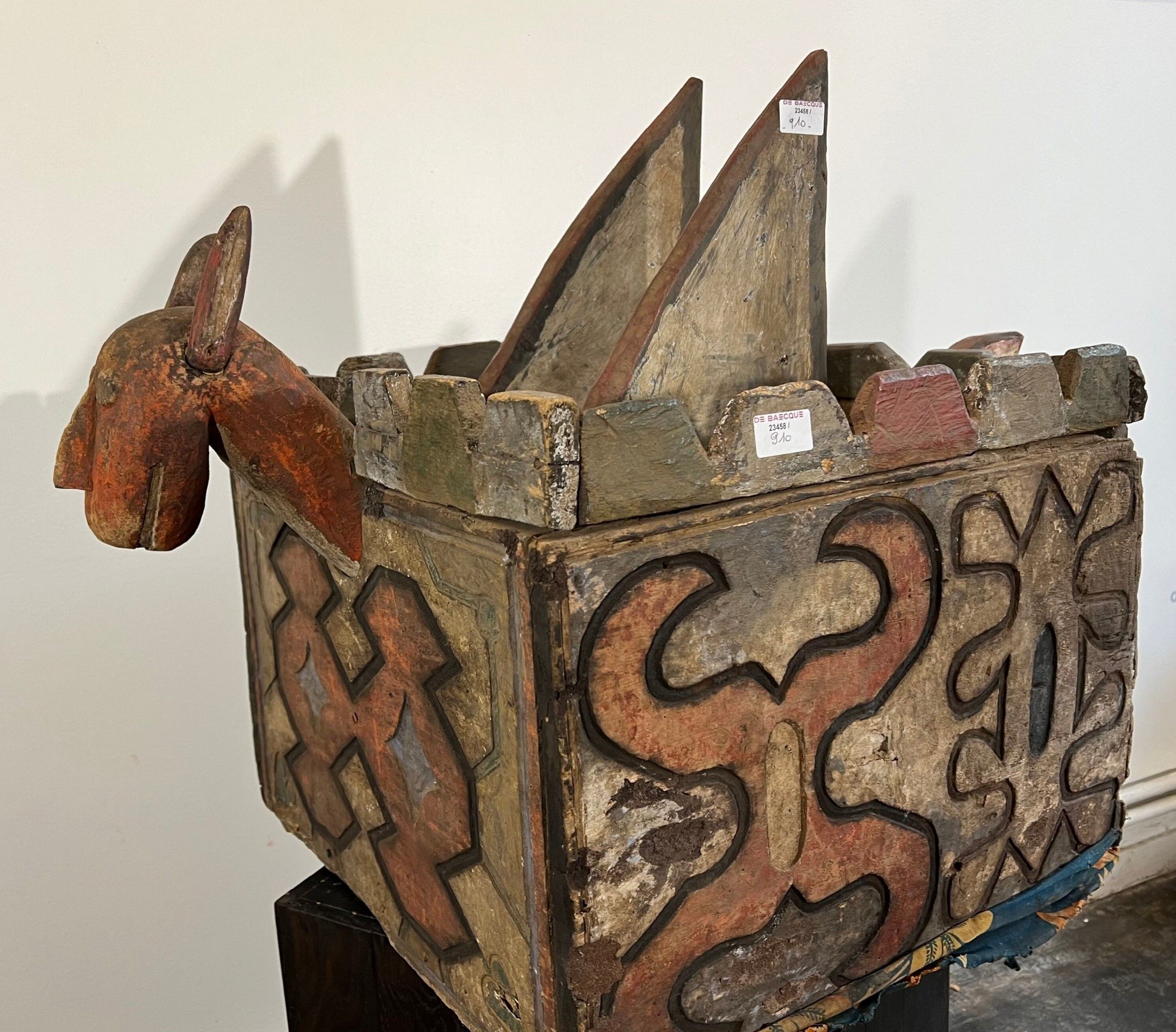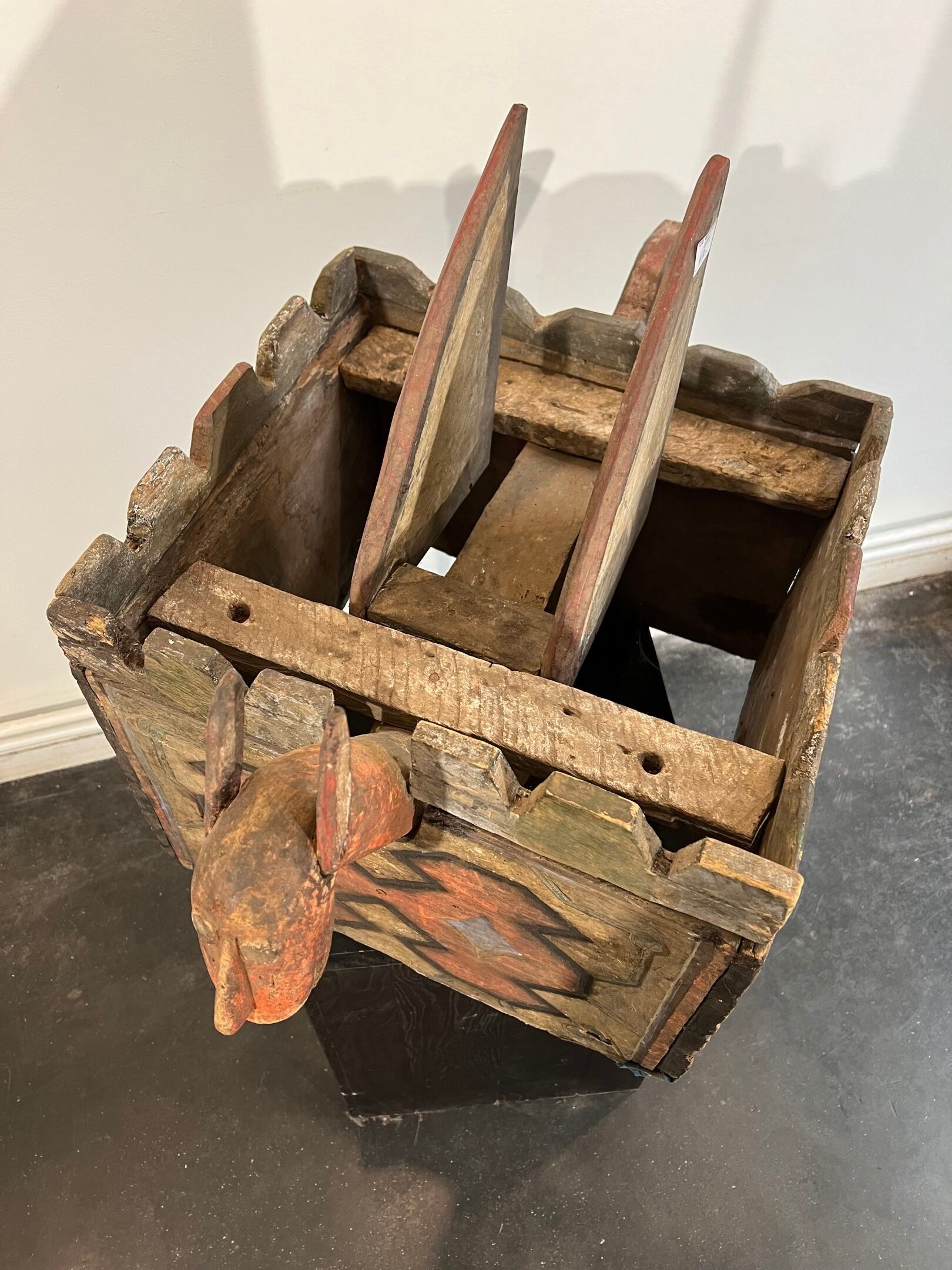 Rectangulaire, formant caisse, décorée de motifs géométriques polychromes et ornée d'une tête de cheval ailé.