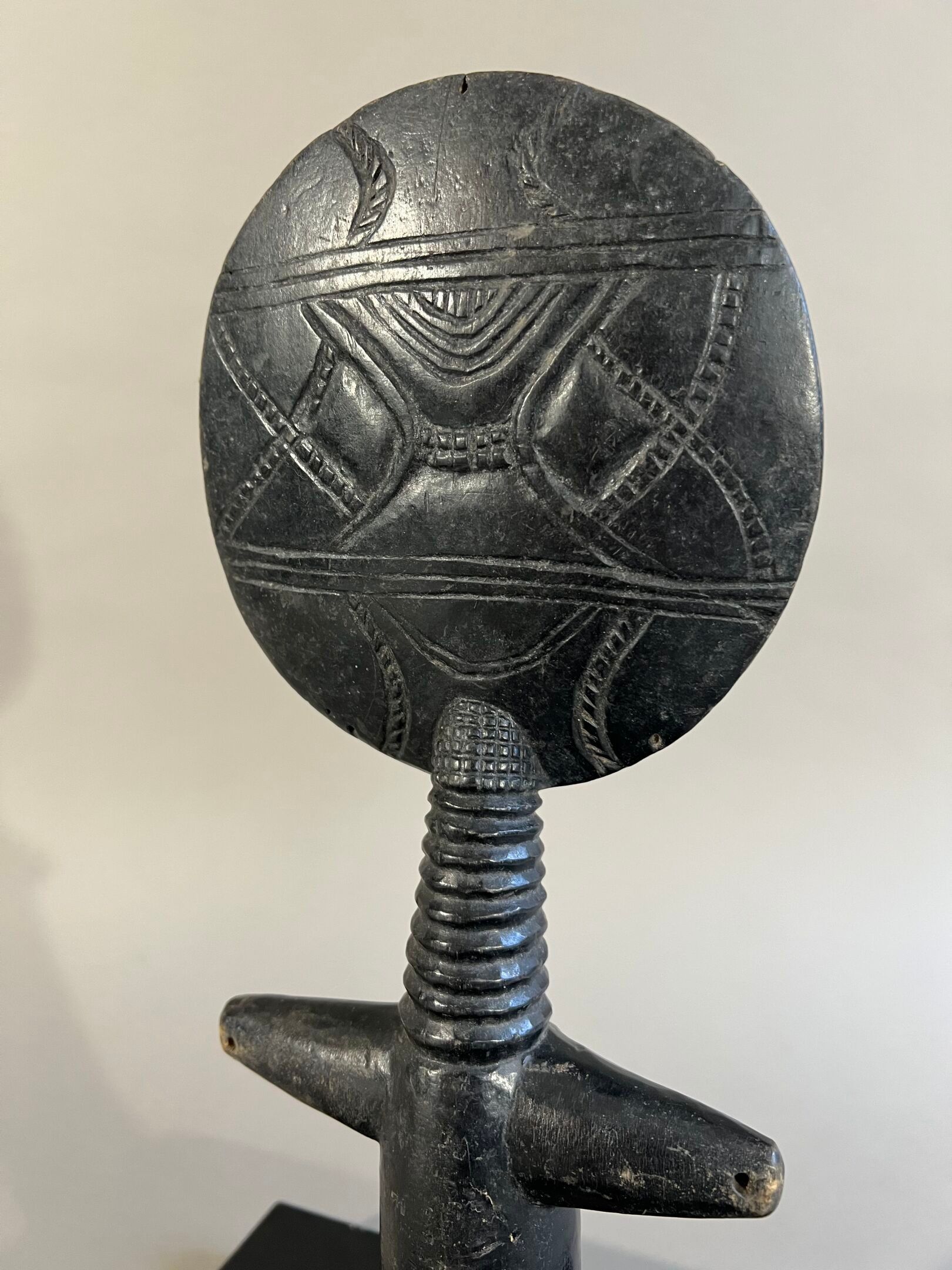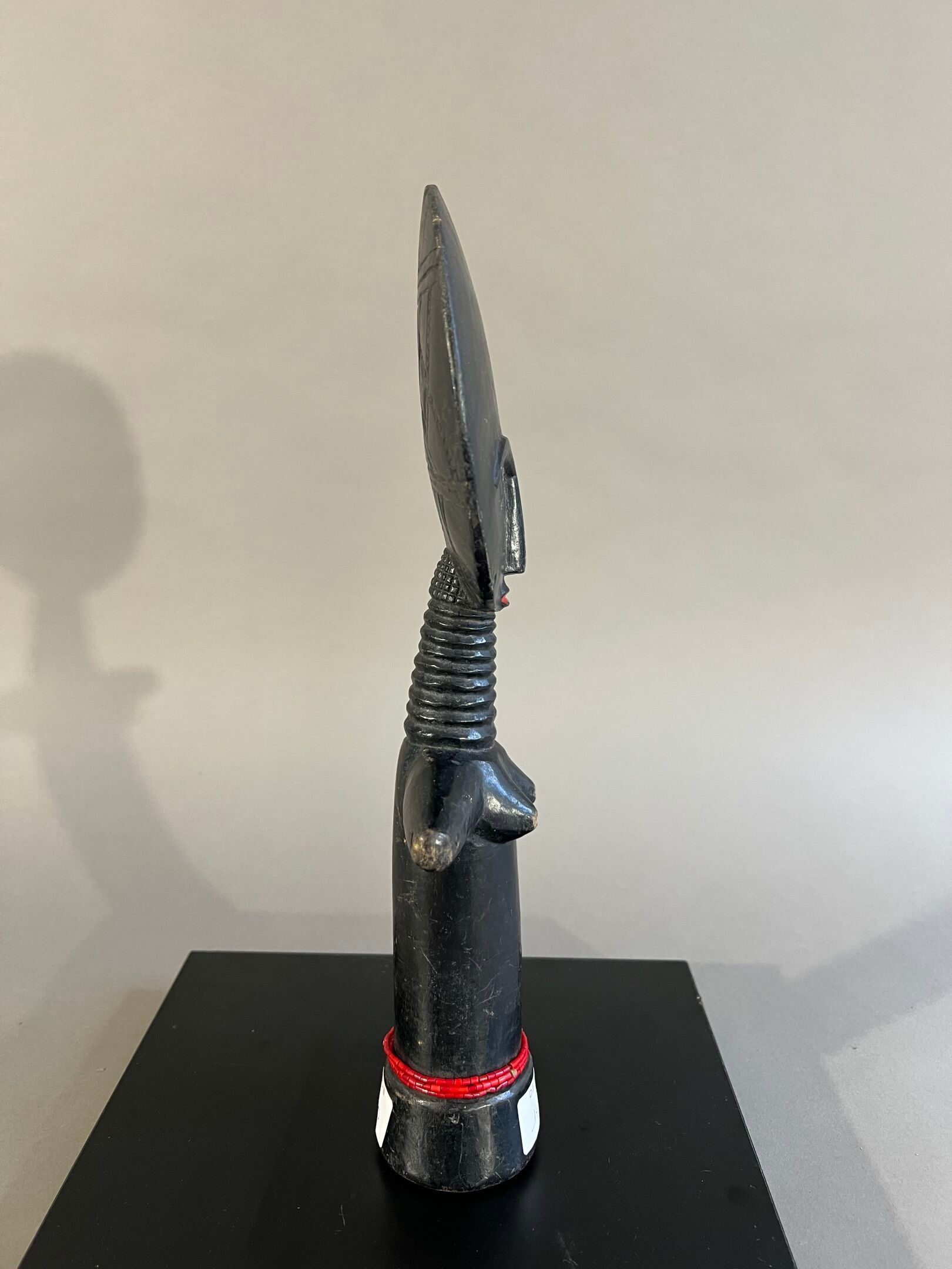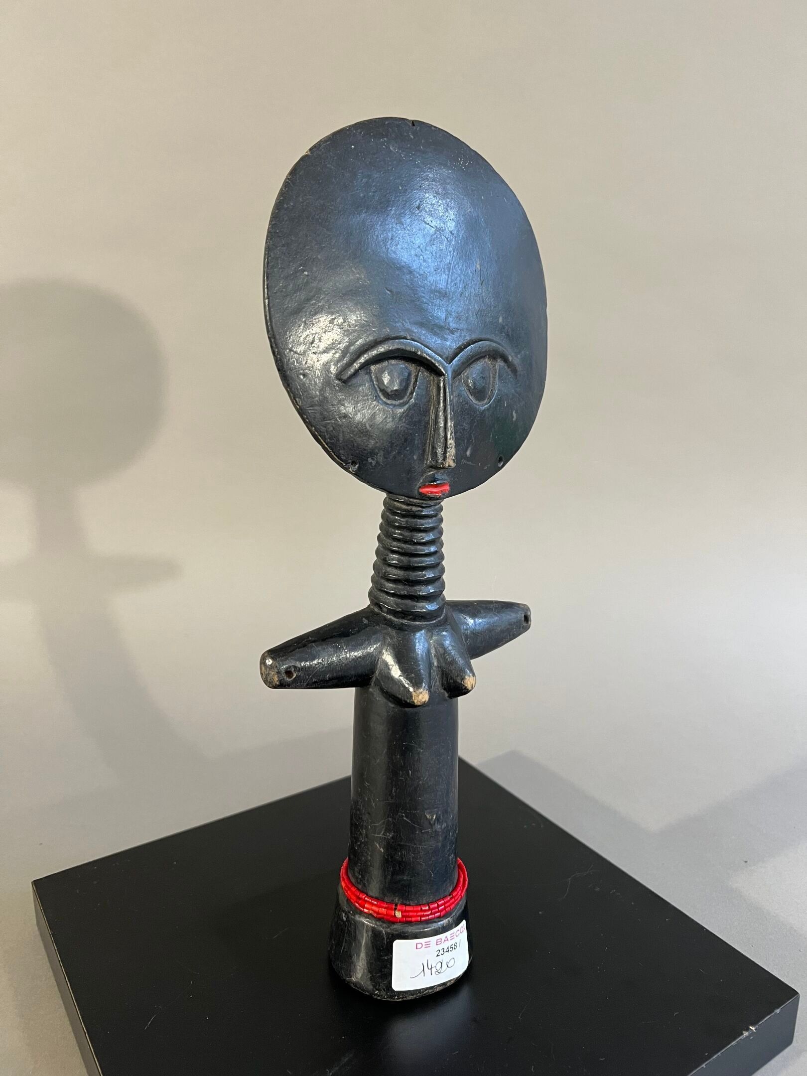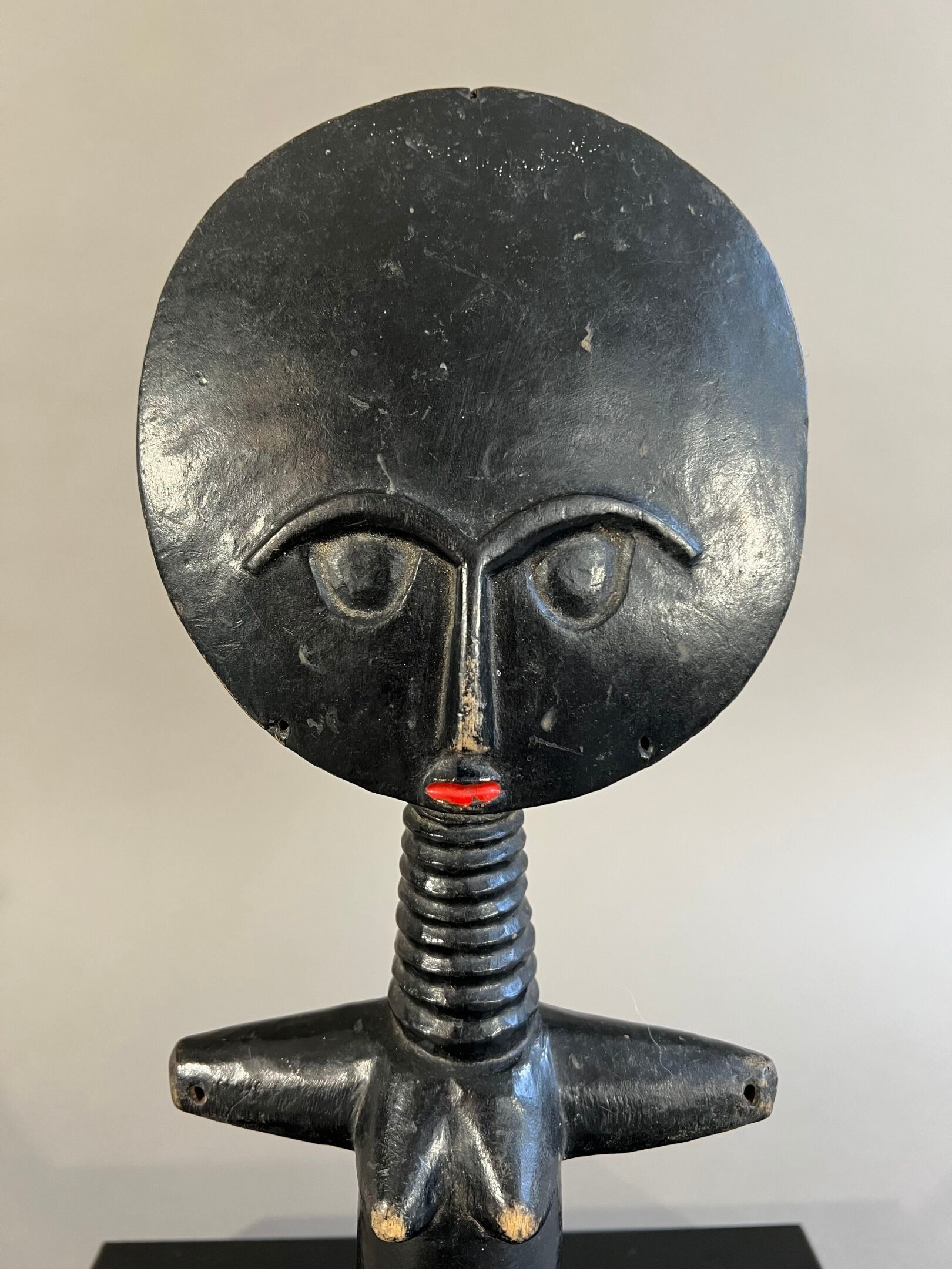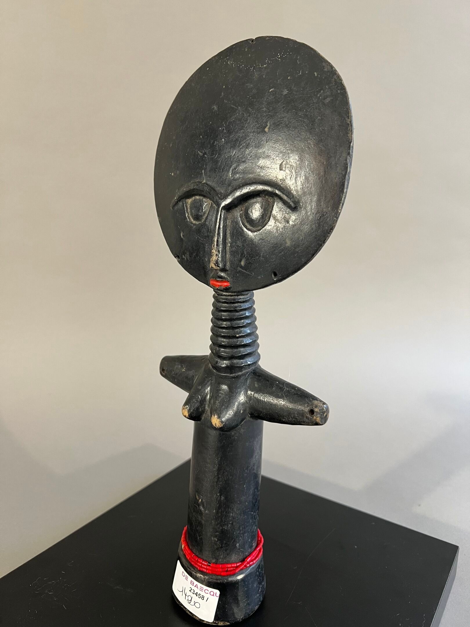 Personnage féminin stylisé, le visage inscrit dans un cercle décoré à l'arrière de motifs géométriques, les yeux traités en relief en demi-cercle, la bouche rehaussée de pigments rouges ; ceinture de perles rouges.