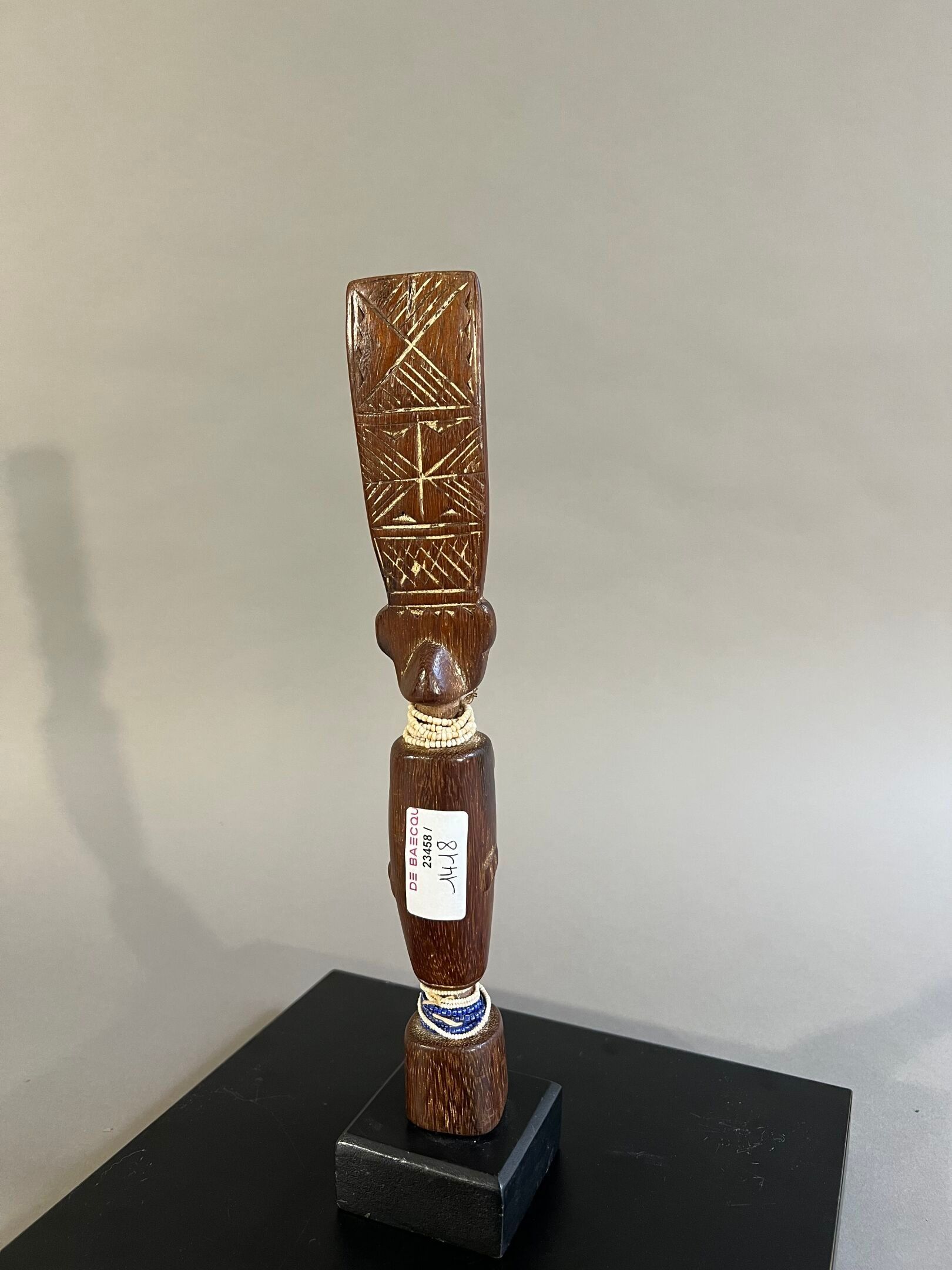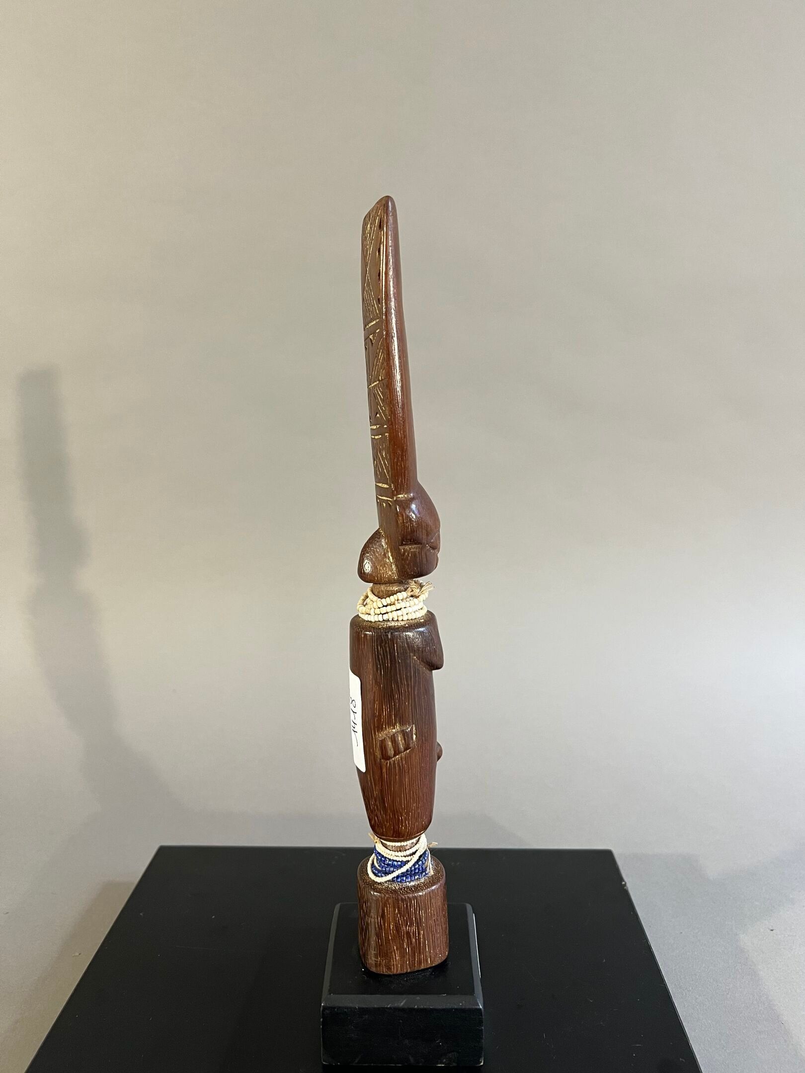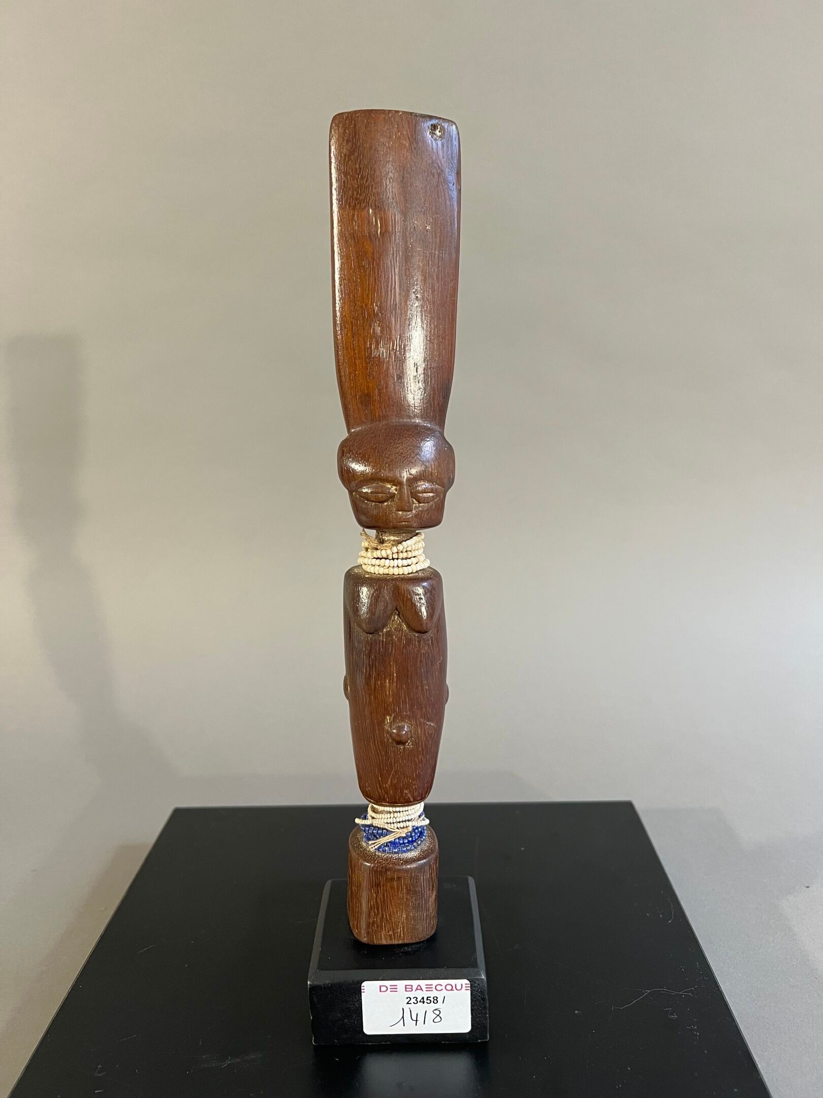 Parée de colliers de perles blanches et bleues, visage surmonté d'une large palette, mains dessinées le long du corps ; gravée à l'arrière.