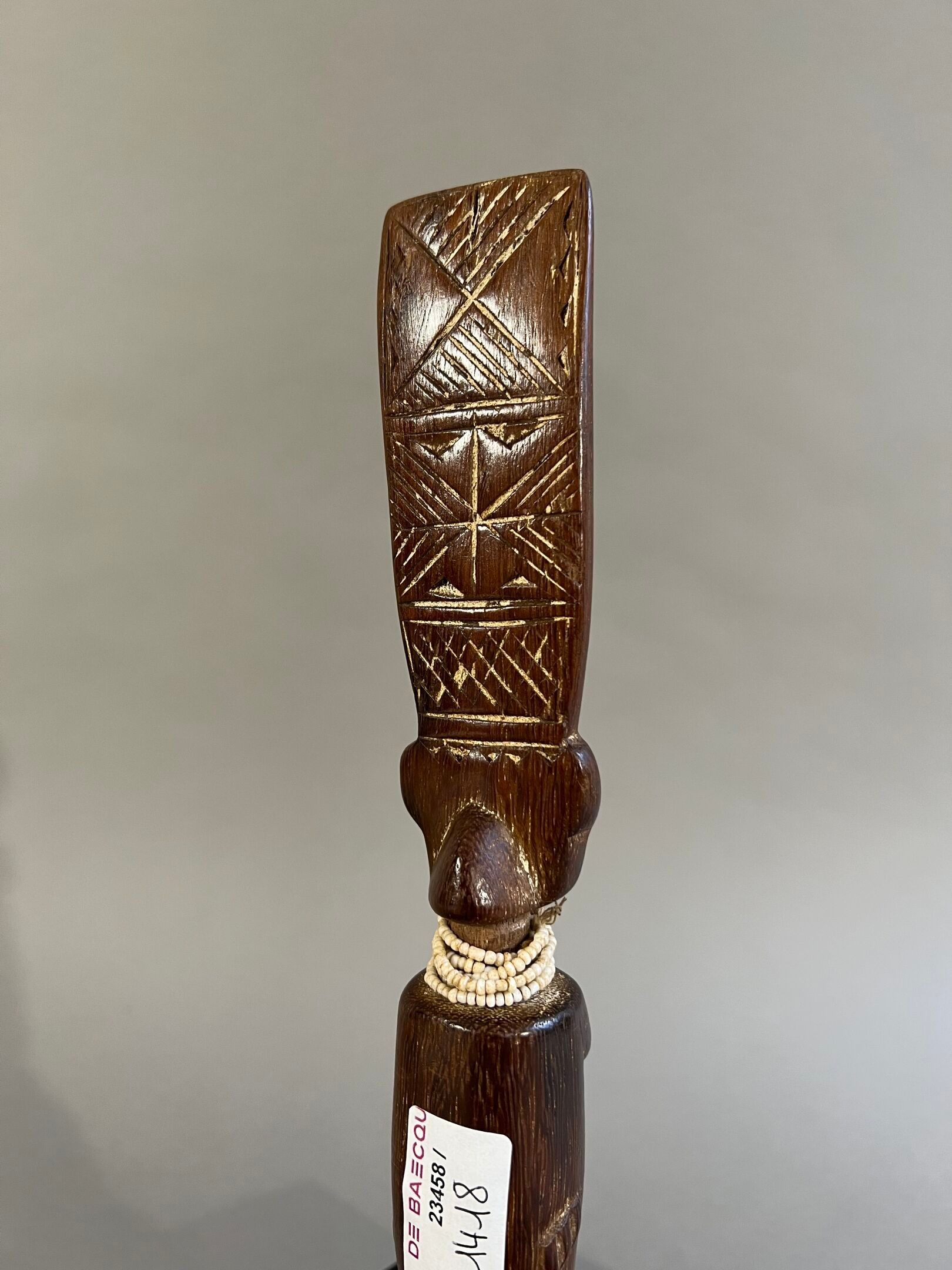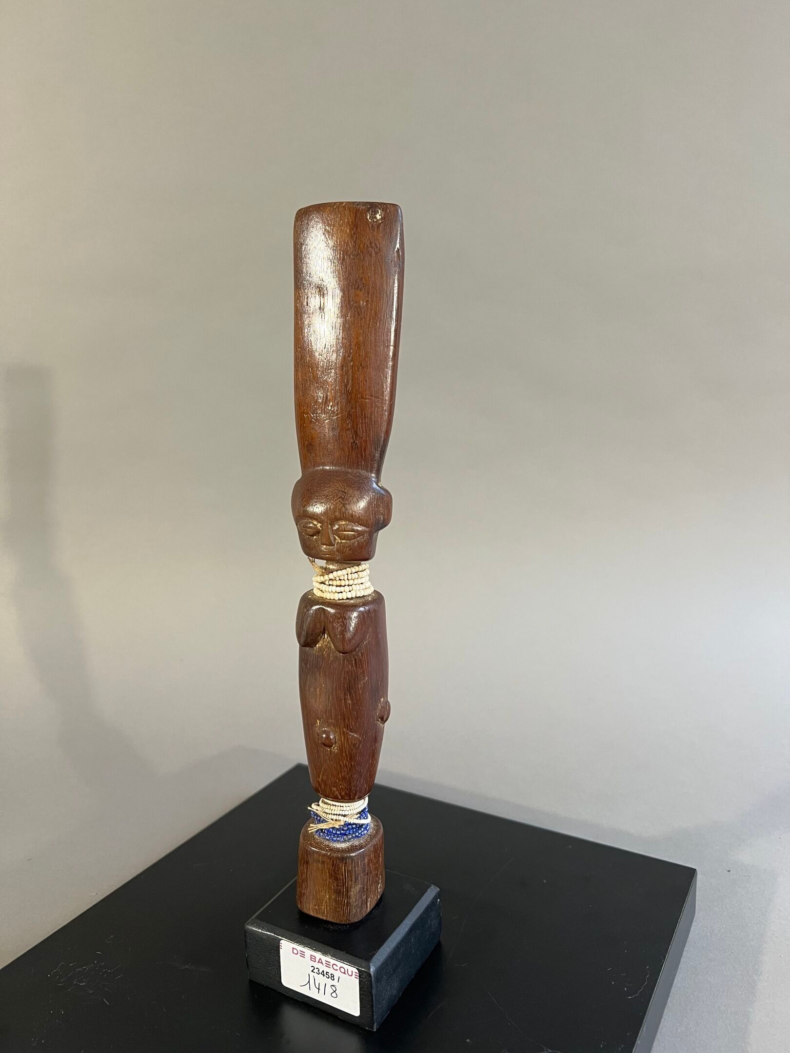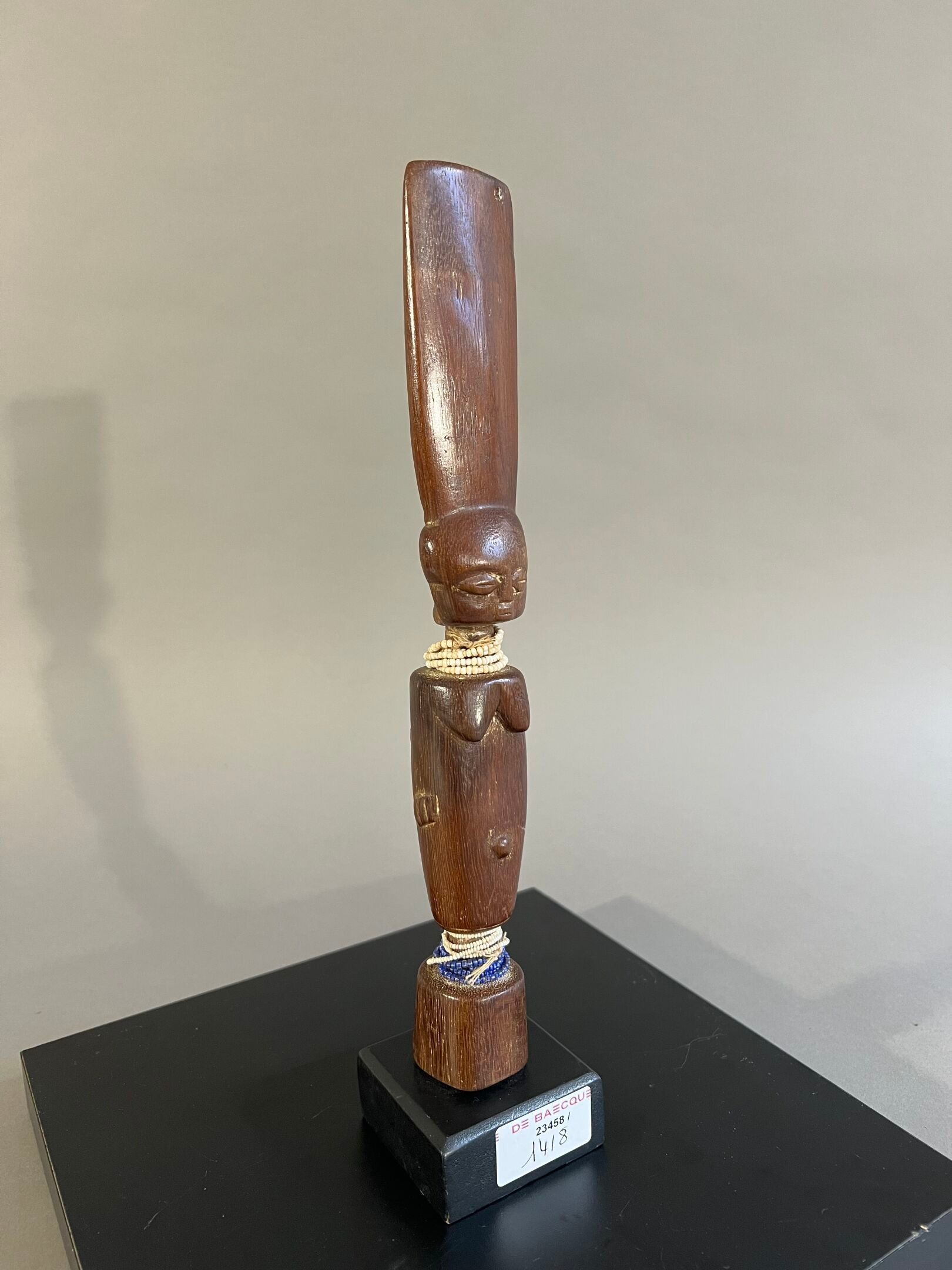 Parée de colliers de perles blanches et bleues, visage surmonté d'une large palette, mains dessinées le long du corps ; gravée à l'arrière.