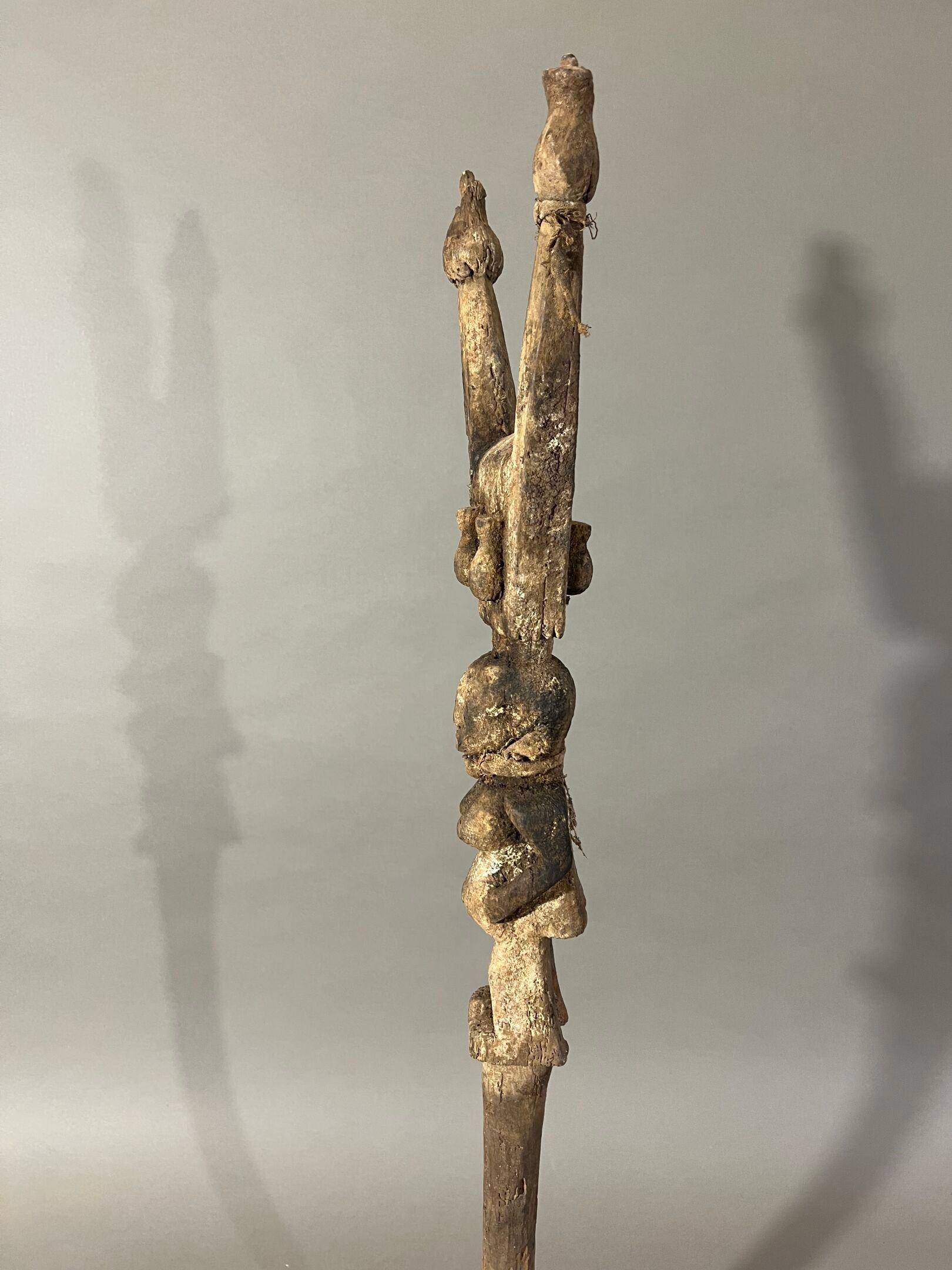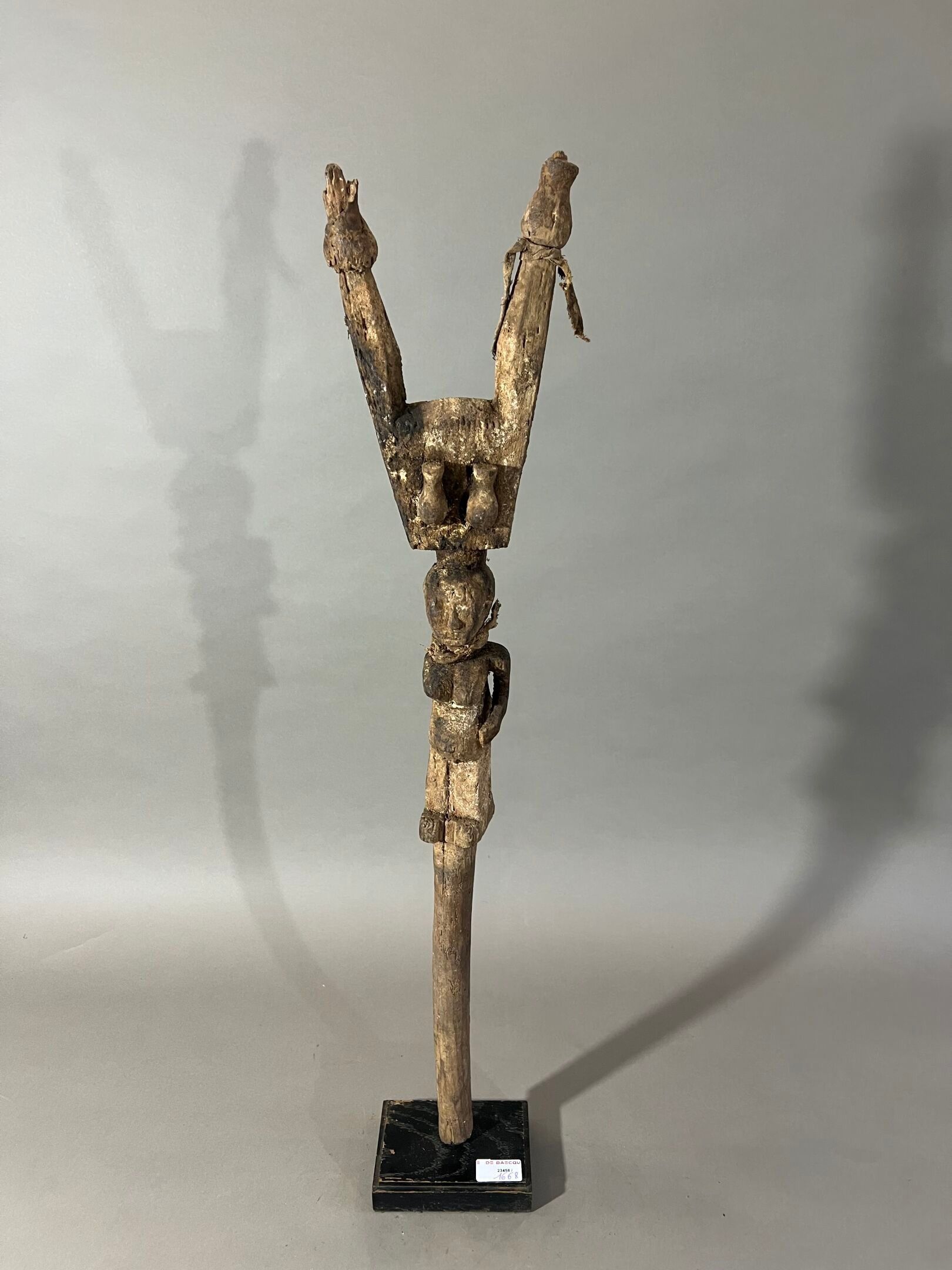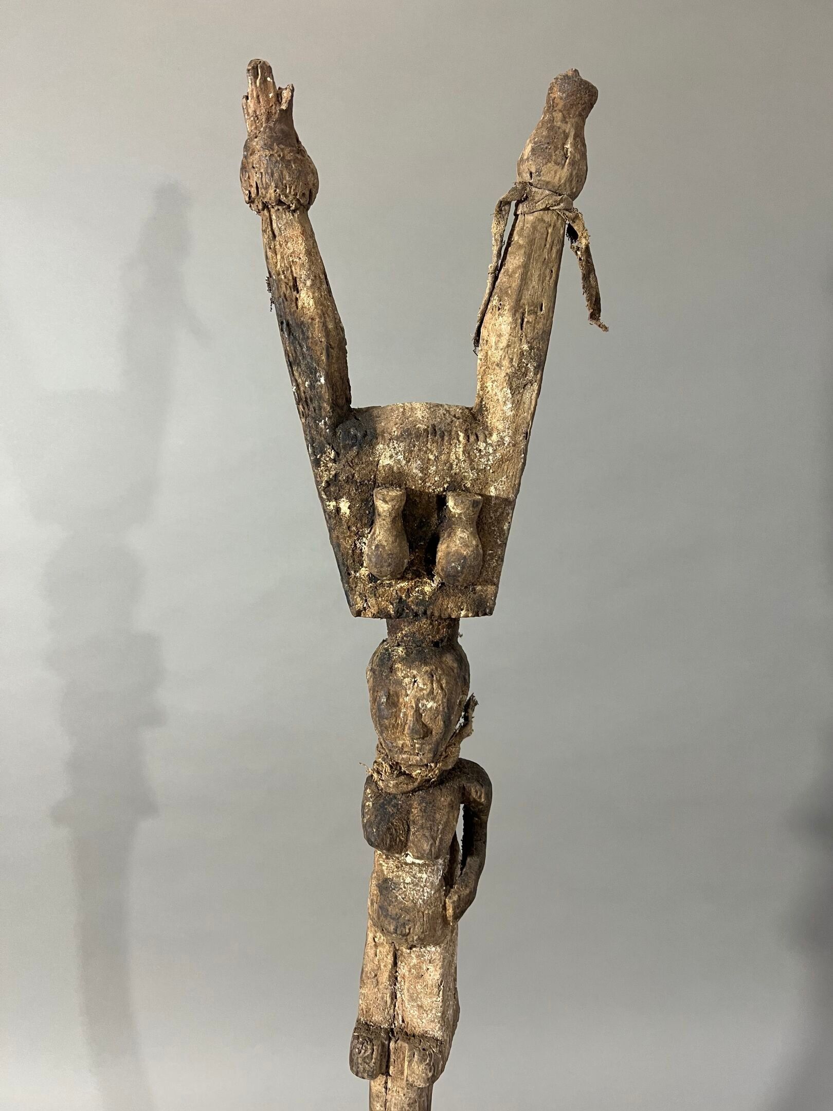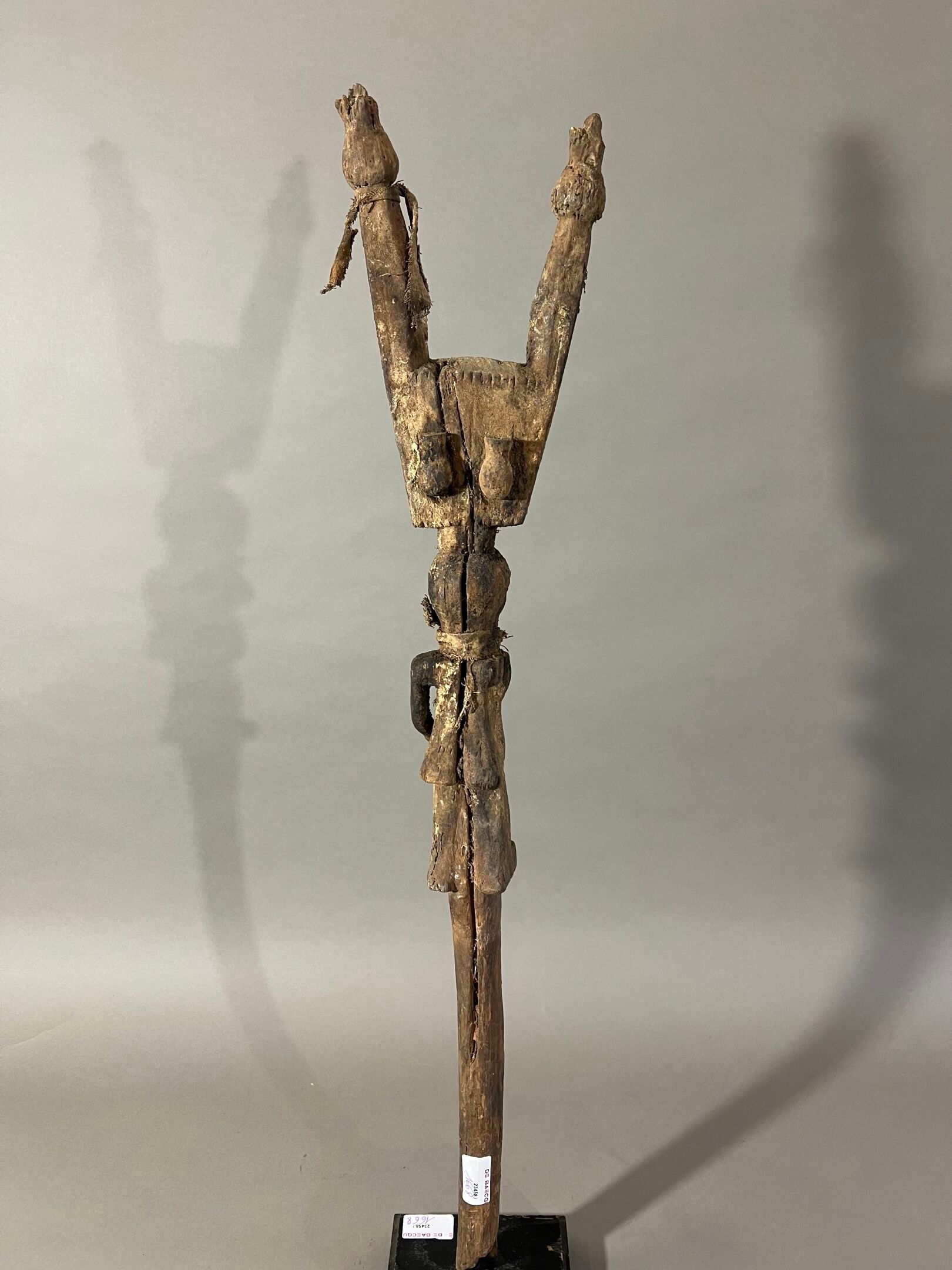 Personnage surmonté d'une fourche ornée sur chaque face de deux calebasses en relief, surmontant un personnage féminin, le cou entouré d'un tissu.