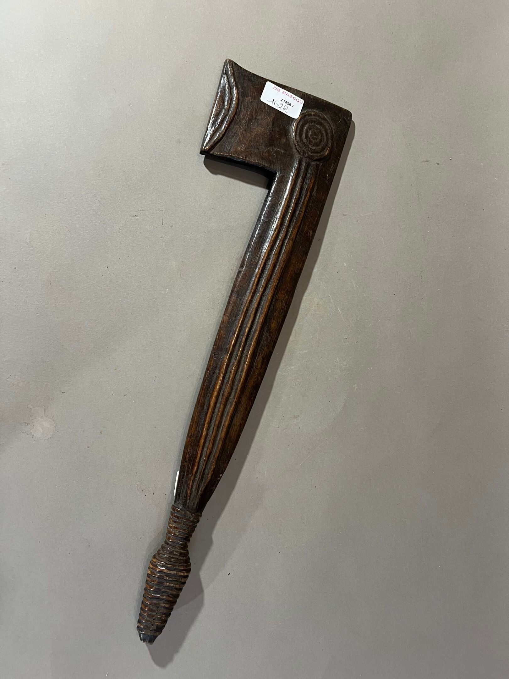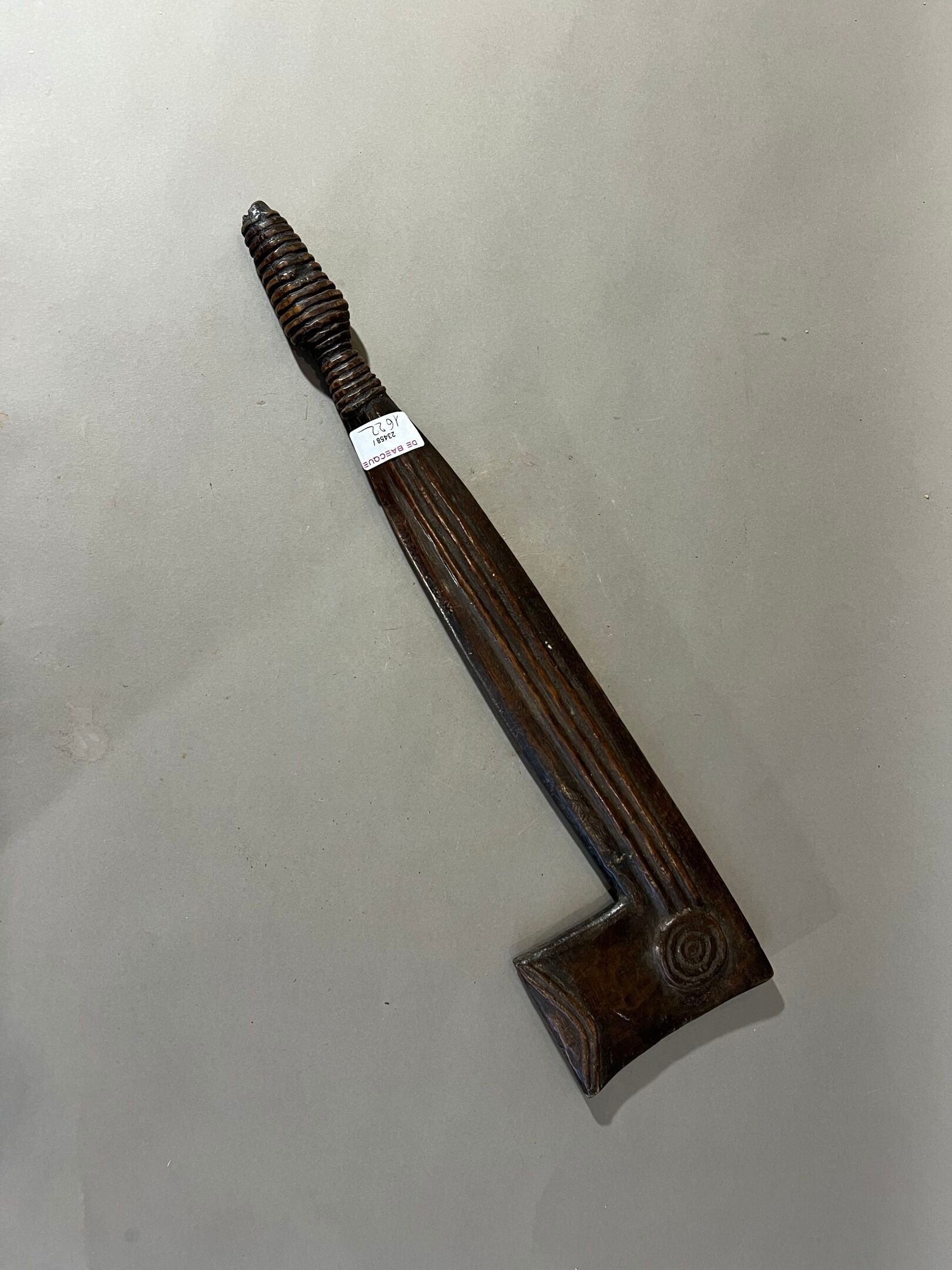 En forme de hache ornée de motifs linéaires et concentriques, la poignée annelée.