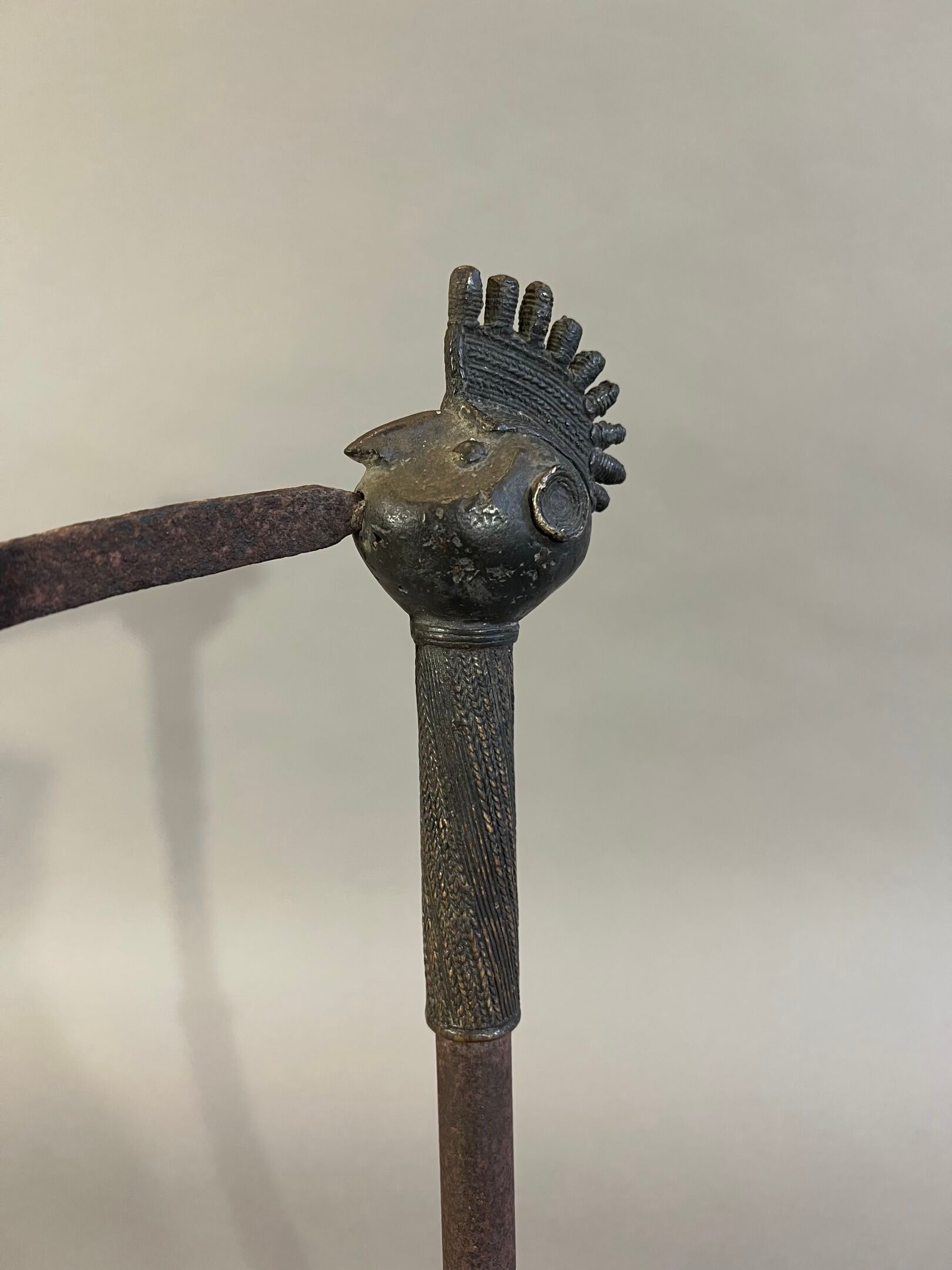 Manche en bronze surmonté d'une tête ronde ornée d'une crête ciselée et ajourée ; de la bouche sort une longue lame courbe en fer ; la base du manche et le cou ornés de motifs finement spiralés.