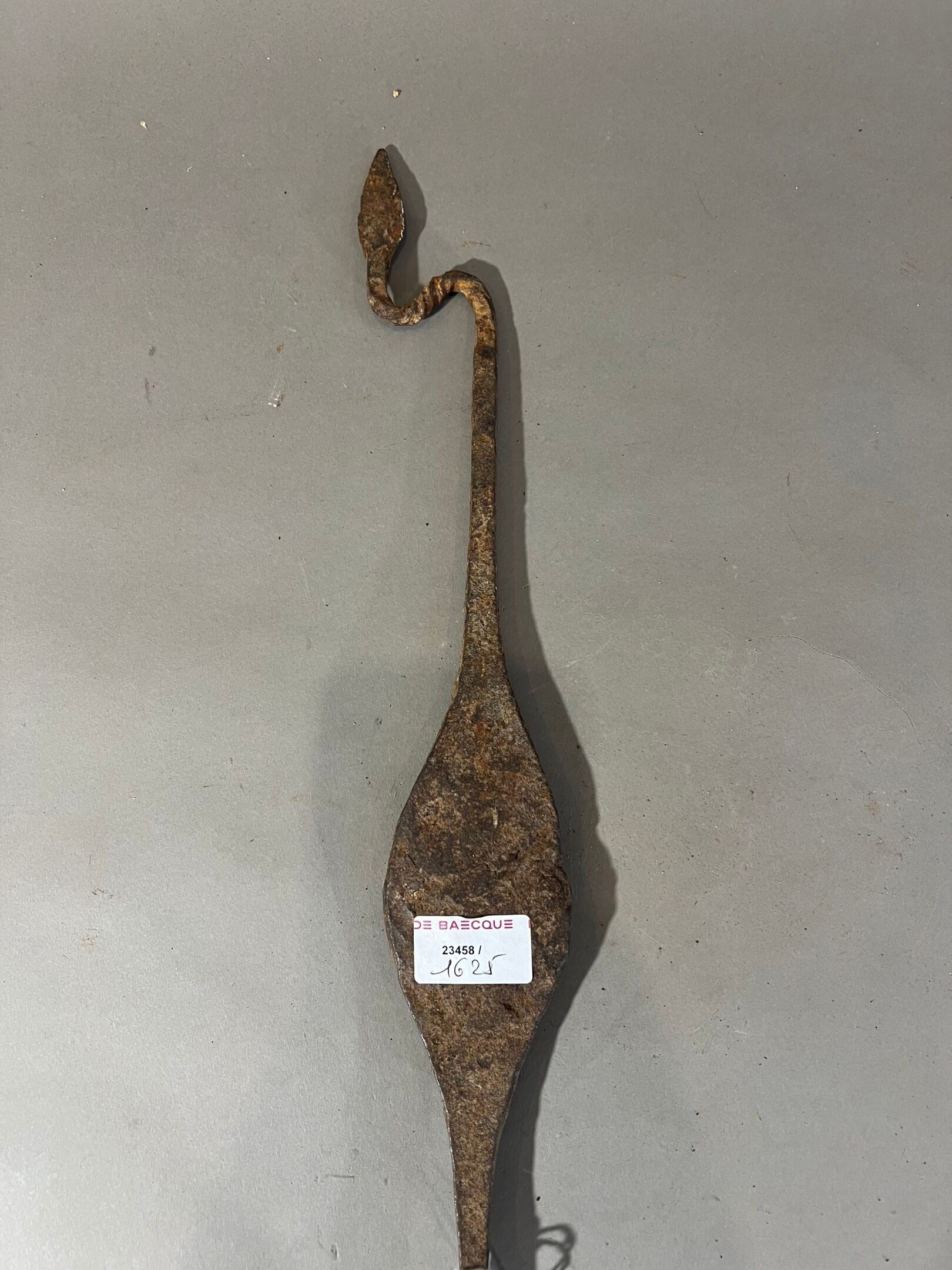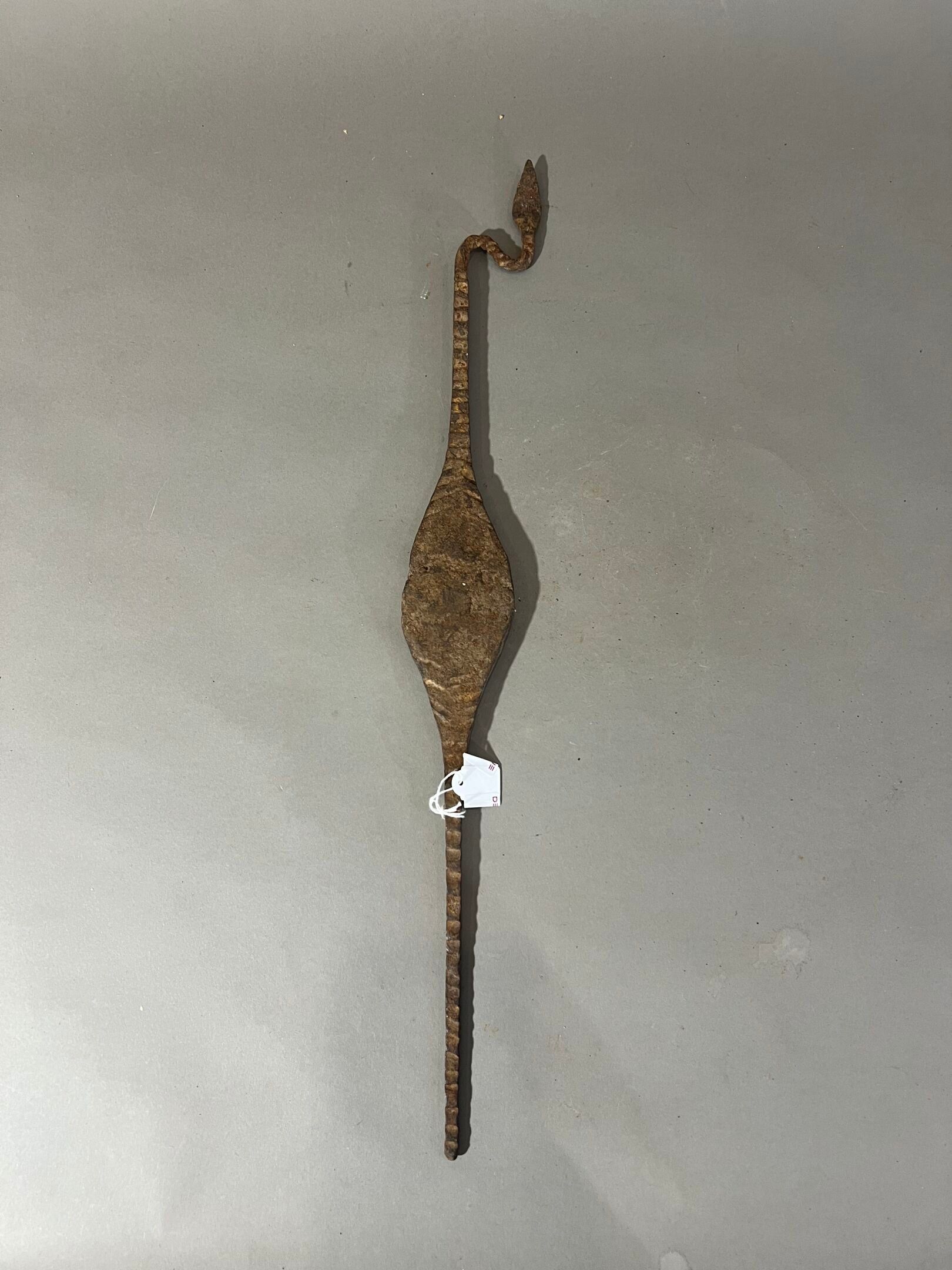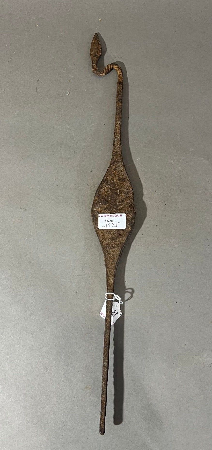 En forme de serpent, renflé en son centre, terminé par une tête triangulaire.