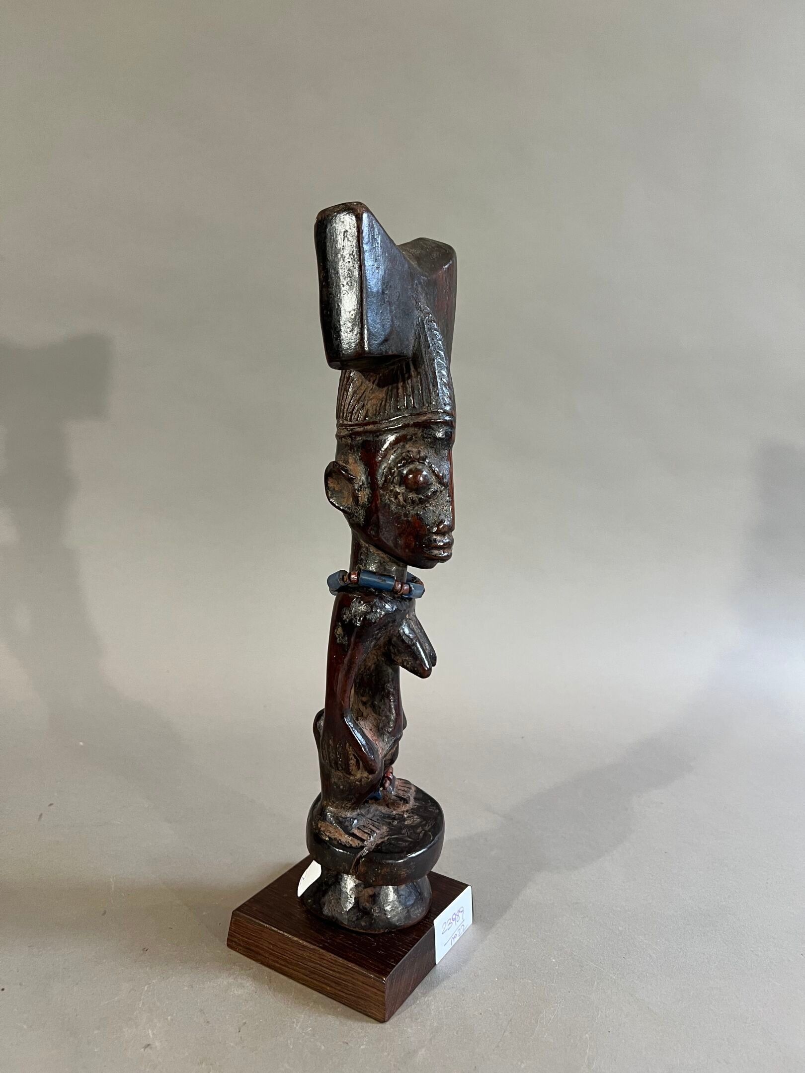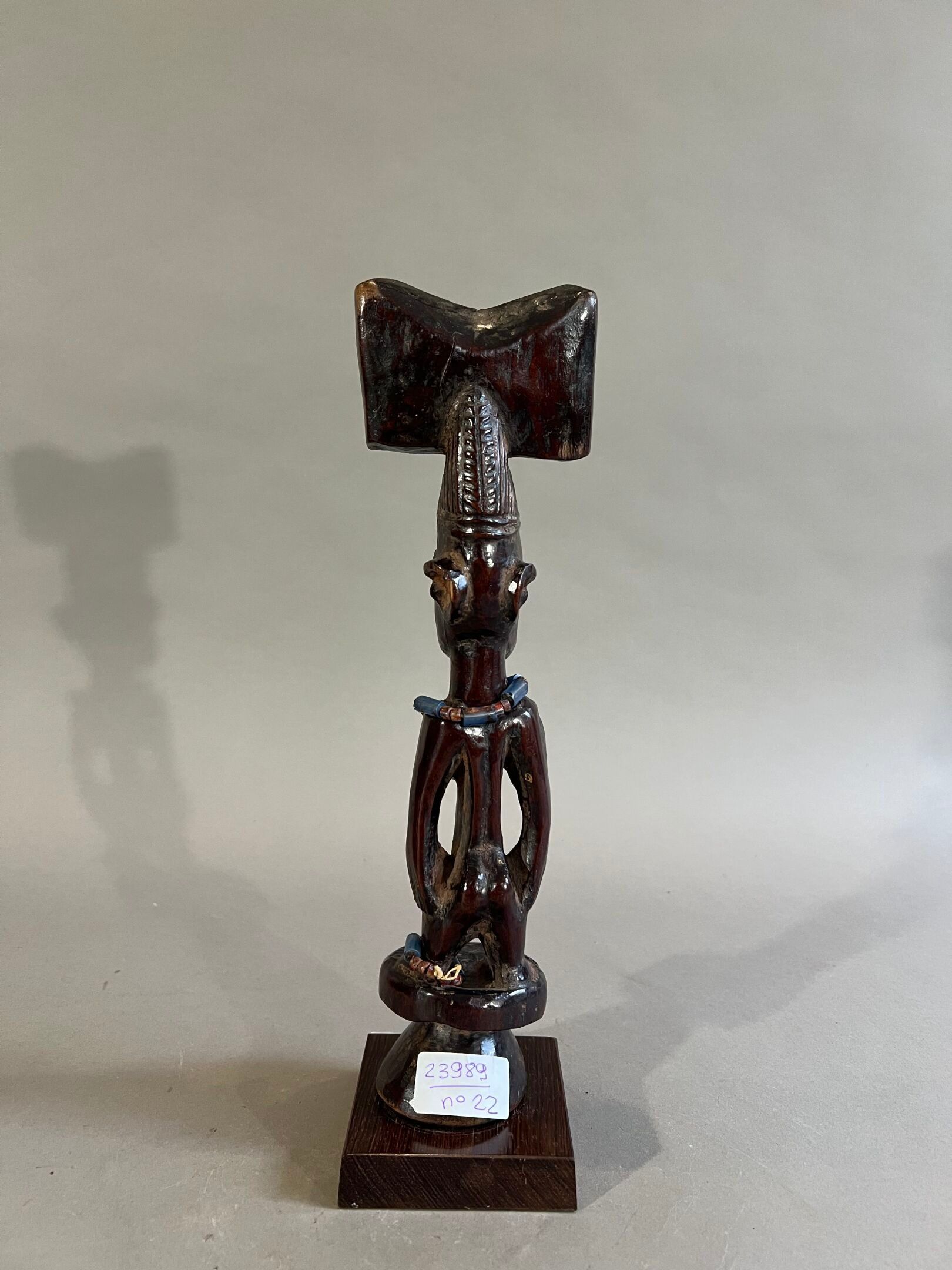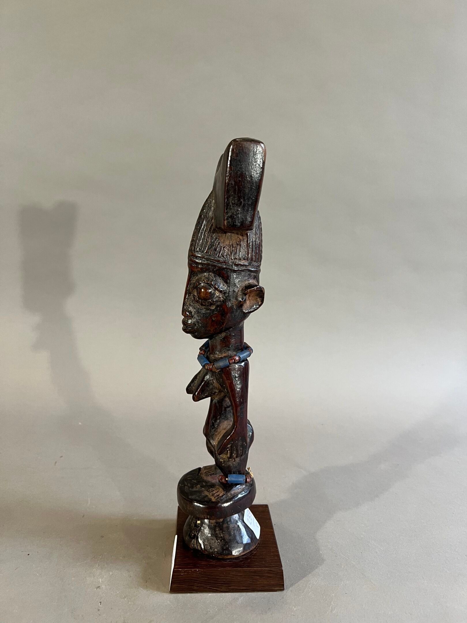 Personnage féminin debout, les bras écartés du corps, les seins proéminents, ramassé sur les jambes ; le visage allongé surmonté d'une coiffe en forme de hache, le cou et une cheville parés de perles de verre.