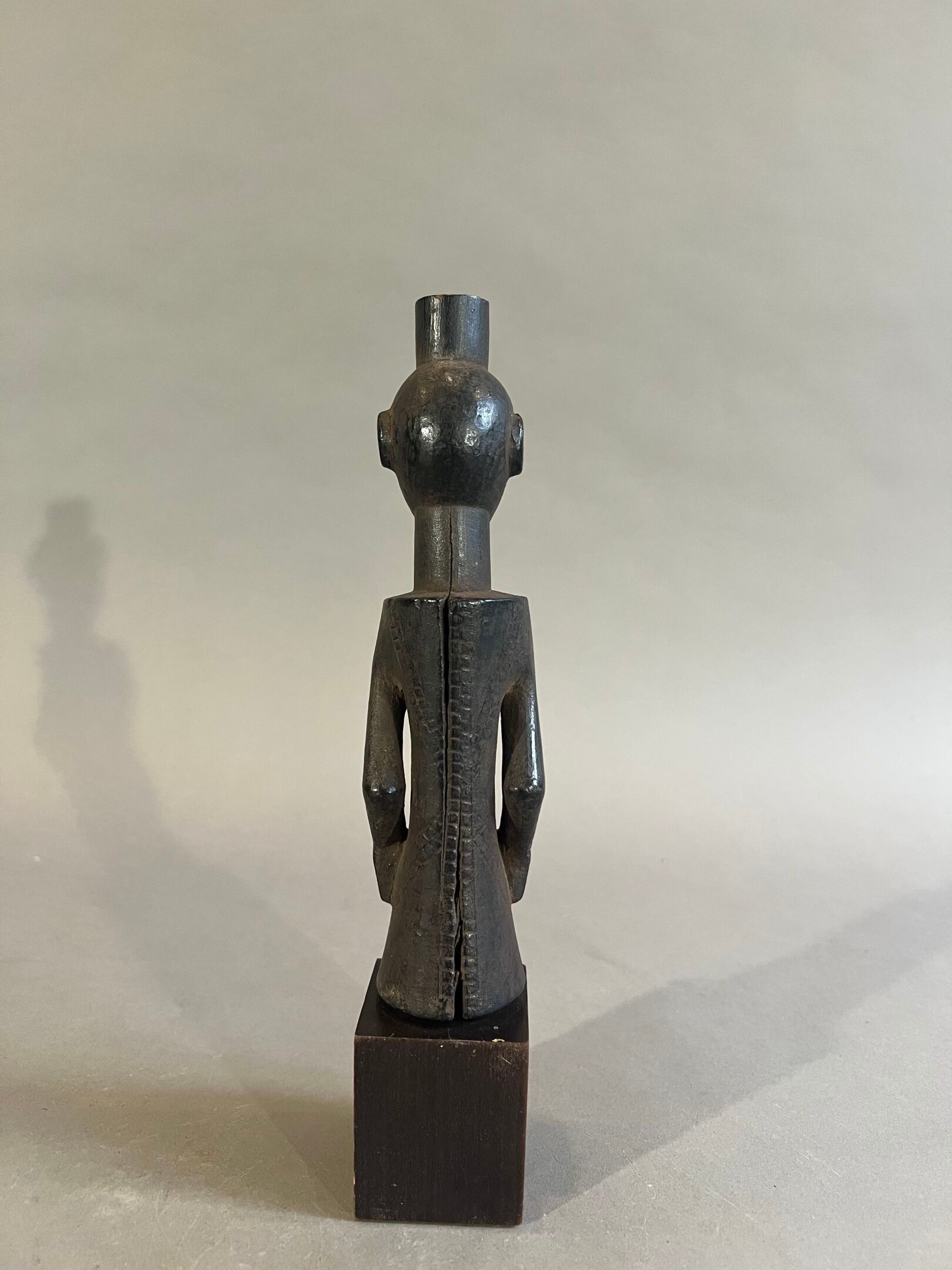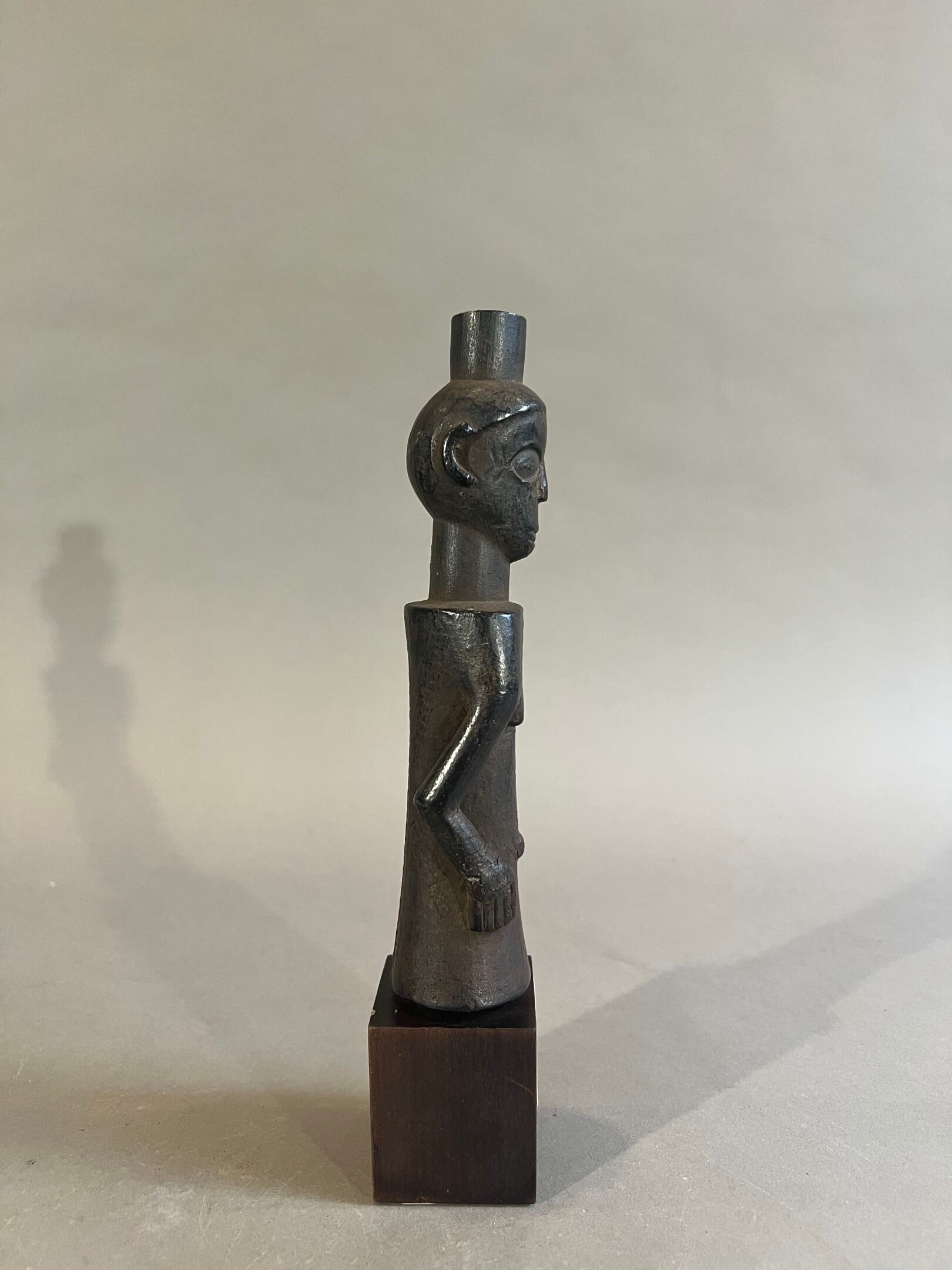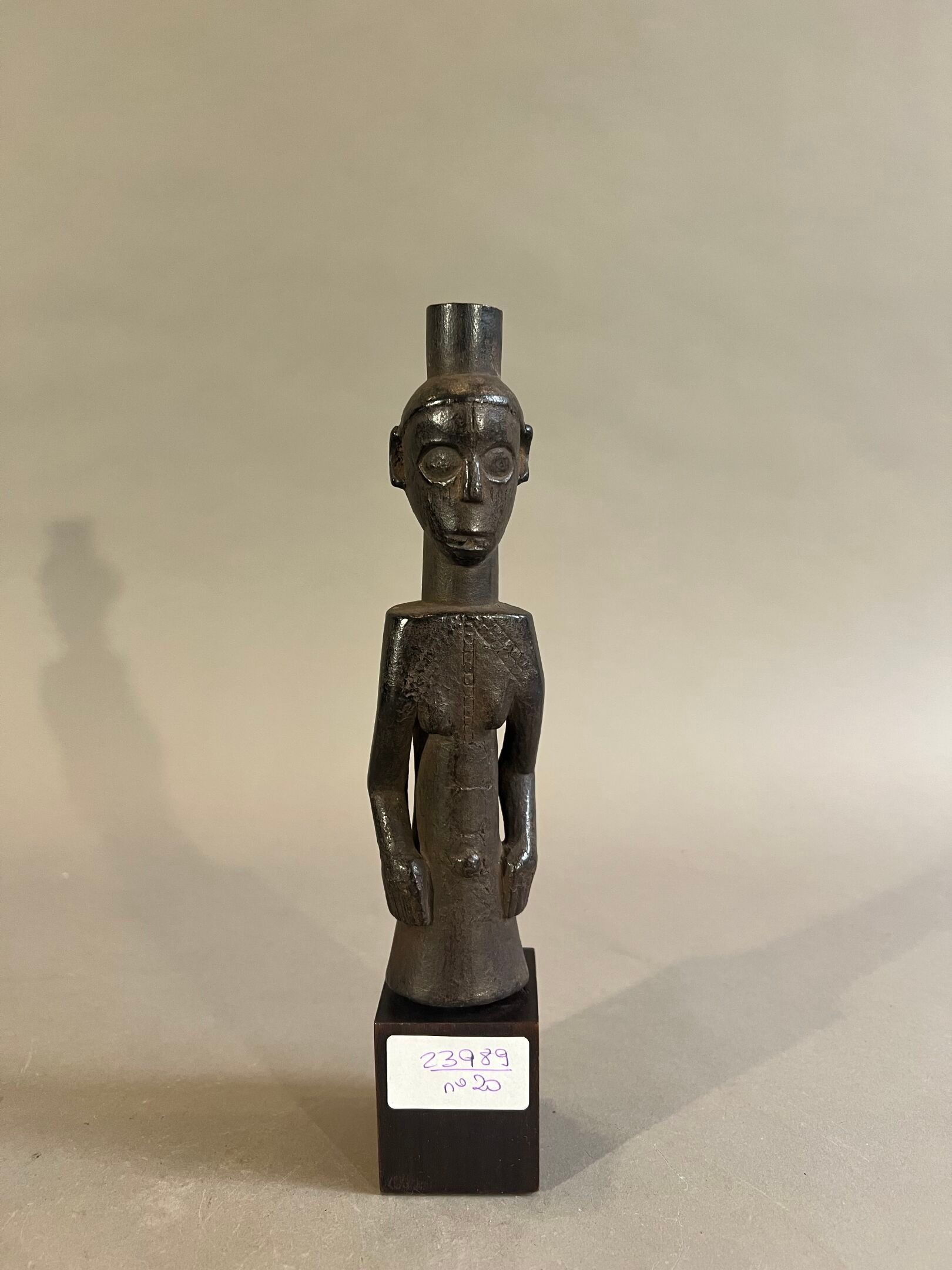 Personnage debout au corps schématisé, les bras écartés du corps, la tête surmontée d'une coiffe en cylindre, les yeux grands écarquillés, les dents apparentent.