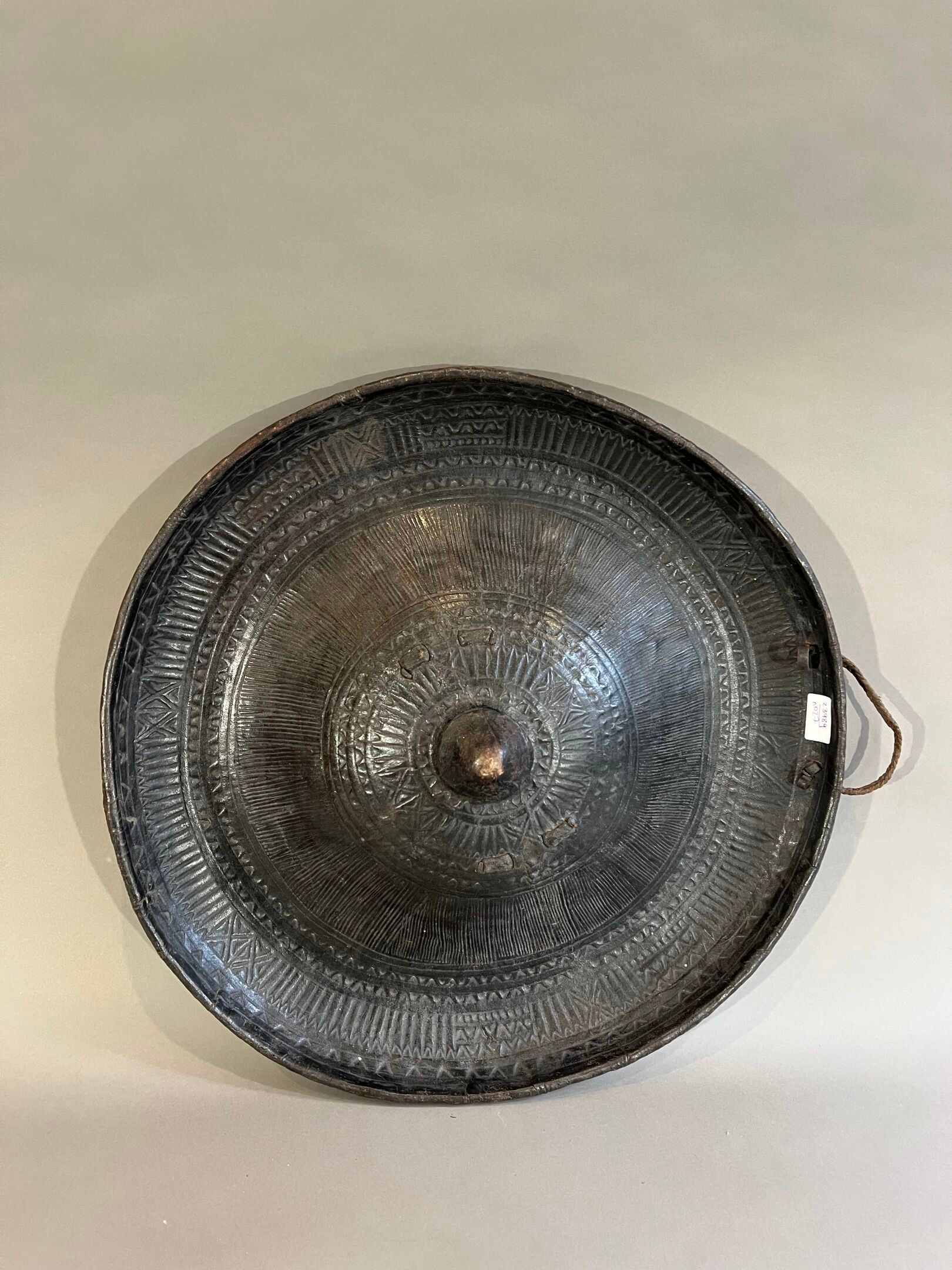 Circulaire, bombé en son centre, évoquant un sein, décoré de riches motifs géométriques ; anse de suspension en cuir tressé et poignée à l'arrière.