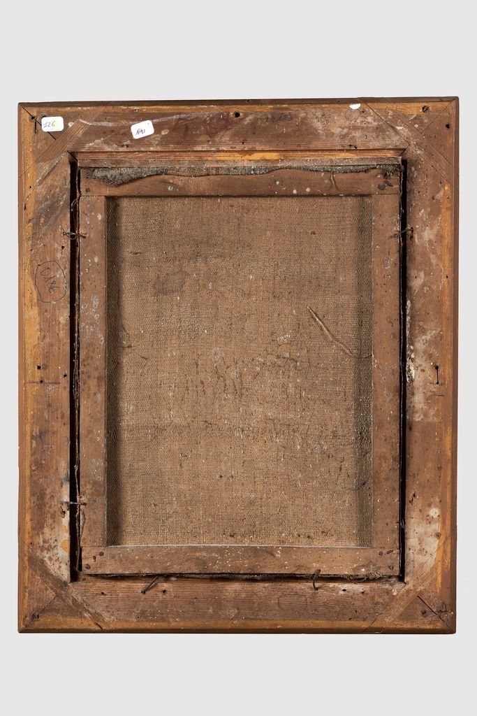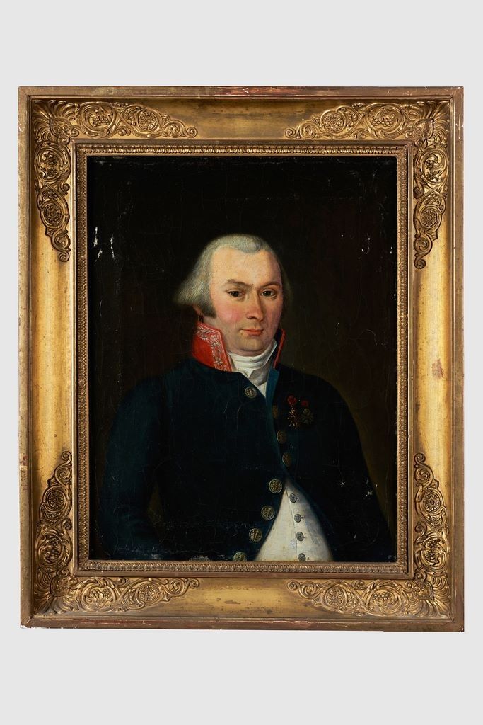 École française « Commissaire des guerres, portant ses décorations » époque Consulat. Huile sur toile. Cadre en bois sculpté, doré. Les décorations ont été peintes sur la toile lors de ses attributions. 34,5 x 27 cm (reverni)