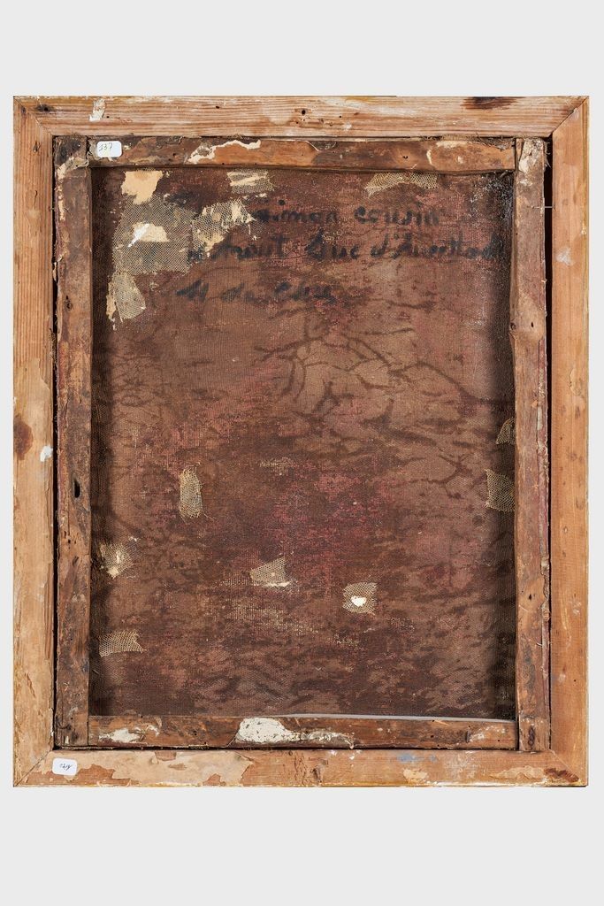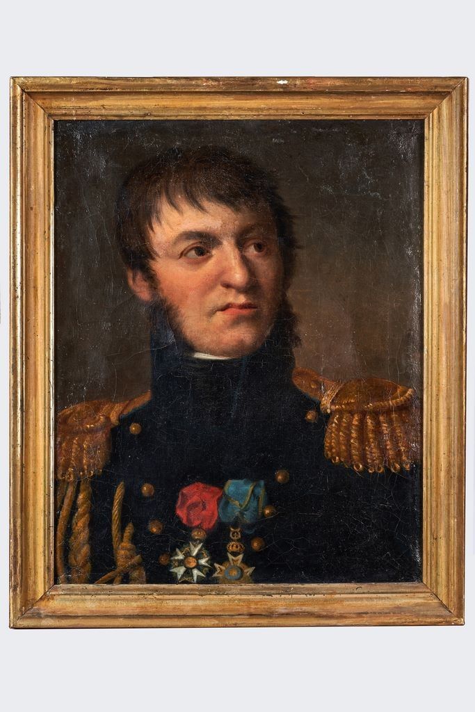 École française « Portrait d’un Officier supérieur, portant l’étoile de la Légion d’honneur et la Croix de l’Ordre militaire de Saint-Henri de Saxe » Huile sur toile, marqué au dos « ...Cousin Davout Duc d’Auerstaedt... » Cadre doré. 46 x 37,5 cm (restaurations)