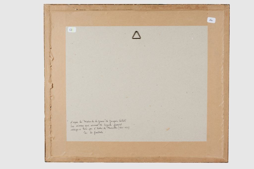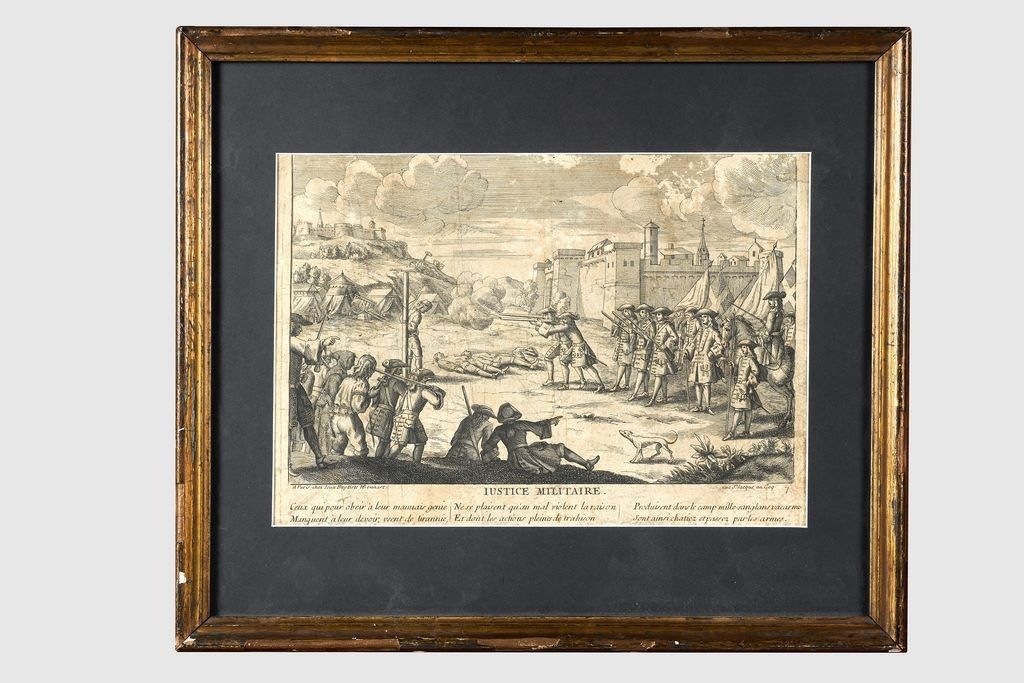 Callot Jacques (d’après) « Justice Militaire » Chez Iean Baptiste Bonnart, rue St Iacques au Coq. D’après les « Misères de la Guerre » de Jacques Callot, Les sixains qui servent de légende seraient rédigés par l’Abbé de Moralles (1600 – 1681). Encadré sous verre. 21,5 x 30,5 cm