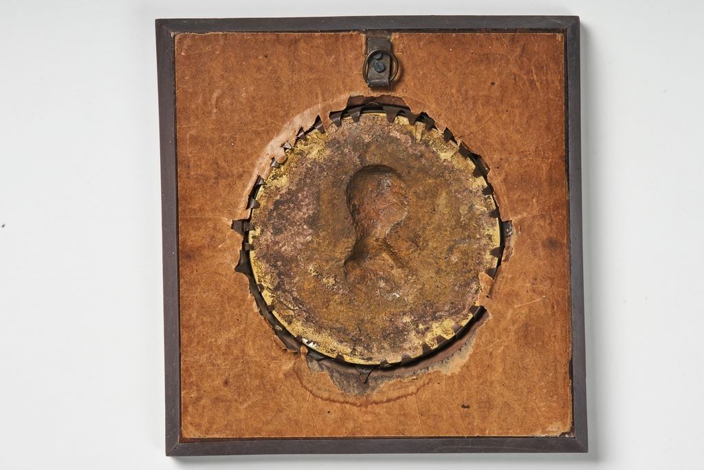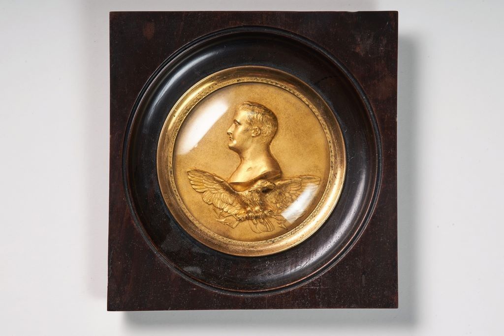 École française du XIXè siècle « Profil de l’Empereur surmontant une aigle » Bronze, doré. Encadré sous verre. BE Ø : 11 cm Cadre : 19 x 18,5 cm