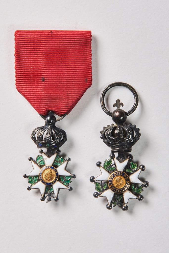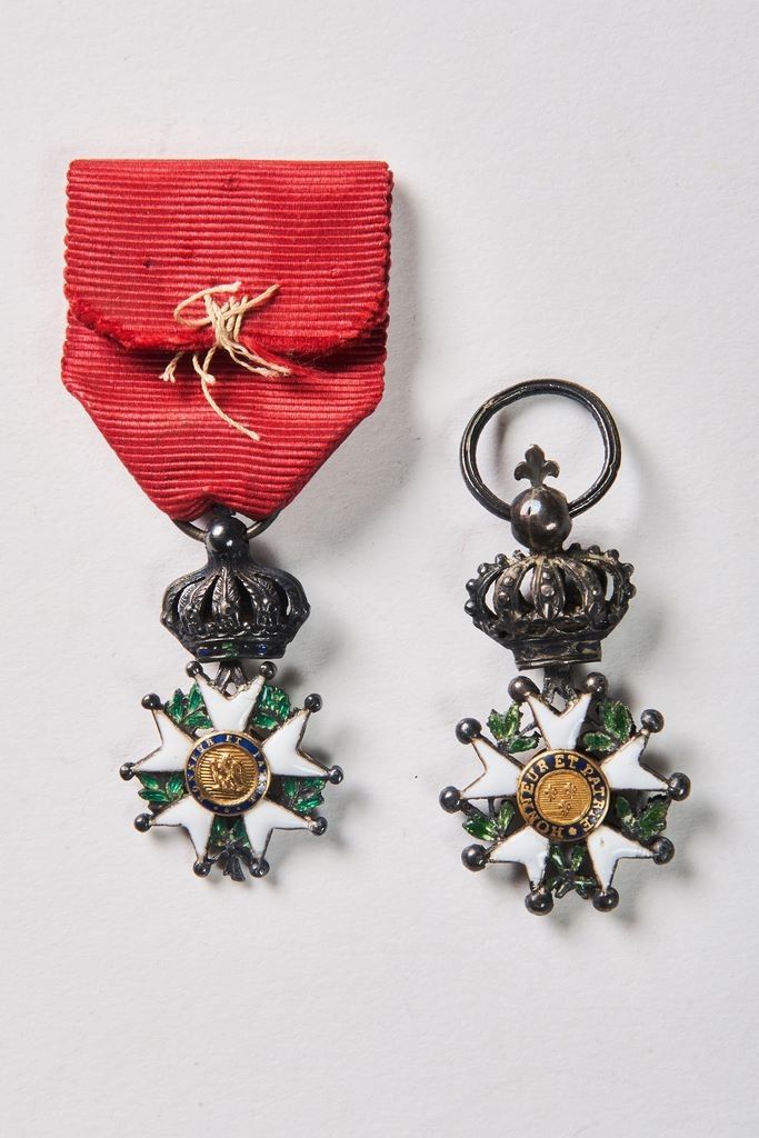 France Ordre de la Légion d’honneur. Lot de 2 étoiles miniatures de Chevalier, d’époque Restauration et Second Empire. Argent, émail (éclats), 1 ruban.