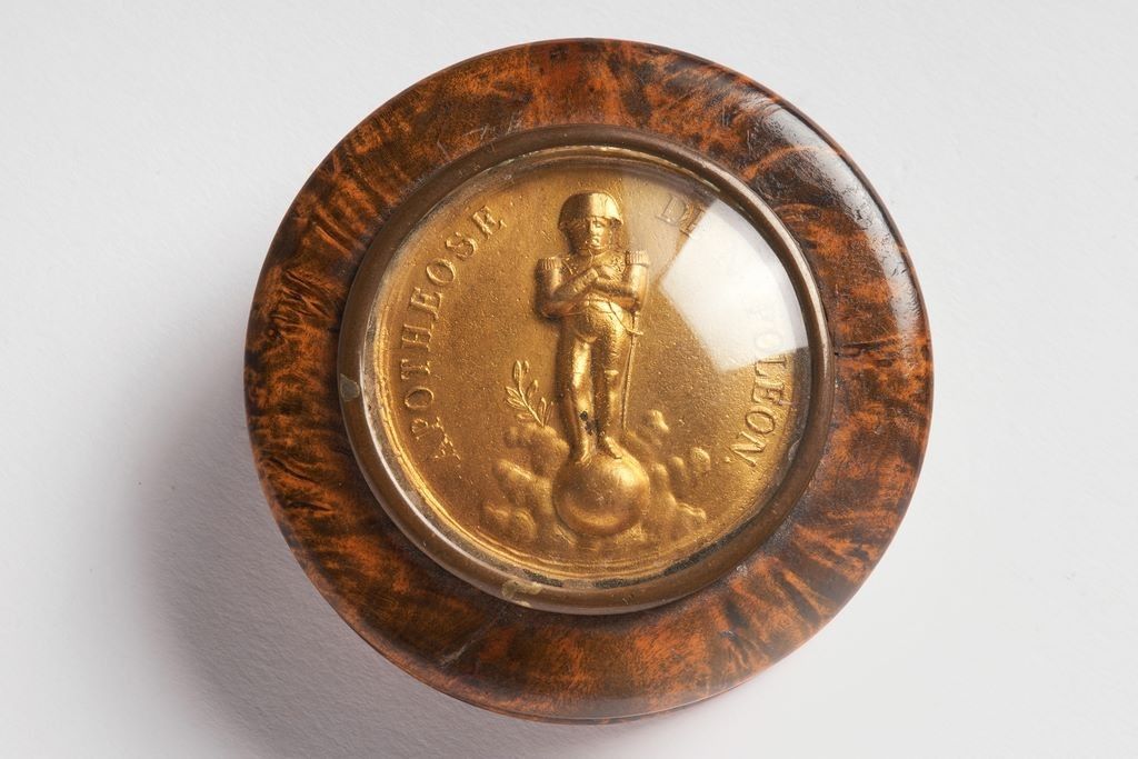 Boite ronde, en loupe, à médaillon rond, doré, à motif de l’Empereur monté sur un boulet, marqué « Apothéose de Napoléon » sous verre bombé. Intérieure en écaille. Ø : 6 cm