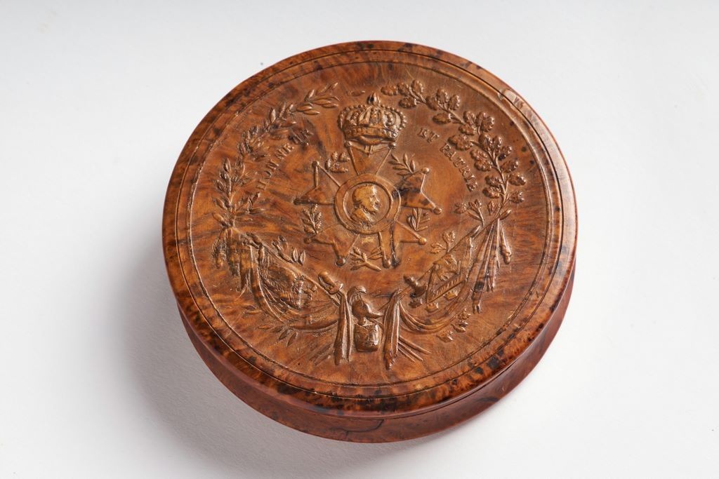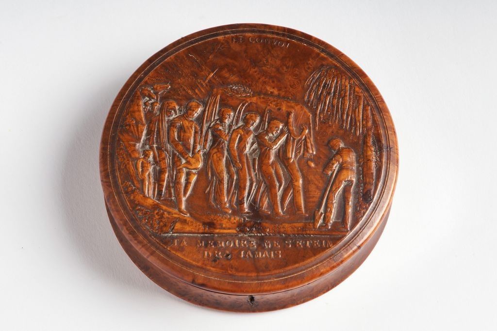 Boite ronde, en buis, décoré en relief. Couvercle à motif « Le Convoi, Ta Mémoire ne s’éteindra jamais » Levée du corps à Sainte-Hélène. Fond à l’étoile de la Légion d’honneur, au profil de Henri IV et lys de la couronne modifiés, marqué « Honneur et Patrie » et entourée d’attributs militaires et feuilles de laurier. Doublé à l’intérieur de corne. Ø : 8,6 cm