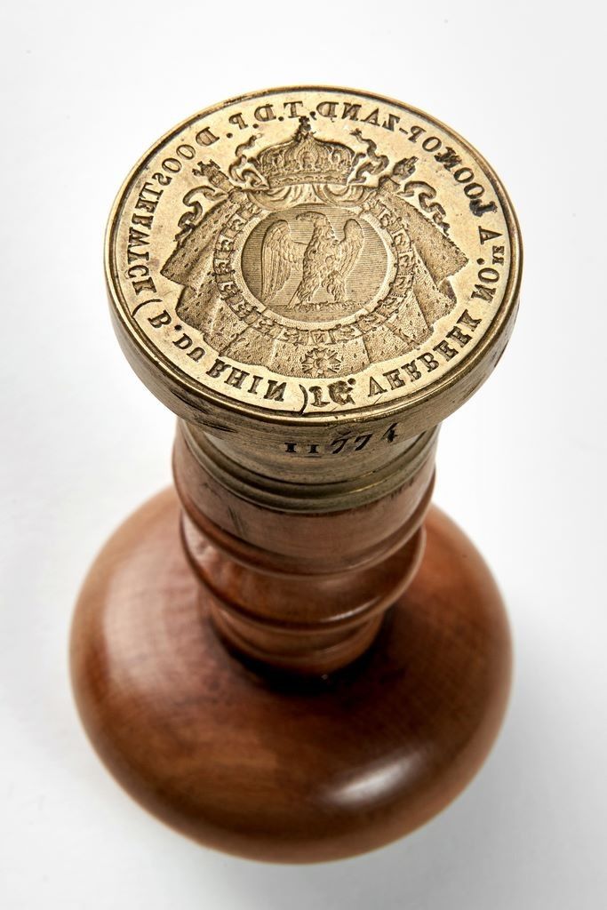Cachet à cire, en laiton. Matrice marquée sur le pourtour « 1e. Verbeek Nore A Loon op-Zand T.D.P. D’Oosterwyck (B. du Rhin) », motif central aux Grandes Armes impériales. Manche en bois tourné. BE époque 1er Empire