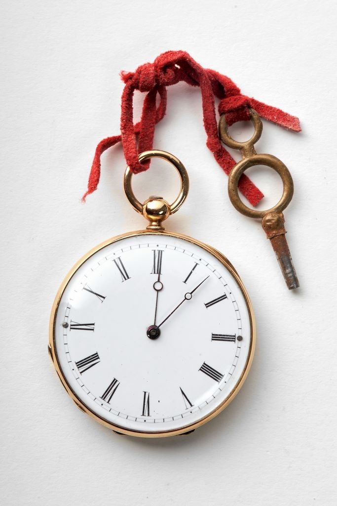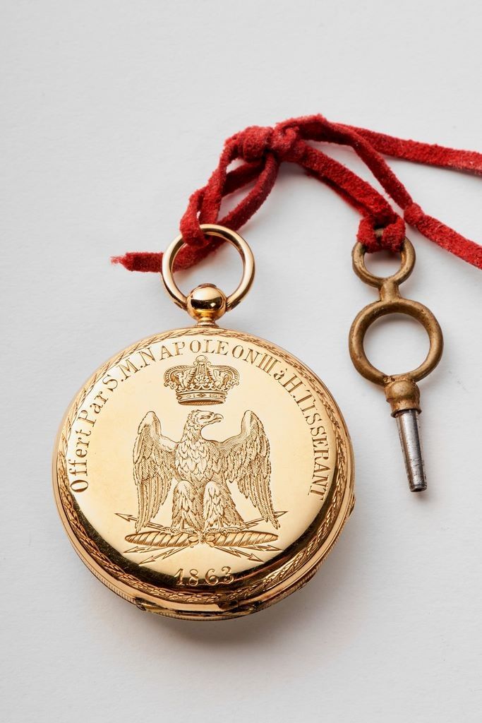 Czapek & Cie à Genève. Montre de poche, en or. Couvercle marqué sur le pourtour « Offert Par S.M. Napoléon III à H. Tisserant, 1863 », motif central de l’aigle impériale sous couronne. Cadran en émail blanc, index bâtons, chemin de fer et chiffres romains noirs. Aiguilles droites bleuies. Double-cuvette gravée « N4754, Échappement à cylindre, huit trous en rubis », « Czapek & Cie à Genève ». Mouvement mécanique à remontage manuel signé « Czapek & Cie à Genève. N°4757 Ø : 3,8 cm Poids brut : ????g. Avec clé à remonter.