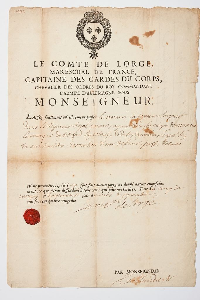 Louis XIV, Aux Invalides, Mengen, de Lorge « Le Comte de Lorge, Mareschal de France, Capitaine des Gardes du Corps, Chevalier des Ordres du Roy, Commandant l’Armée d’Allemagne Souls Monseigneur » Laissez feulement & librement paffer le nommé Claude Fagot dit La Carrière Sergent dans le Régiment Royal contois, ayant eu les congés de Monsieur le Marquis de Bellefond Son colonel, Es de la compagnie, Lequel sen Va aux Invalides… Fait au Camp de Mengen, ce Vingtième jour du mois de septembre mil fix cent quatre vingt dix. Signature du Maréchal de Lorge, cachet à la cire rouge. Vignette aux Armes de France. Au dos, manuscrit « Du 10 octobre 1690, Claude fagot dit La Carrière, Décédé ». 36 x 24,5 cm (rousseurs)