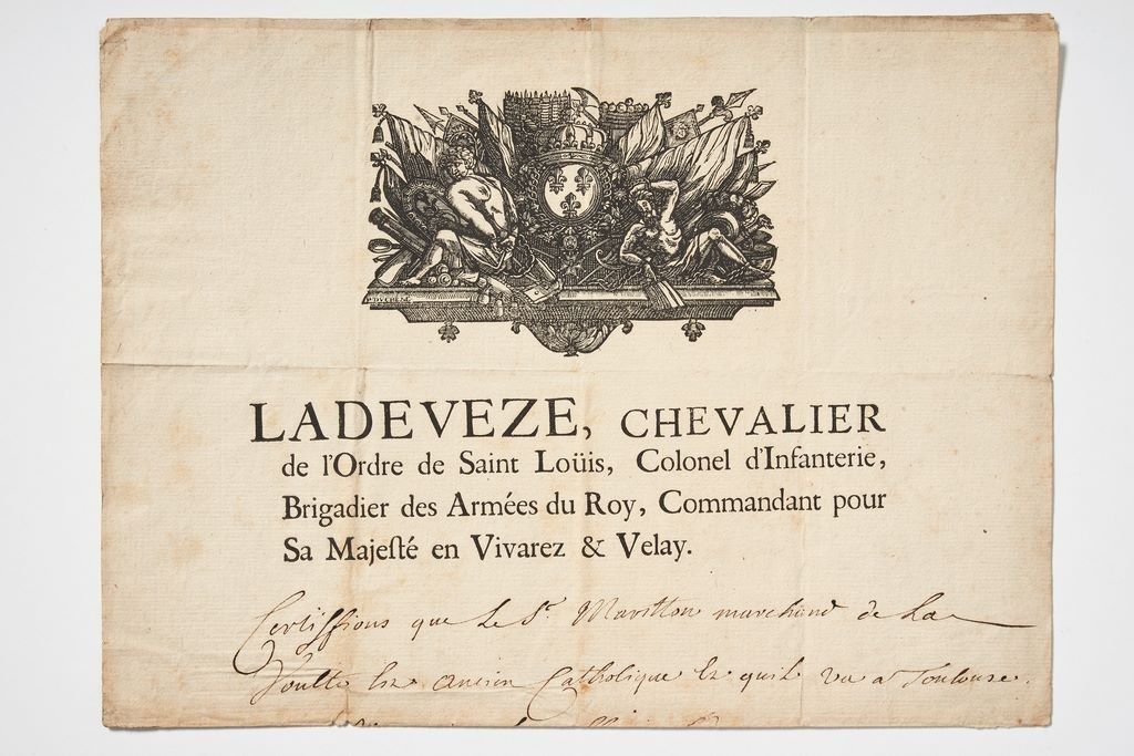 Louis XV, Tournon « Ledeveze, Chevalier de l’Ordre de Saint Loüis, Colonel d’Infanterie, Brigadier des Armées du Roy, Commandant pour Sa Majefté en Vivarez & Velayé » Certififfions que Le Sr Monthon marchand de la Voulte en Ancien Catholique Es qu’il va à Toulouse pour vasquer à ses affaires. Fait à Tournon Ce 30è Janvier 1733. Signature. Vignette aux armes de France, entourées d’attributs militaires. 42 x 28,5 cm (rousseurs)