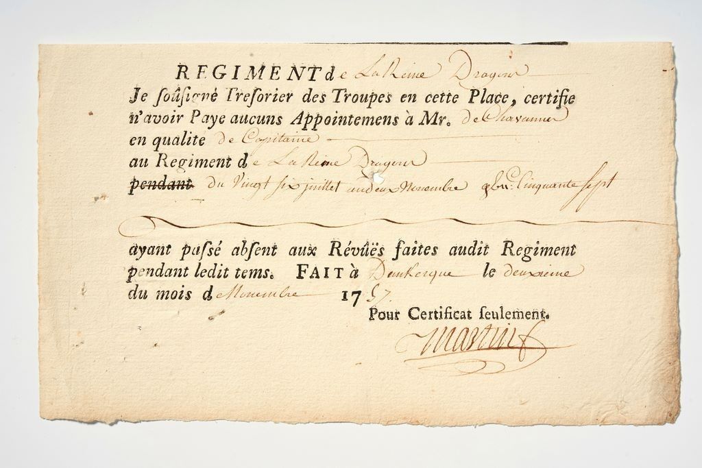 Louis XV, Dunkerque « Régiment de La Reine Dragon » Certificat de non payement d’Appointemens à Mr de Chavannes, en qualité de Capitaine au Régiment de de La Reine Dragons, ayant pafsé abfent au Révûës faites audit Régiment. Fait à Dunkerque, le Deuxième du mois de Novembre 1757. Signature. 12,5 x 20,5 cm