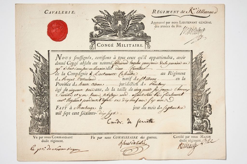 Louis XVI, Maubeuge « Cavalerie, Régiment de Ral Allemand » Congé Militaire abfolu, au nom de Ferdinand Vageleu dit idem Cavalier de la Compagnie Lieutenante Colonelle au Régiment de Royal Allemand, natif de St Ursou (?). Fait à Maubeuge le jour du mois de Feptembre mil fept cent soixante-dix fept. Signatures, cachet à la cire rouge. Vignette aux Armes de France, sur attributs militaires. 22 x 29