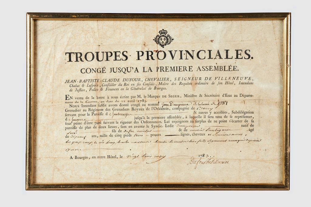 Louis XVI, Bourges « Troupes provinciales » Congé jusqu’à la première assemblée, au nom de Jean Dampierre de la levée de 1781, Grenadier au Régiment des Grenadiers Royaux de l’Orléanois, compagnie de Berry. À Bourges, en notre Hôtel, le vingt trois may 1783. Signé Dufour de Villeneuve. Vignette au Armes de France. Encadré sous verre. 23 x 35 cm (rousseurs)