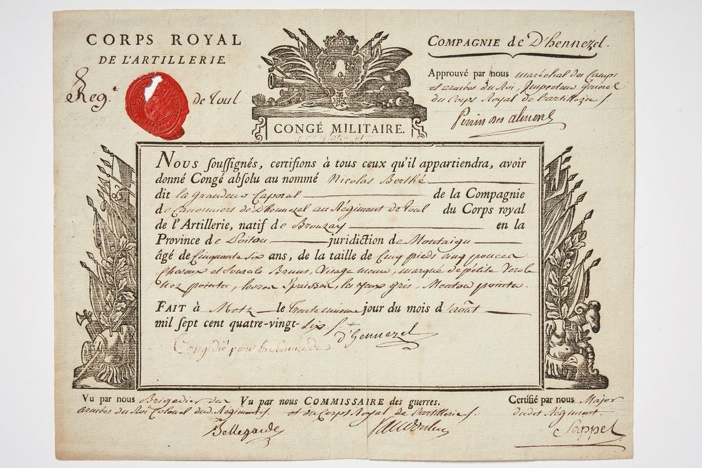 Louis XVI, Metz « Corps Royal de l’Artillerie, Regt de Toul, Compagnie de d’Hennezet » Congé Militaire abfolu, au nom de Nicolas Berthé dit la grandeur Caporal de la Compagnie de Canonniers de d’Hennezet au Régiment de Toul du Corps royal de l’Artillerie, natif de Brouzay. Fait à Metz le Trente Unième jour du mois d’Août mil fept cent quatre-vingt six. Signatures, cachet à la cire rouge. Vignette aux Armes de France sur attributs militaires. 22 x 28,5 cm (petit trou au niveau du cachet)