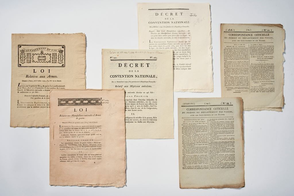Monarchie Constitutionnelle, Loi relative aux Armes et aux Manufactures d’armes nationales : Donnée à Paris, le 8 juillet 1792, l’an Ivè de la Liberté, relative aux Armes, descriptions des fusils avec sa fabrication ; Donné à Paris, le 19 Août 1792, l’an Ivè de la Liberté, Relative aux Manufactures nationales d’Armes de guerre ; du 9 Octobre 1792, l’an premier de la République Françoife, Rappel, dans leurs Manufactures refpectives, des Ouvirers des Manufactures d’armes nationales, qui ont quitté leurs ateliers pour servir dans la Ligne, ou dans les Gardes nationales, ou la Gendarmerie. On joint le Décret de la Convention nationale du 11 Novembre 1792, Relatif aux Hôpitaux ambulans, et 2 Correspondance Officielle du Préfet du Département des Vosges, n°21 et 33 de 1816.