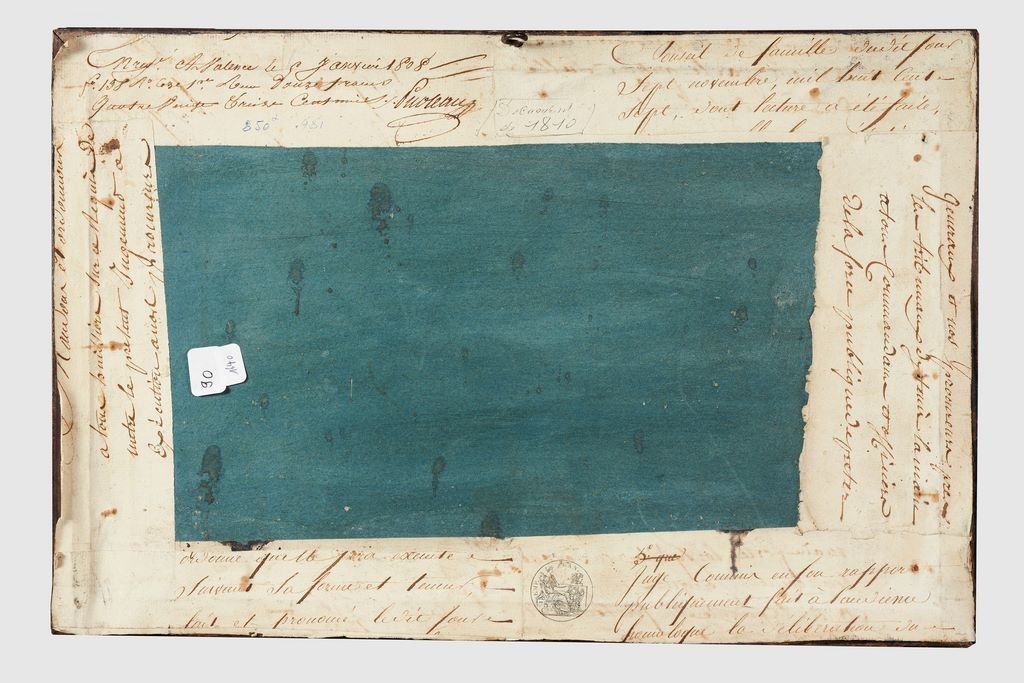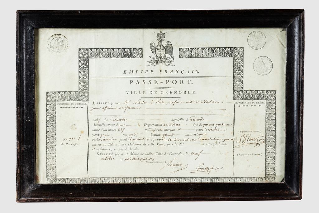 « Empire Français, Passe-Port. Ville de Grenoble » Au nom de Mr Nicolas St Pierre, orfèvre Allant à Valence pour affaire de famille. Délivré par nous, Maire de ladite Ville de Grenoble, le Neuf octobre an Mil huit cent Six. Signatures et cachets secs et à l’encre. Vignette à l’aigle impériale. Encadré sous verre. 23 x 37 cm