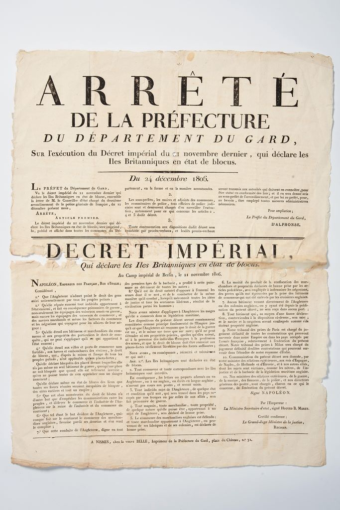 Empire « Arrêté de la Préfecture du Département du Gard » Affiche imprimée du 24 décembre 1806, sur l’exécution du Décret impérial du 21 novembre dernier, qui déclare les Îles Britanniques en état de blocus. À Nismes, chez la veuve Belle, Imprimeur de la Préfecture du Gard, place du Château, n°32. 54 x 41,5 cm