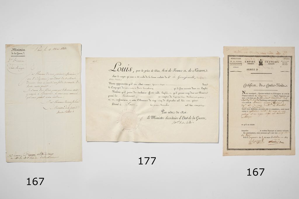 Empire, Bayonne, Clarke Souvenirs de Lecaron (Toussaint) Cap Aide de Camp de Mr le Mal duc de Dalmatie : « Ministère de la Guerre, Inspection Générale, Empire Français » Certificat de Contre-Visite, l’ayant trouvé atteint d’Ophtalme rebelle qui exige un repos prolongé et un régime soigné avec traitement méthodique. Fait à Bayonne, le 2 du mois d’Octobre 1811. Signatures, Vignette à l’aigle couronnée ; « Ministère de la Guerre, 2è Division, État-major » Lettre manuscrite du Ministre de la Guerre le Duc de Feltre, que l’Empereur lui a accordé une solde de retraite de Huit cents francs. Paris, le 3 Mai 1813. Signée Duc de Feltre.