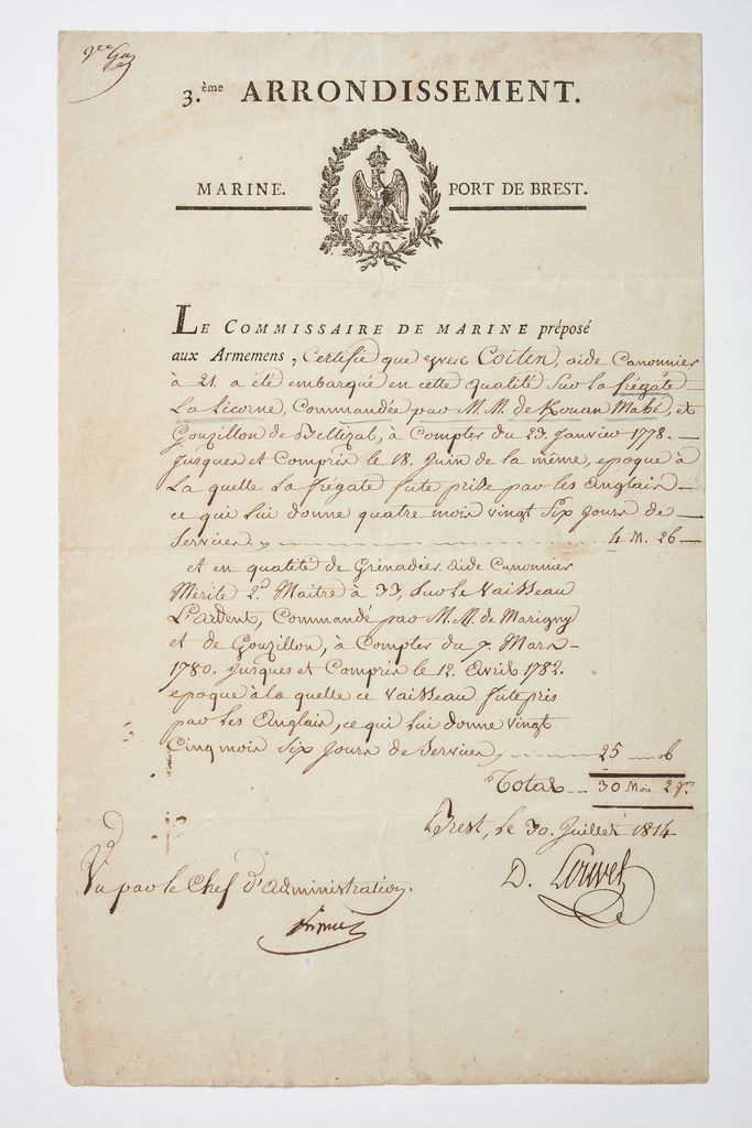 Première Restauration, Brest « 3ème Arrondissement. Marine, Port de Brest » Certificat au nom Coitin, aide Canonnier à 21, a été embarqué en cette qualité sur la frégate La Licorne, commandée par M.M. de KouanMahé et Gouzillon de Bellezal, à compter du 23 Janvier 1778 jusquen et compris le 18 juin de la même époque, à la quelle la frégate fute prise par les Anglais. Brest, le 30 Juillet 1814. Signature. Vignette à l’aigle couronnée dans une couronne de laurier. Signatures. 31 x 19 cm