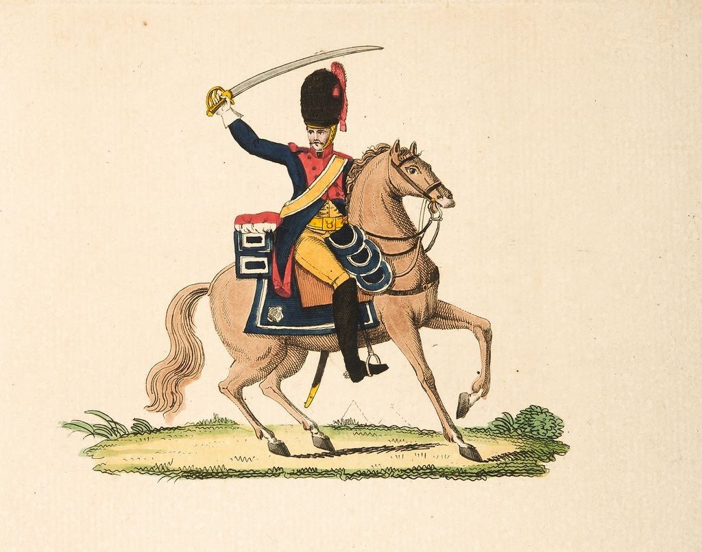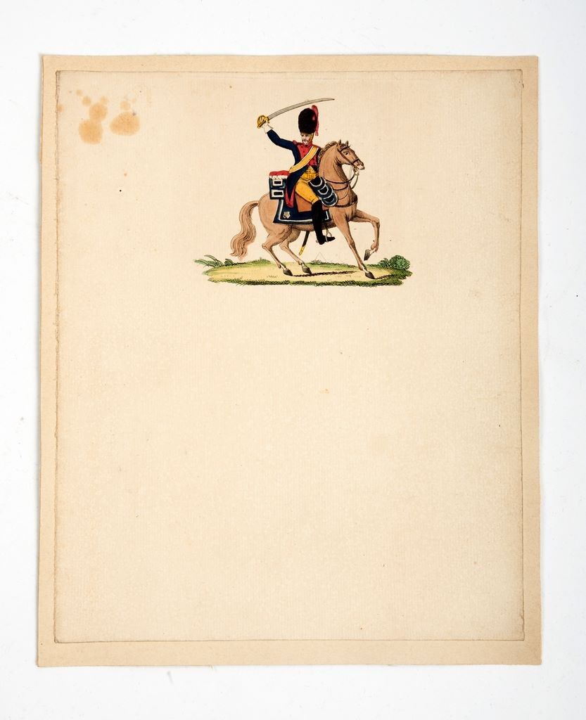 Papier à lettre vierge, avec vignette imprimé et aquarellée d’un Gendarme à cheval, sabre au clair. Contre-collé sur carton. Époque Restauration/Louis-Philippe 23 x 19 cm (taches)